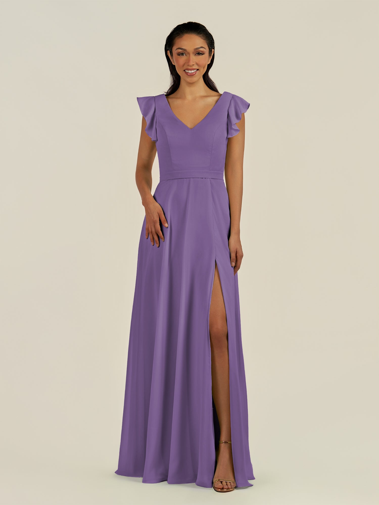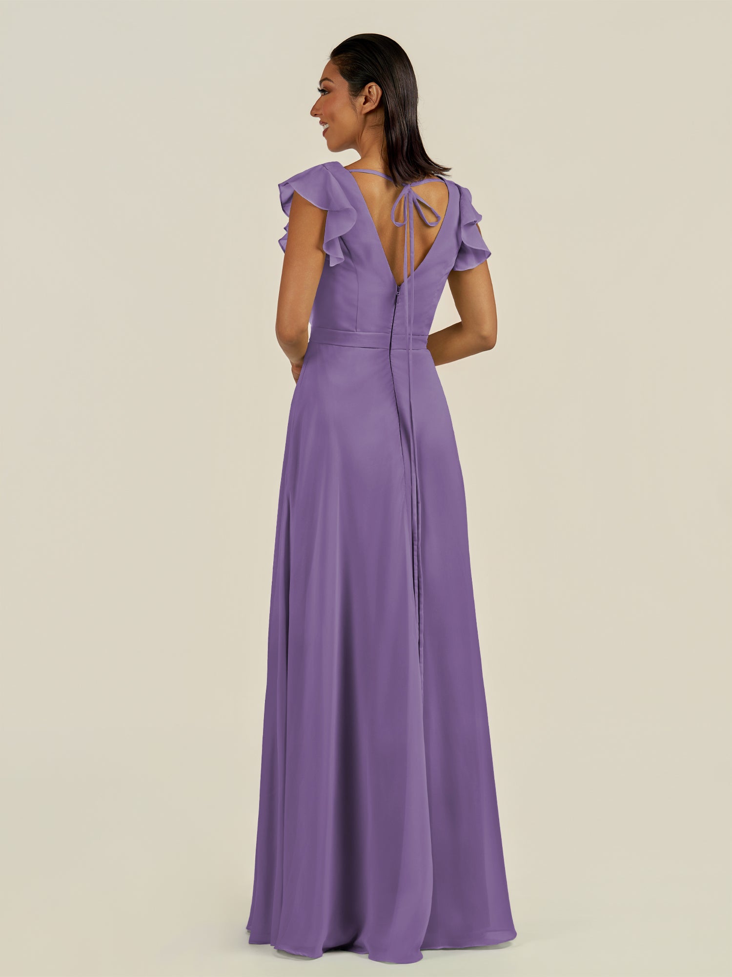 Orlina is a vision of delicate elegance and modern romance. Made from soft chiffon, she features a deep V-neckline and cap sleeves with flutter details that add a whimsical touch. Her floor-length A-line skirt flows gracefully, enhanced by side slit, while the tie-back closure provides a customizable, flattering fit. Orlina is perfect for bridesmaids seeking a light, airy, and sophisticated silhoue.