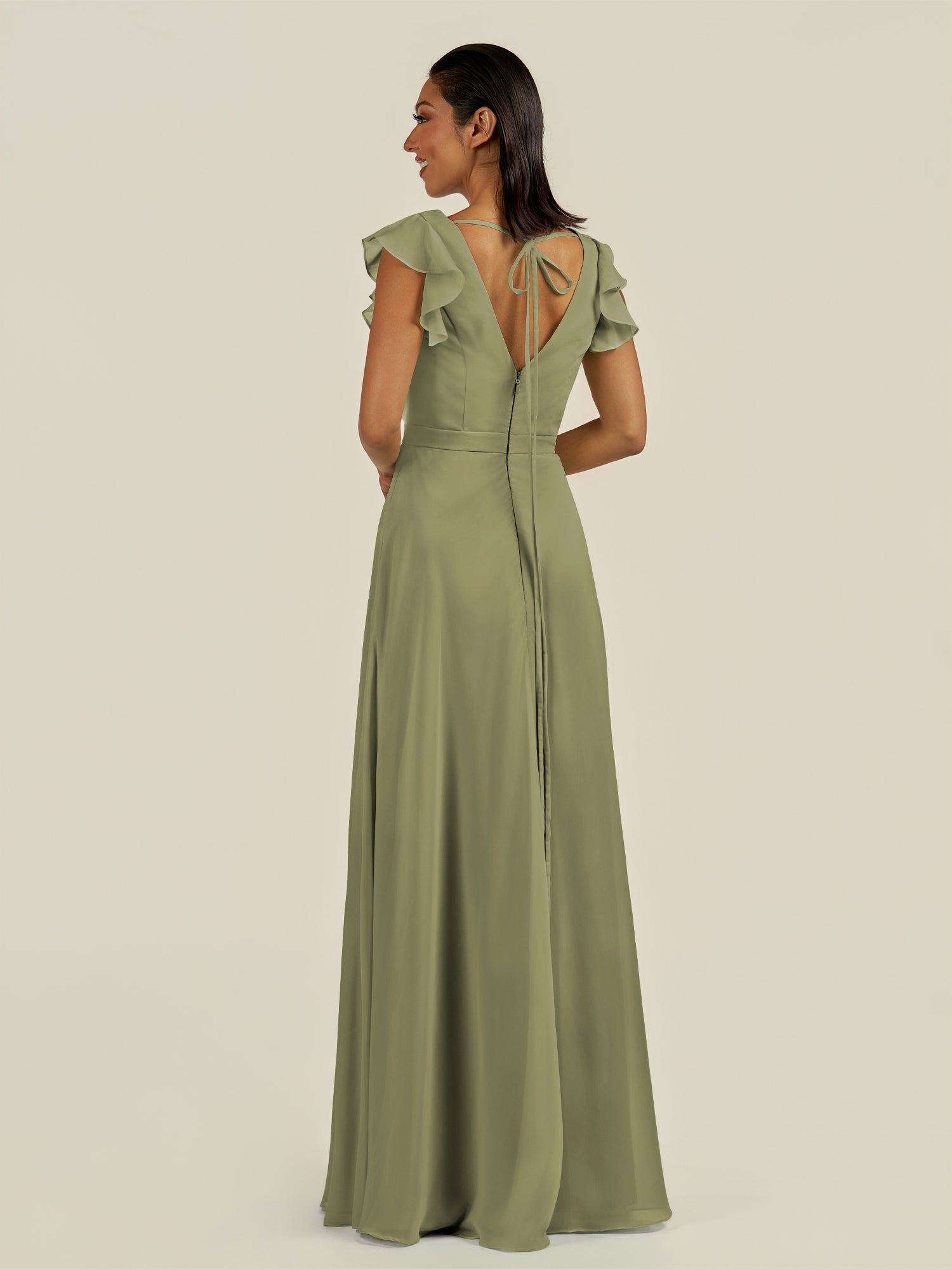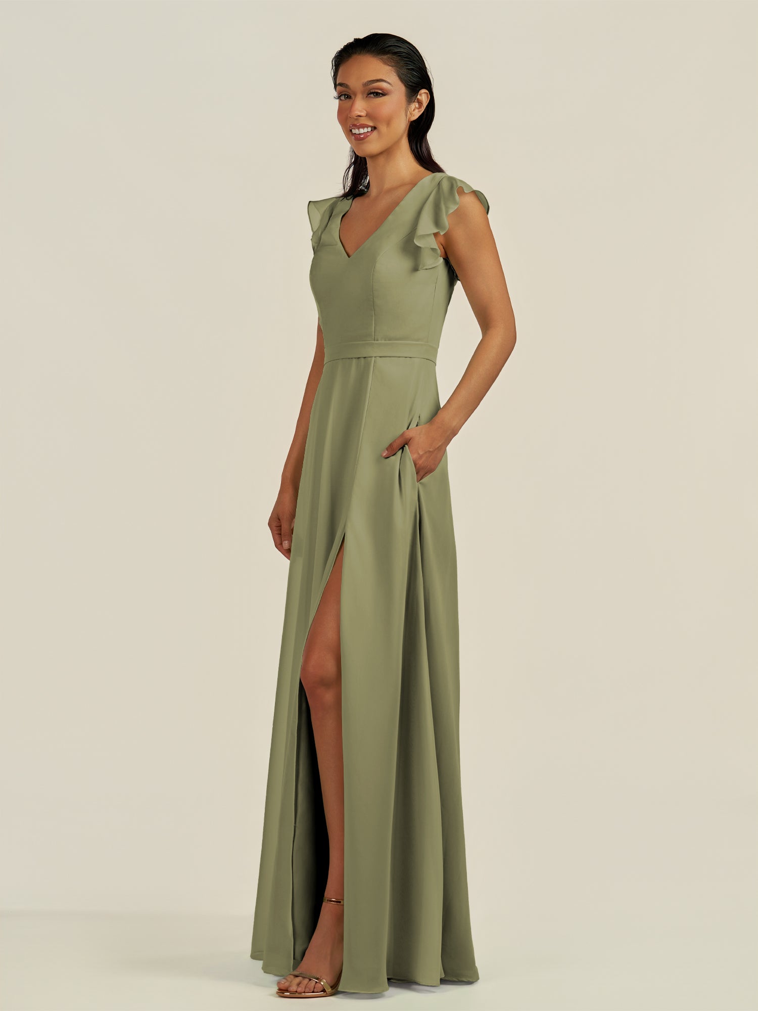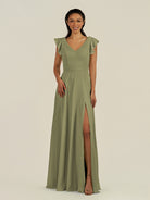 Orlina | Thyme - A Line Chiffon V Neck Long Bridesmaid Dress with Flutter Sleeves
