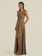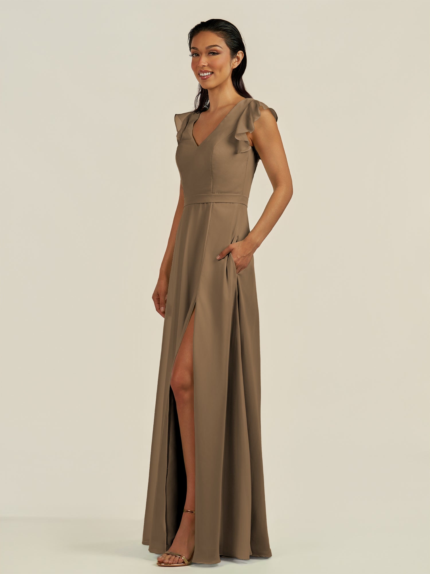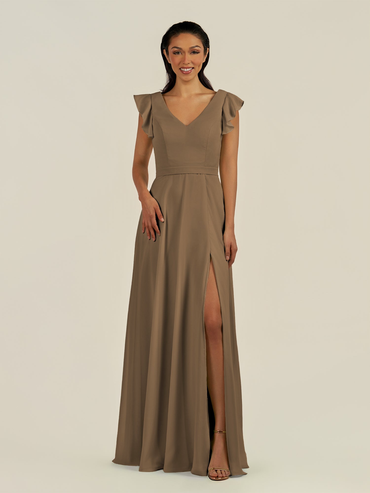Orlina is a vision of delicate elegance and modern romance. Made from soft chiffon, she features a deep V-neckline and cap sleeves with flutter details that add a whimsical touch. Her floor-length A-line skirt flows gracefully, enhanced by side slit, while the tie-back closure provides a customizable, flattering fit. Orlina is perfect for bridesmaids seeking a light, airy, and sophisticated silhoue.