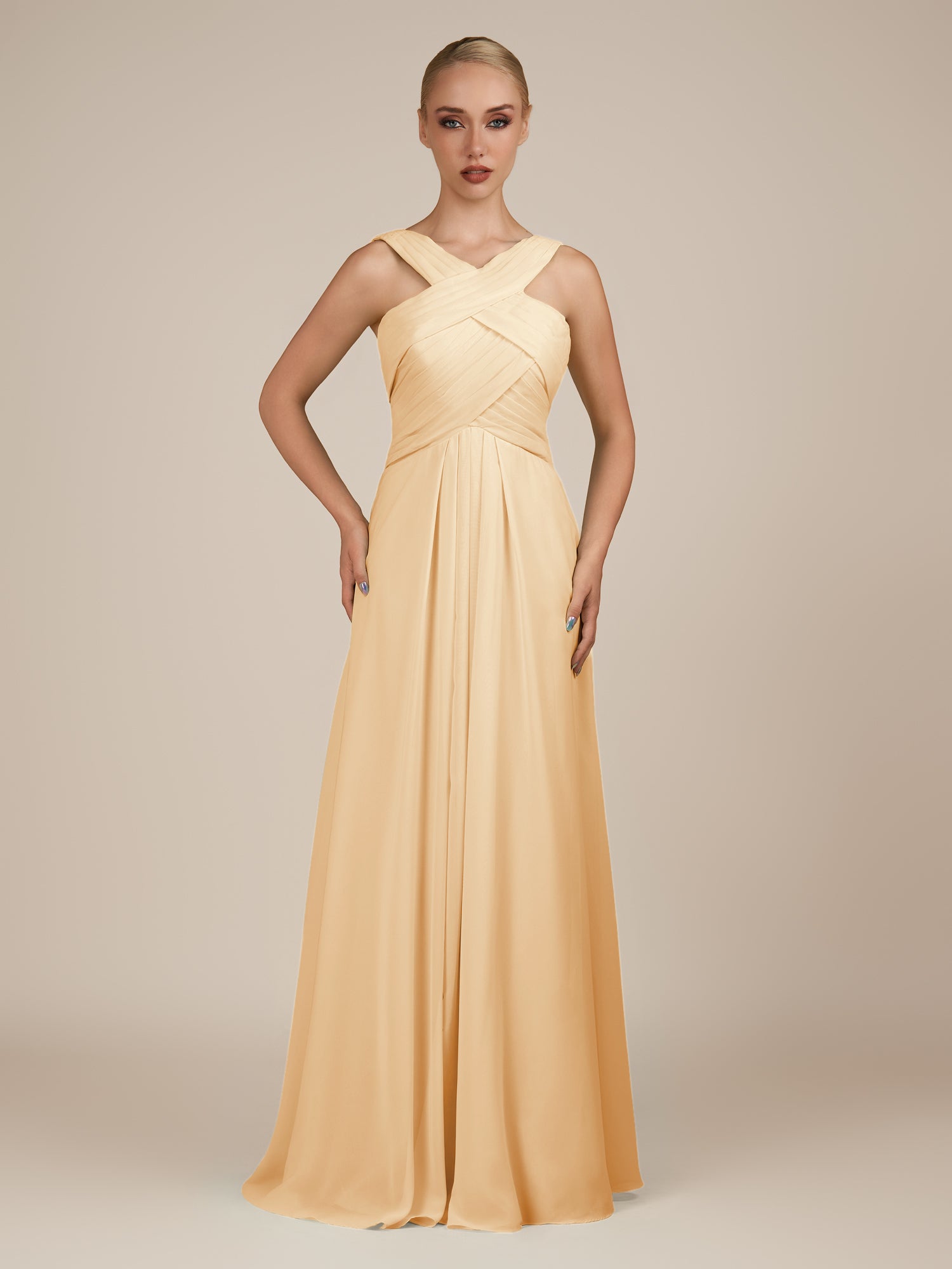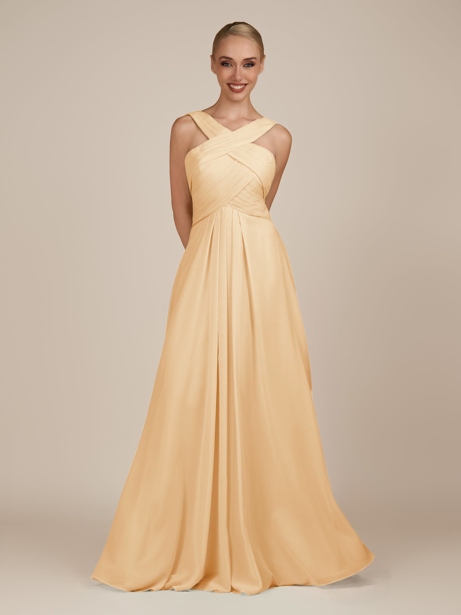 Sharlie | Golden Champagne - A Line Chiffon Halter Neck Long Bridesmaid Dress with Pleats