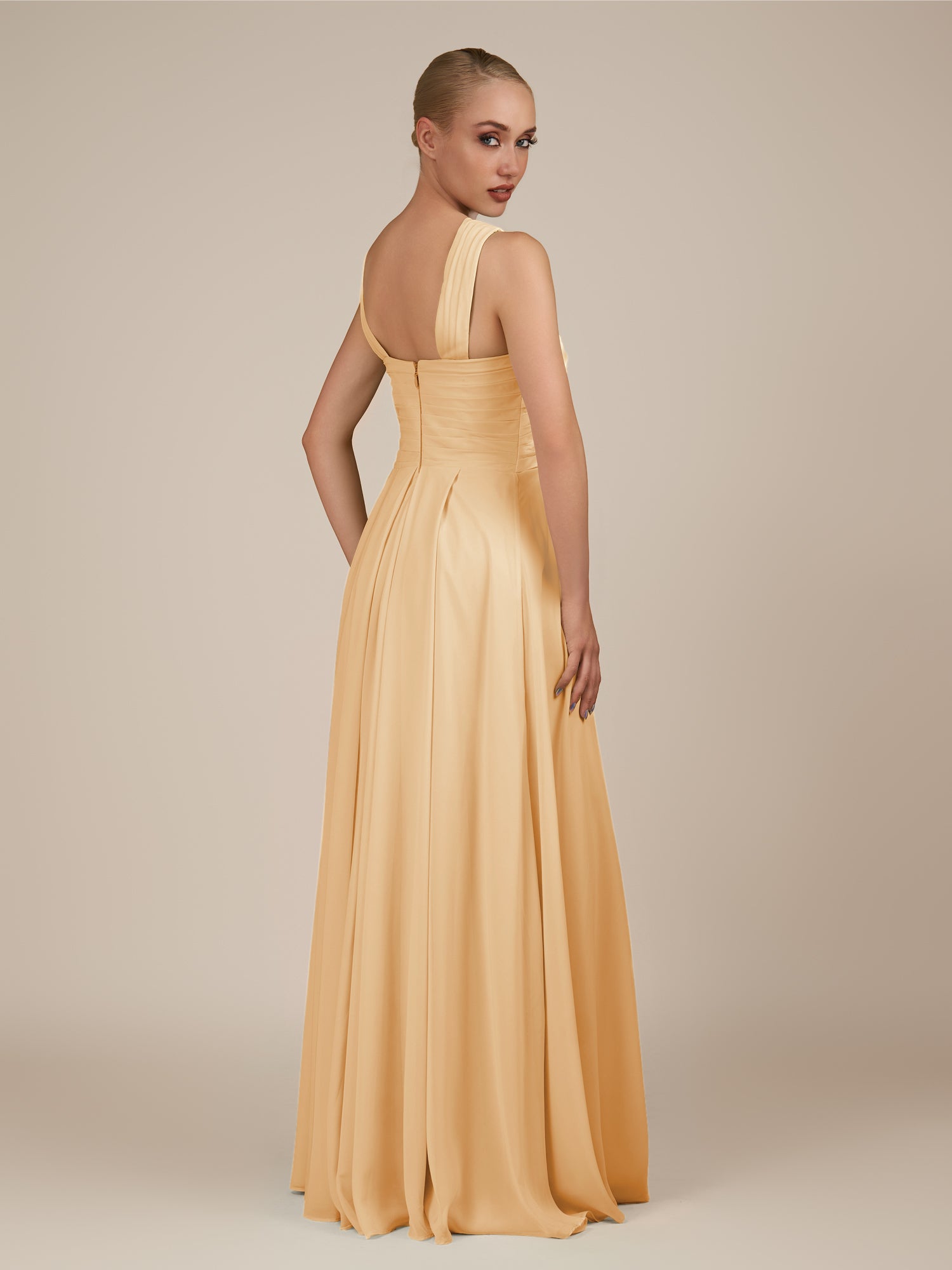 Sharlie is an elegant and refined choice for your bridal party. Crafted from soft chiffon, she features a flattering halter neckline and a sleeveless bodice for a modern, graceful look. Her floor-length A-line skirt flows effortlessly with every step, enhanced by delicate pleats that add texture and sophistication. Finished with a smooth zipper back, Sharlie combines timeless elegance with effortless style for weddings and special occasions.