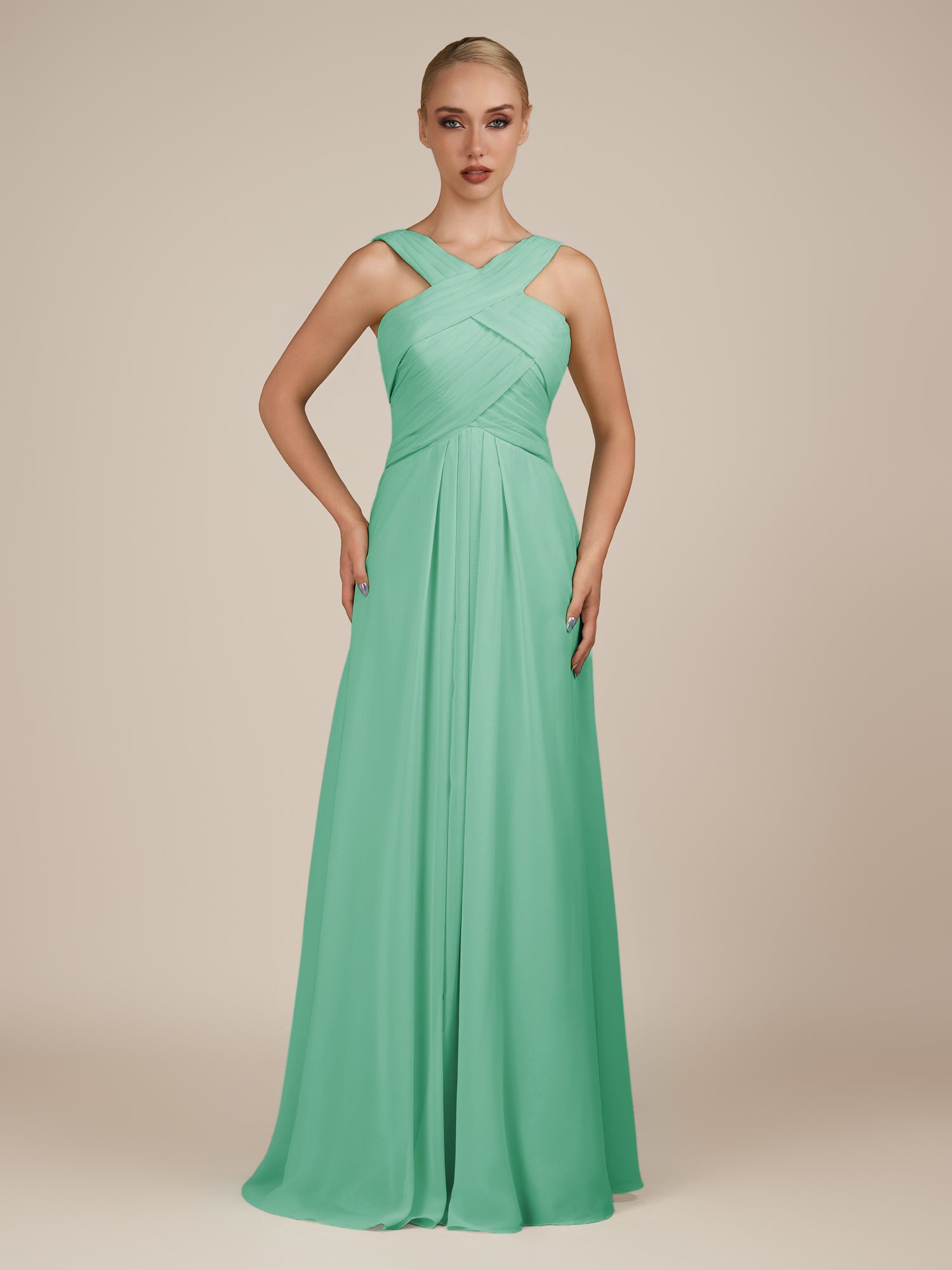 Sharlie is an elegant and refined choice for your bridal party. Crafted from soft chiffon, she features a flattering halter neckline and a sleeveless bodice for a modern, graceful look. Her floor-length A-line skirt flows effortlessly with every step, enhanced by delicate pleats that add texture and sophistication. Finished with a smooth zipper back, Sharlie combines timeless elegance with effortless style for weddings and special occasions.