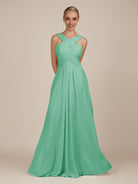 Sharlie | Turquoise - A Line Chiffon Halter Neck Long Bridesmaid Dress with Pleats