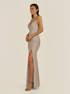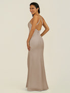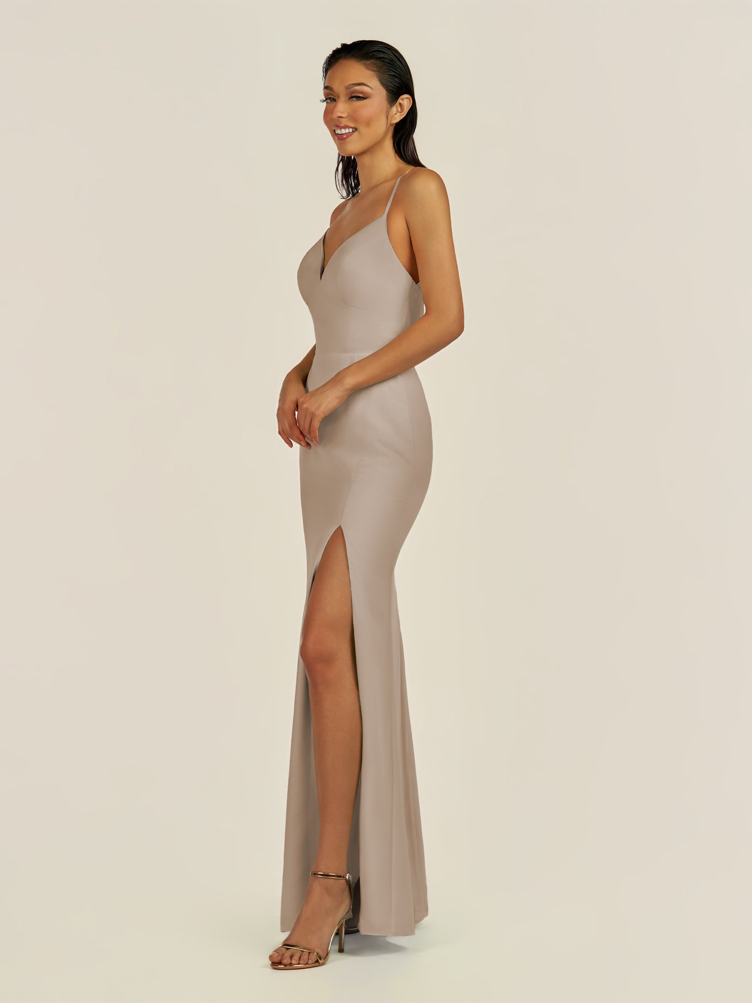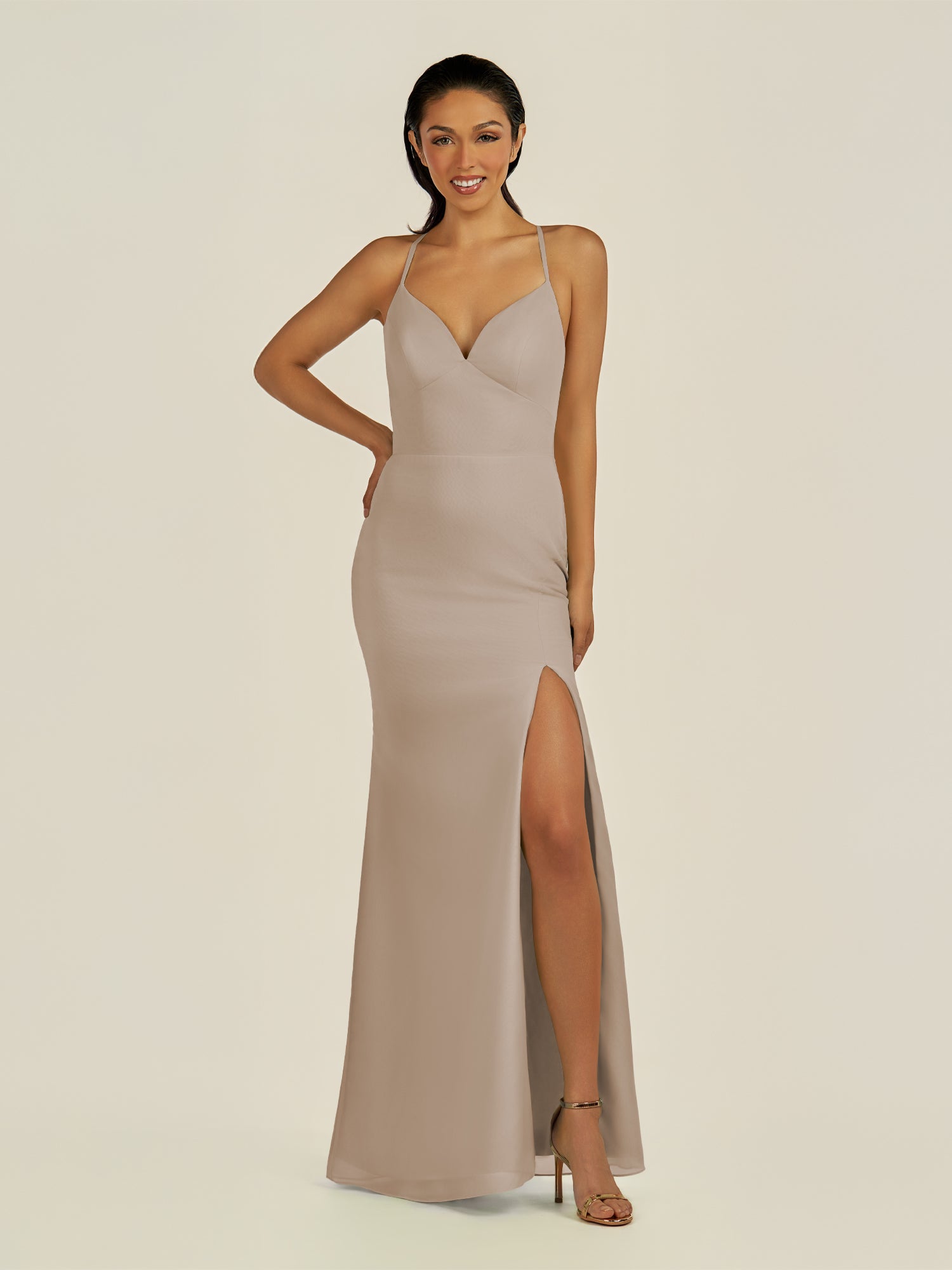 Zeryn is a sleek and elegant choice for your bridal party. Crafted from soft chiffon, she features a flattering V-neckline and a sleeveless bodice that highlights the shoulders with grace. Her floor-length sheath silhouette flows smoothly, enhanced by a subtle side slit for movement and modern sophistication. Finished with a smooth zipper back, Zeryn blends timeless style with contemporary elegance—perfect for weddings and special occasions.