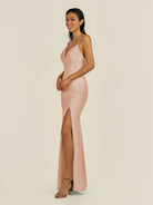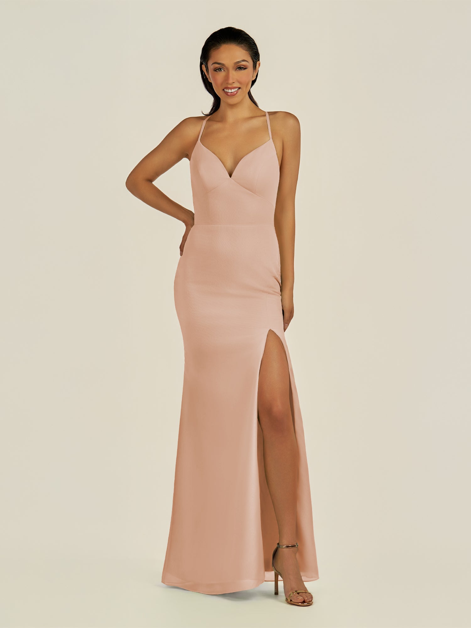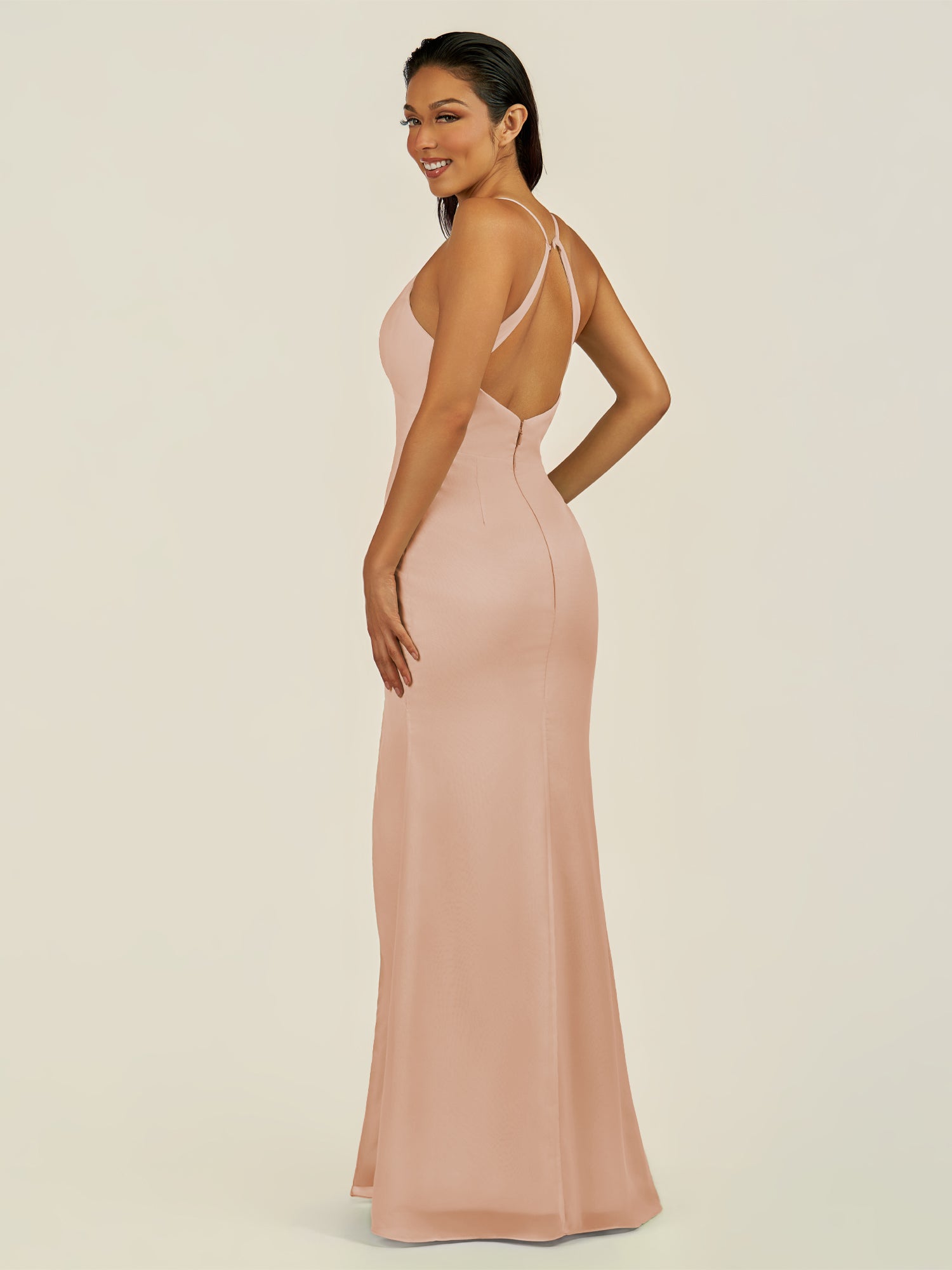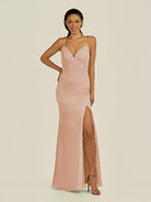 Zeryn is a sleek and elegant choice for your bridal party. Crafted from soft chiffon, she features a flattering V-neckline and a sleeveless bodice that highlights the shoulders with grace. Her floor-length sheath silhouette flows smoothly, enhanced by a subtle side slit for movement and modern sophistication. Finished with a smooth zipper back, Zeryn blends timeless style with contemporary elegance—perfect for weddings and special occasions.