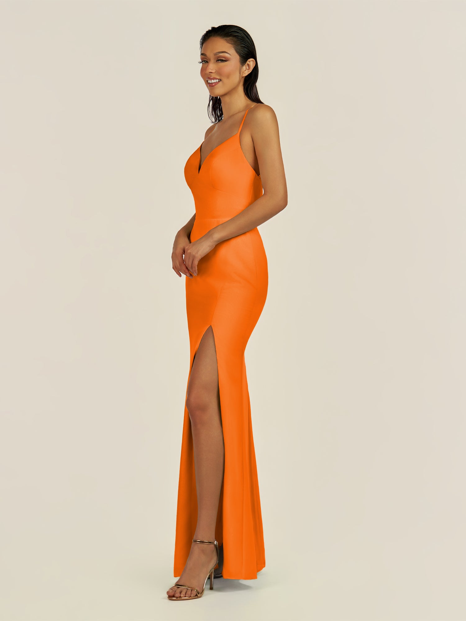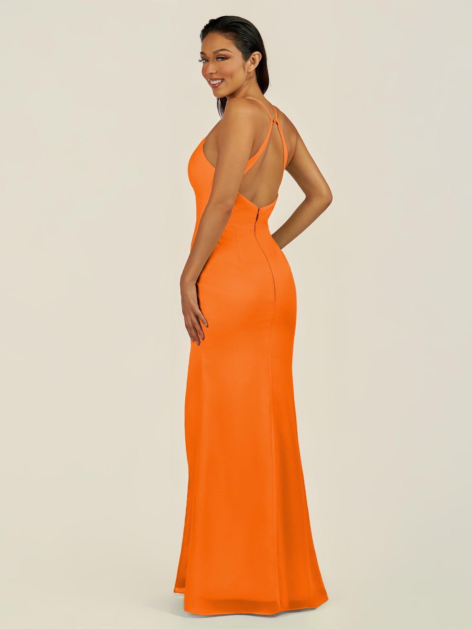 Zeryn is a sleek and elegant choice for your bridal party. Crafted from soft chiffon, she features a flattering V-neckline and a sleeveless bodice that highlights the shoulders with grace. Her floor-length sheath silhouette flows smoothly, enhanced by a subtle side slit for movement and modern sophistication. Finished with a smooth zipper back, Zeryn blends timeless style with contemporary elegance—perfect for weddings and special occasions.