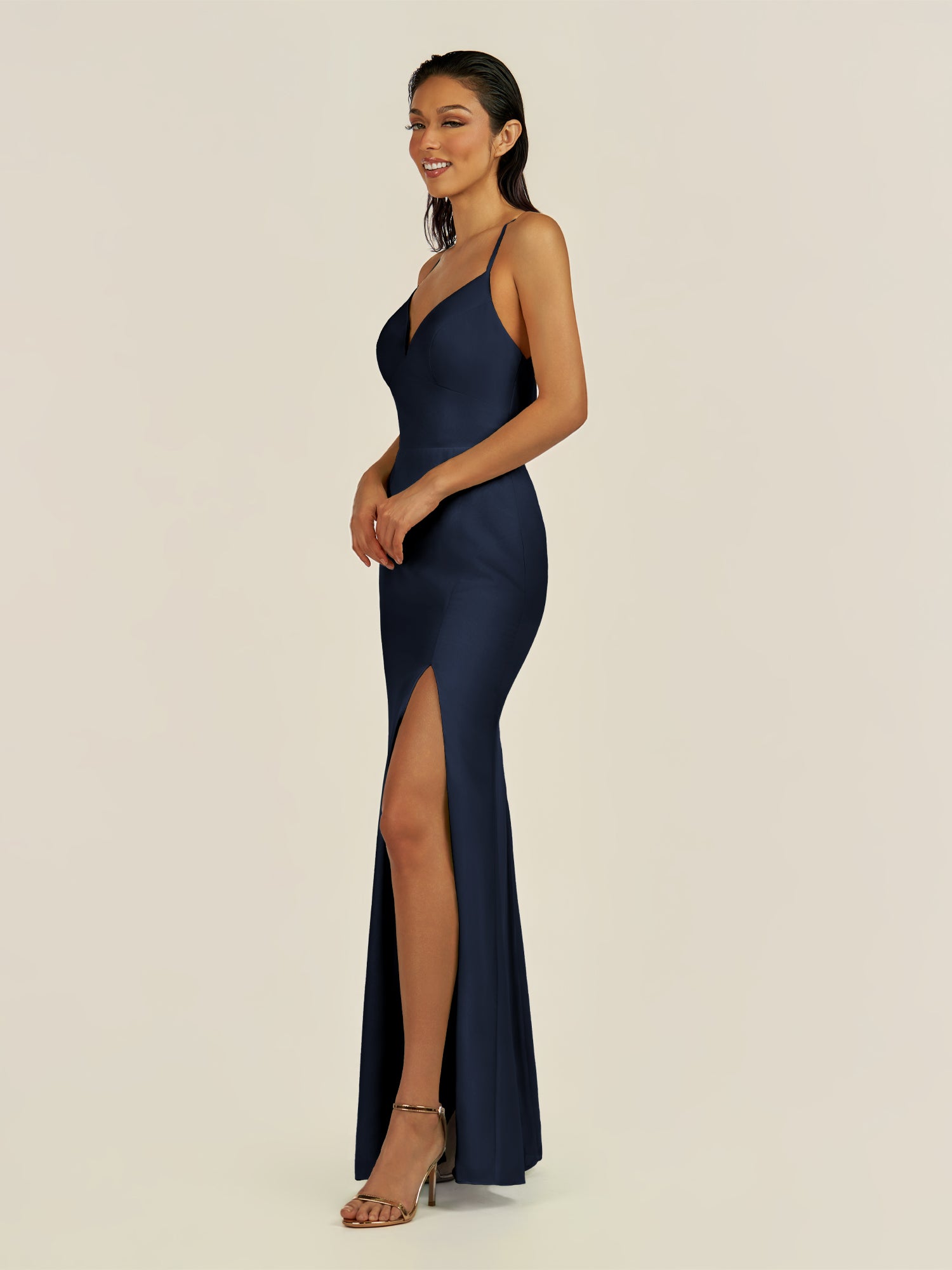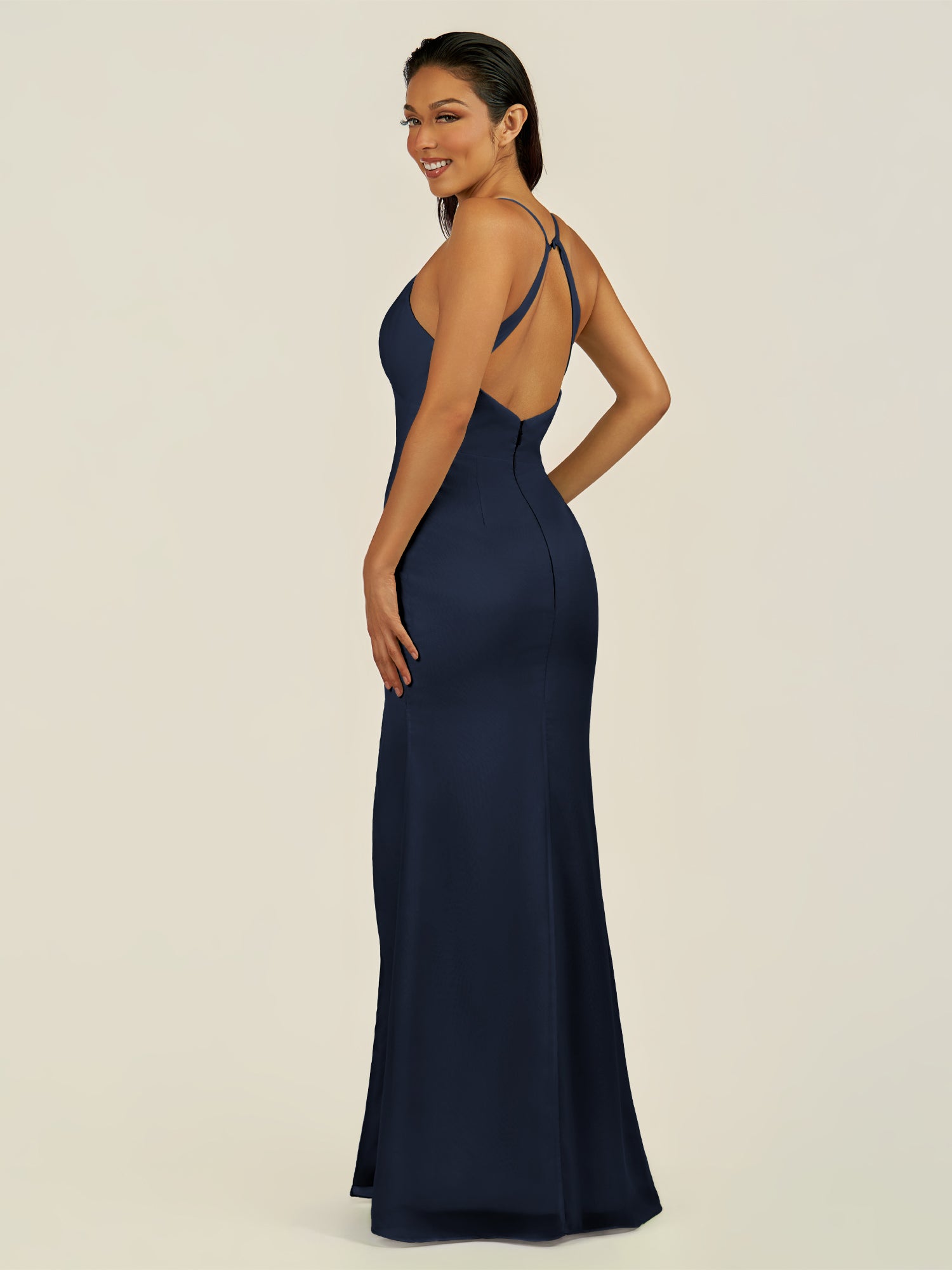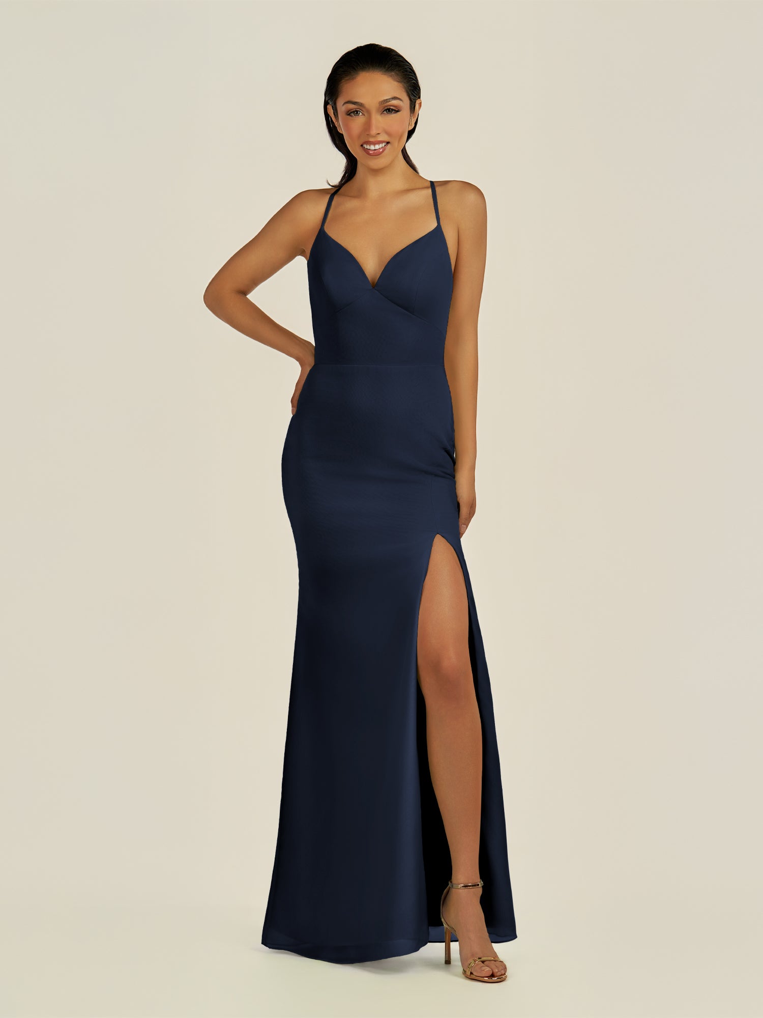 Zeryn is a sleek and elegant choice for your bridal party. Crafted from soft chiffon, she features a flattering V-neckline and a sleeveless bodice that highlights the shoulders with grace. Her floor-length sheath silhouette flows smoothly, enhanced by a subtle side slit for movement and modern sophistication. Finished with a smooth zipper back, Zeryn blends timeless style with contemporary elegance—perfect for weddings and special occasions.