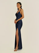 Zeryn | Dark Navy - Sheath V Neck Chiffon Long Bridesmaid Dress with Slit