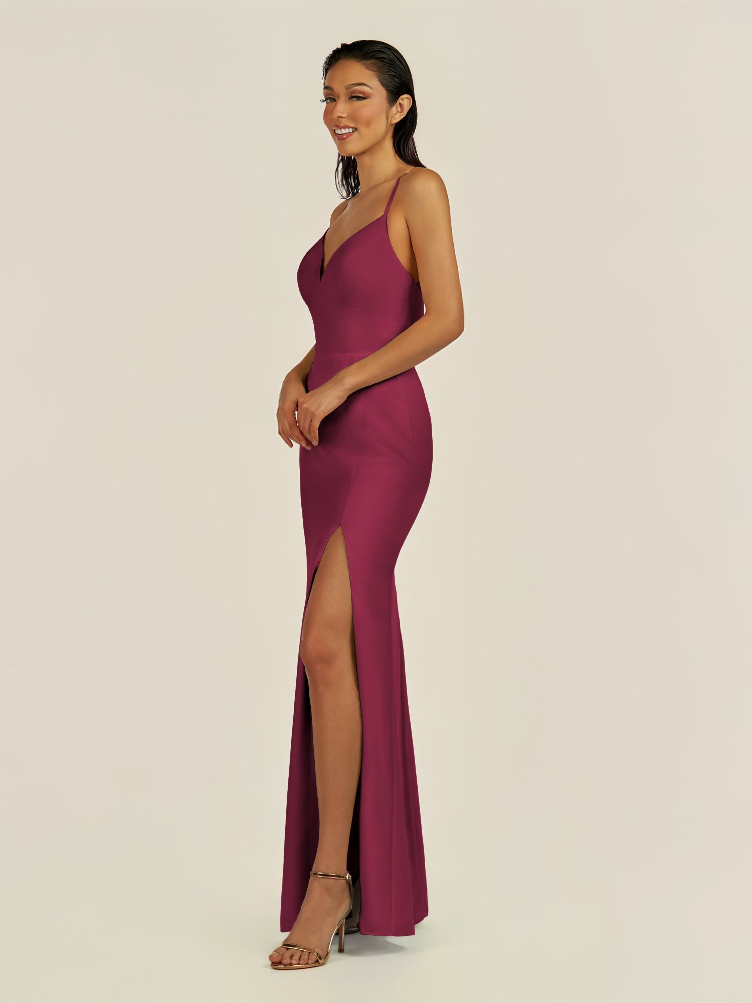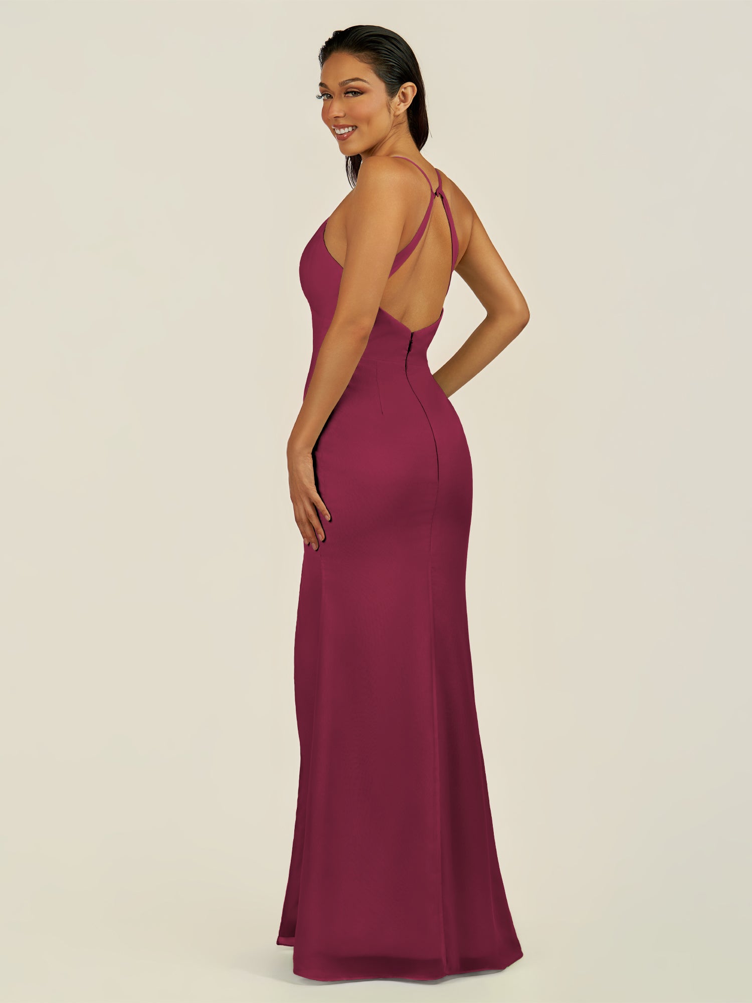Zeryn is a sleek and elegant choice for your bridal party. Crafted from soft chiffon, she features a flattering V-neckline and a sleeveless bodice that highlights the shoulders with grace. Her floor-length sheath silhouette flows smoothly, enhanced by a subtle side slit for movement and modern sophistication. Finished with a smooth zipper back, Zeryn blends timeless style with contemporary elegance—perfect for weddings and special occasions.