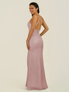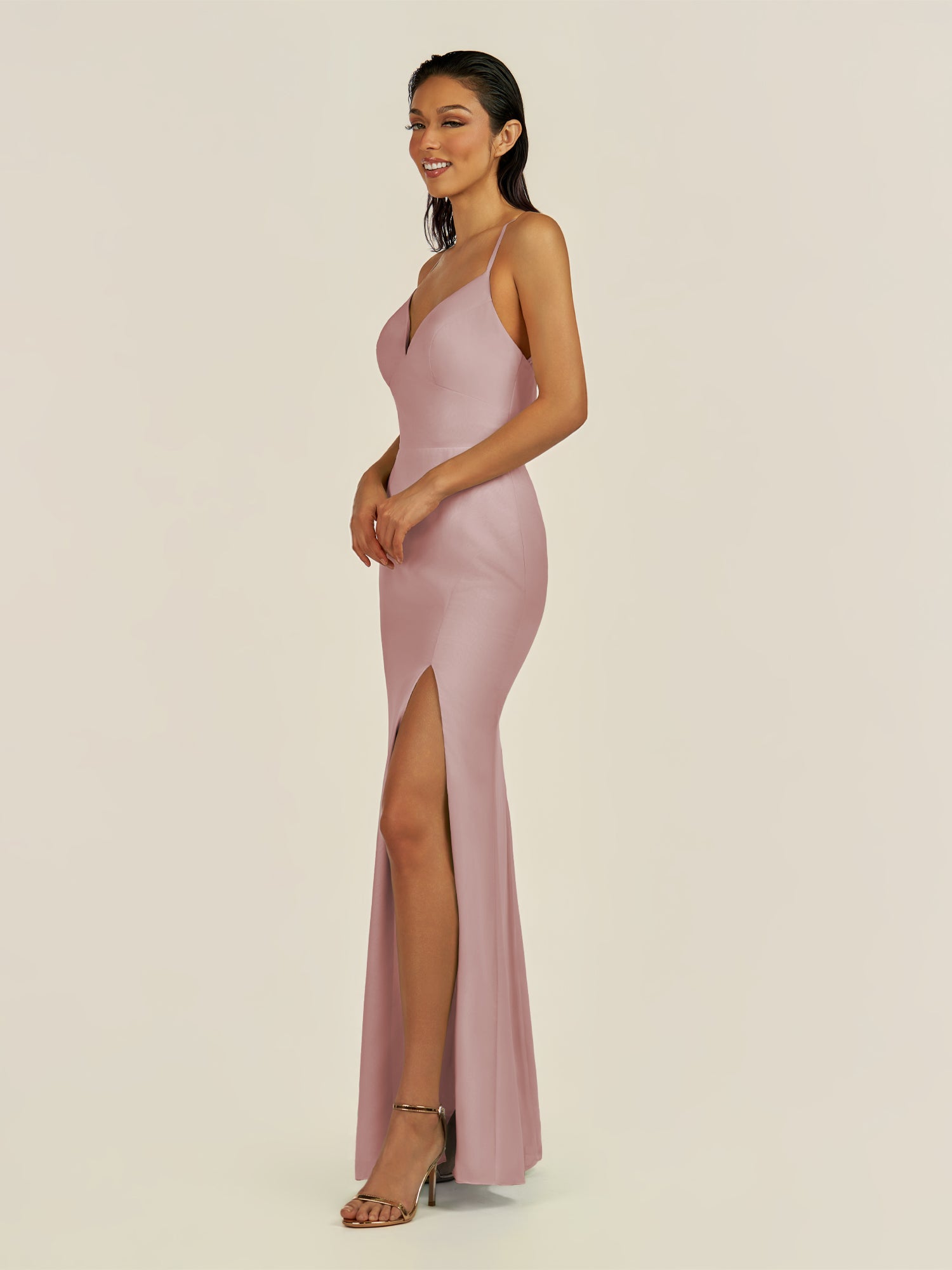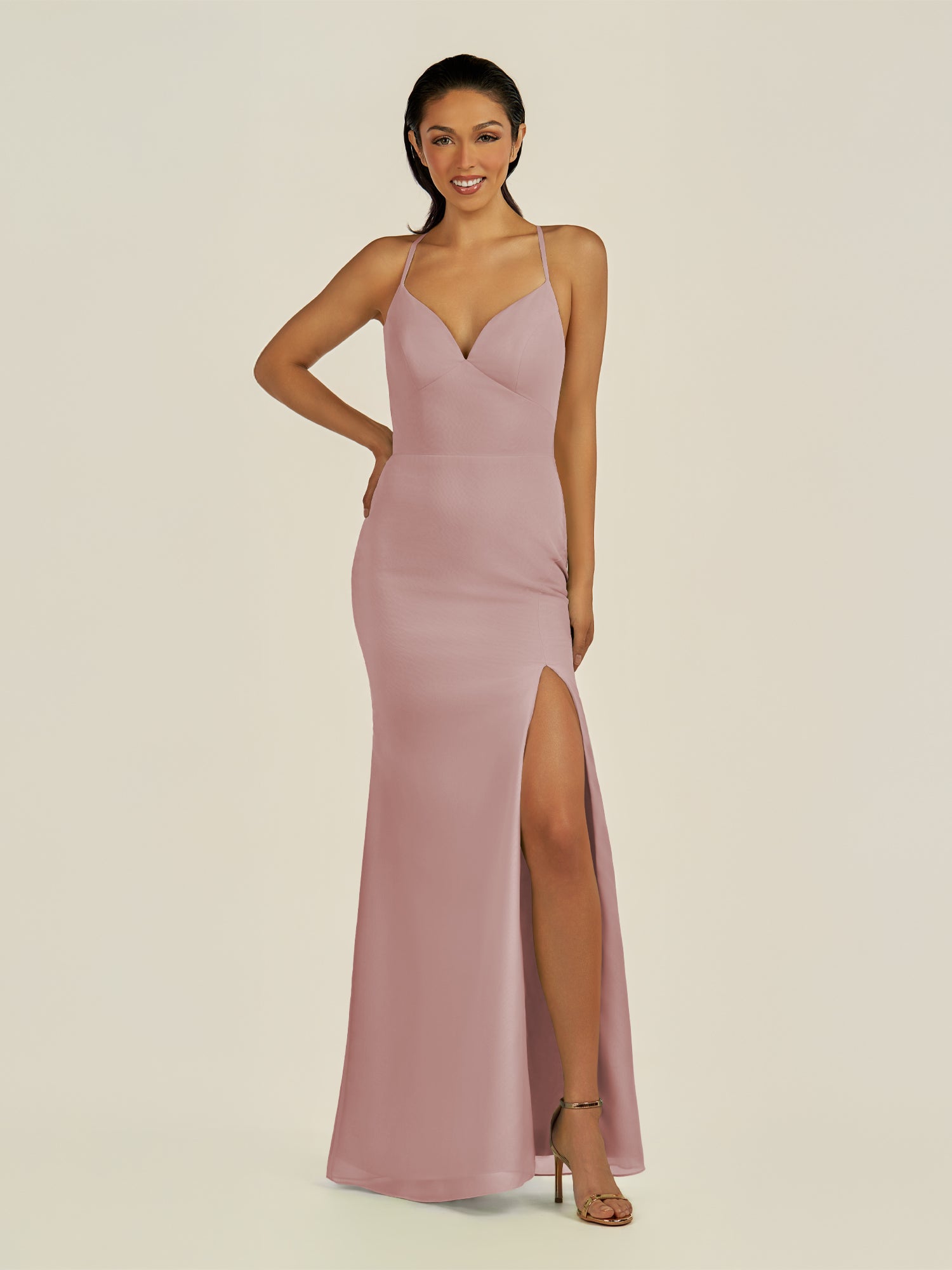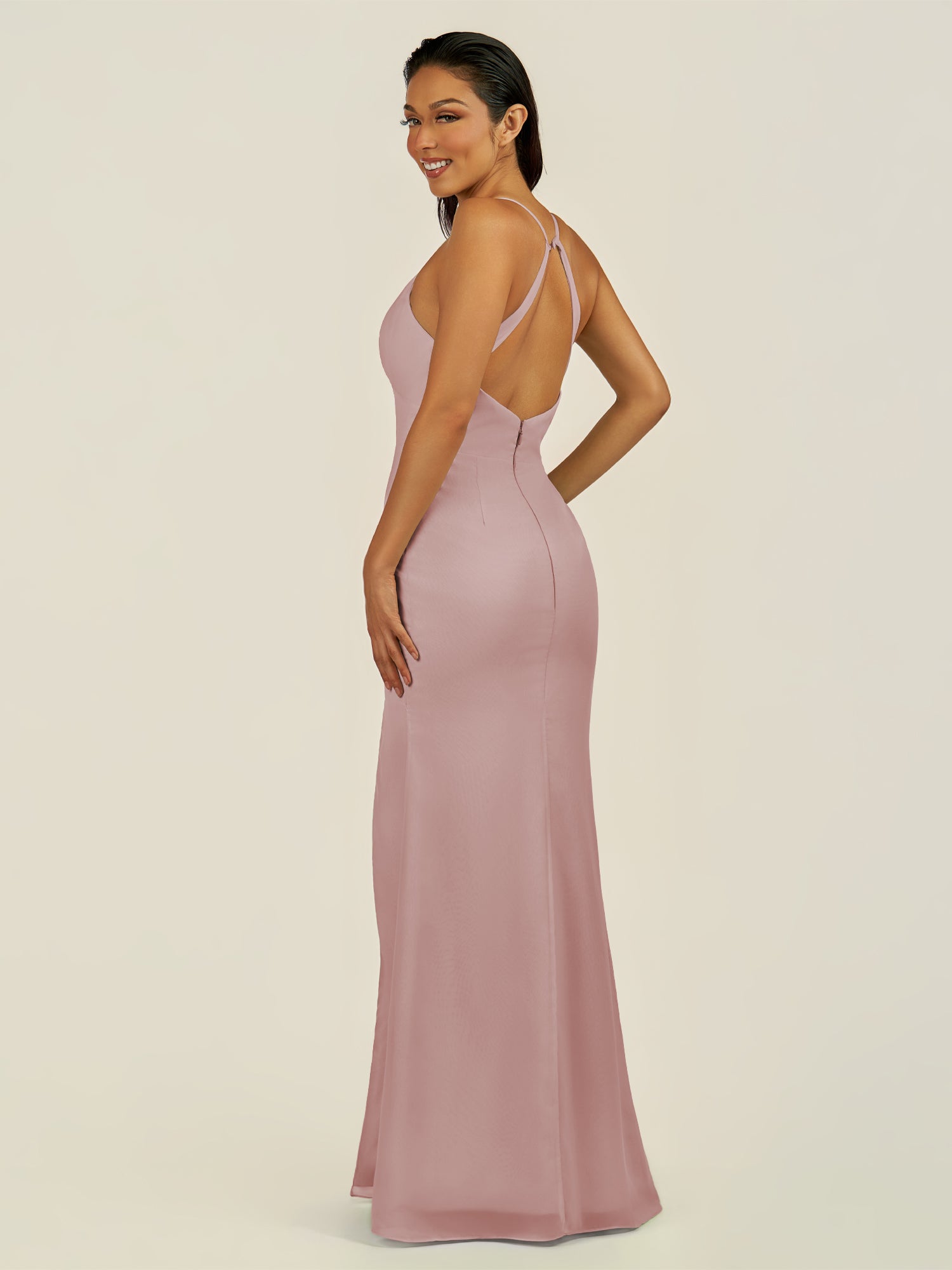 Zeryn is a sleek and elegant choice for your bridal party. Crafted from soft chiffon, she features a flattering V-neckline and a sleeveless bodice that highlights the shoulders with grace. Her floor-length sheath silhouette flows smoothly, enhanced by a subtle side slit for movement and modern sophistication. Finished with a smooth zipper back, Zeryn blends timeless style with contemporary elegance—perfect for weddings and special occasions.