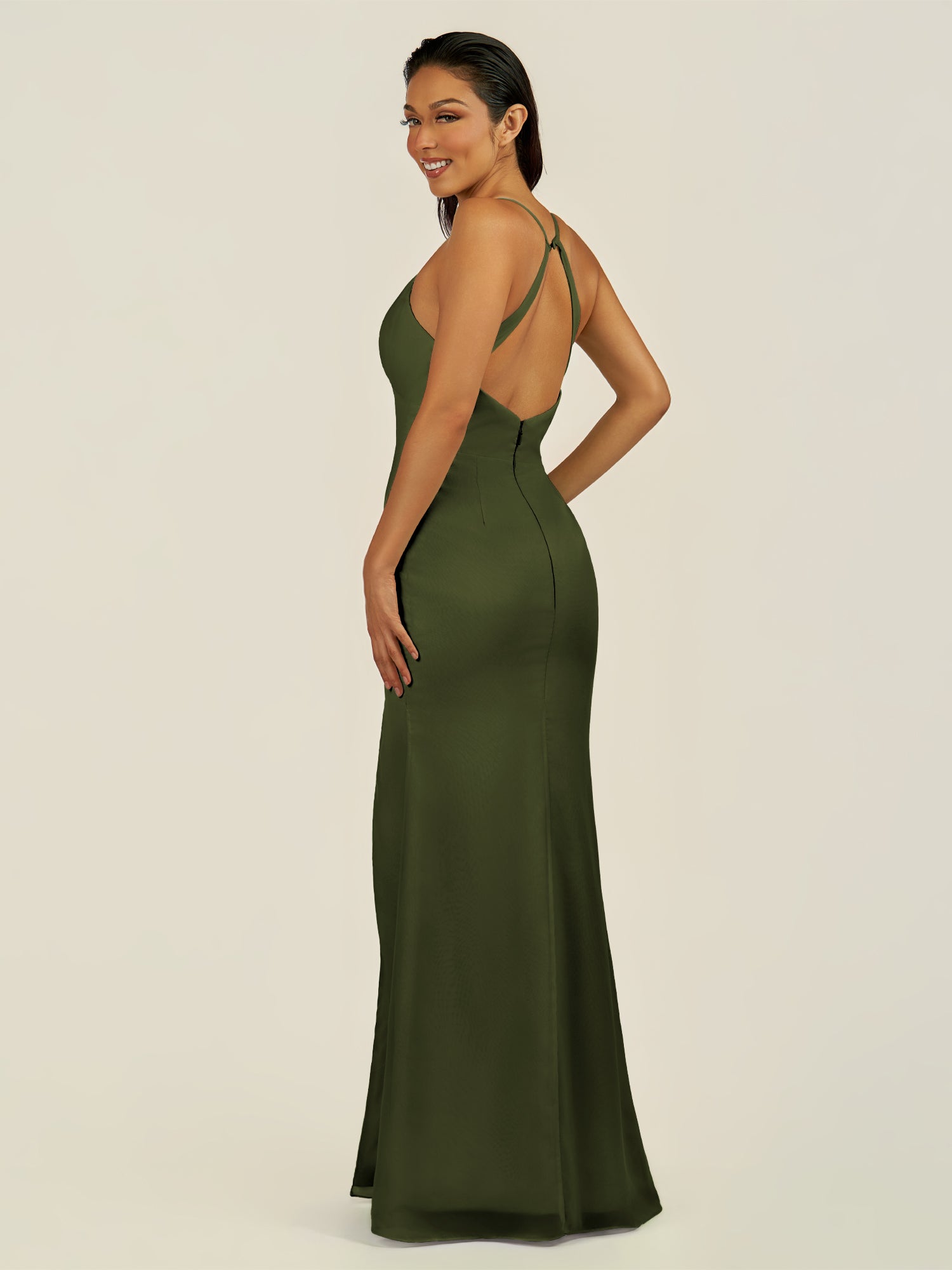 Zeryn is a sleek and elegant choice for your bridal party. Crafted from soft chiffon, she features a flattering V-neckline and a sleeveless bodice that highlights the shoulders with grace. Her floor-length sheath silhouette flows smoothly, enhanced by a subtle side slit for movement and modern sophistication. Finished with a smooth zipper back, Zeryn blends timeless style with contemporary elegance—perfect for weddings and special occasions.