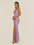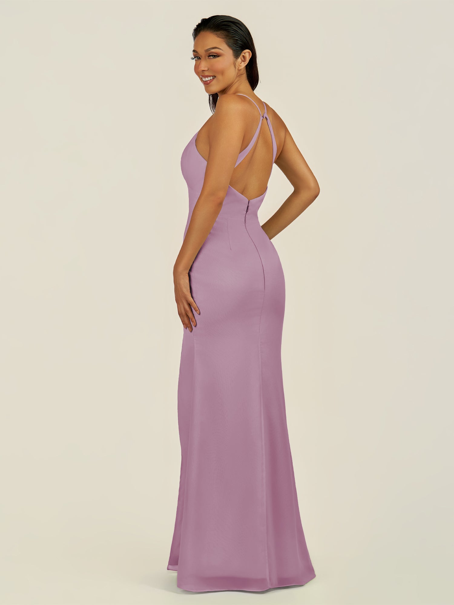 Zeryn is a sleek and elegant choice for your bridal party. Crafted from soft chiffon, she features a flattering V-neckline and a sleeveless bodice that highlights the shoulders with grace. Her floor-length sheath silhouette flows smoothly, enhanced by a subtle side slit for movement and modern sophistication. Finished with a smooth zipper back, Zeryn blends timeless style with contemporary elegance—perfect for weddings and special occasions.