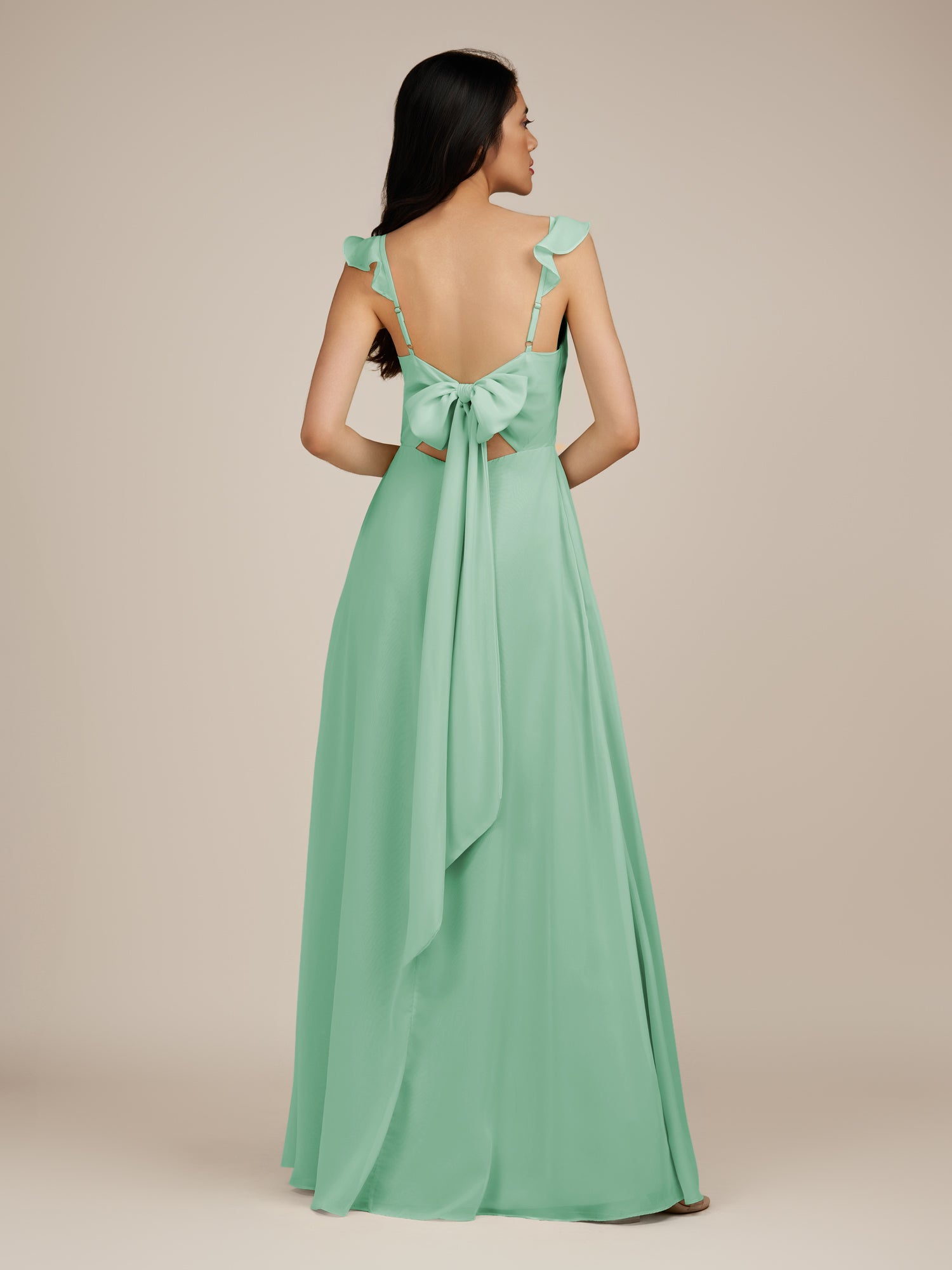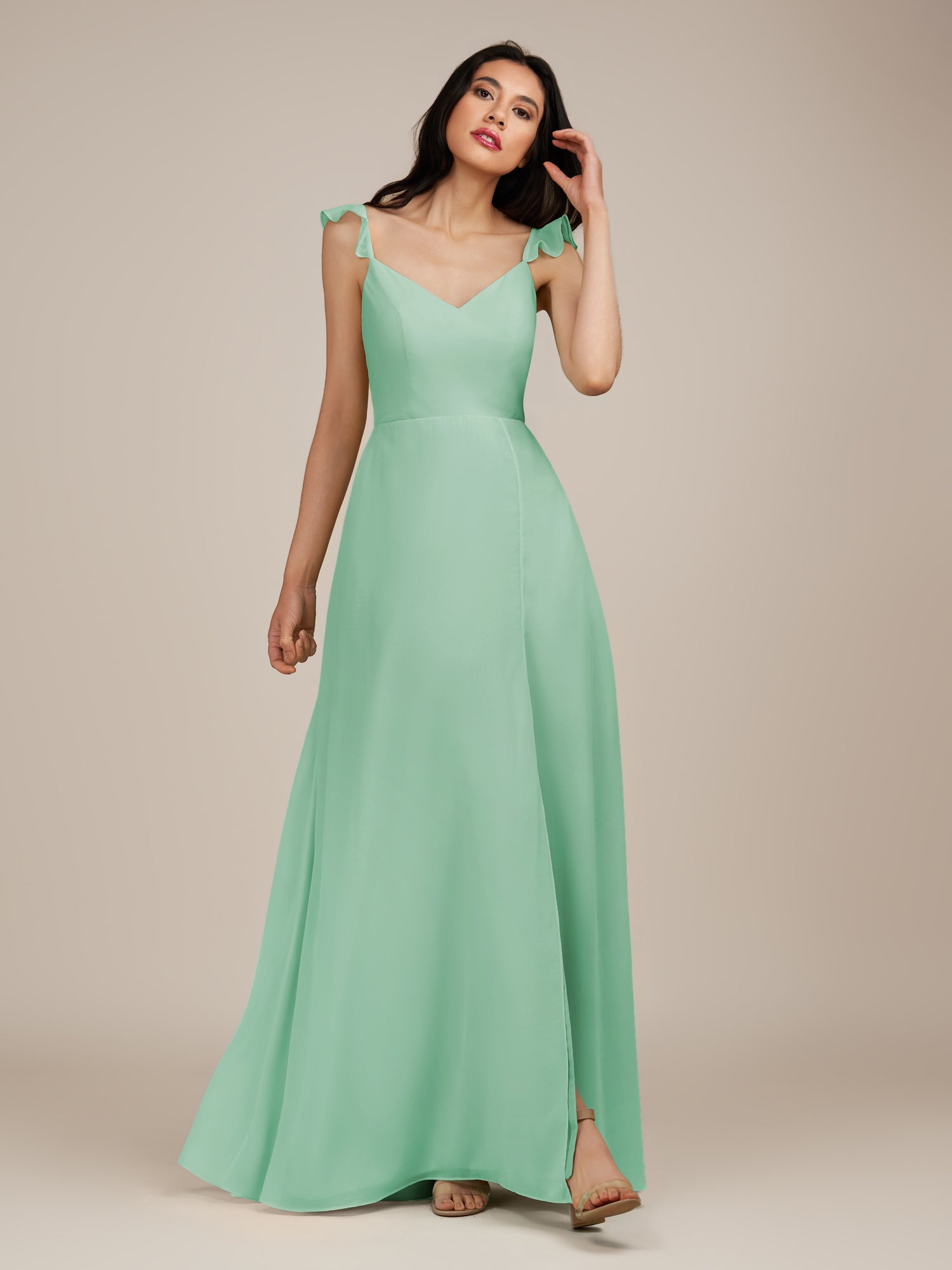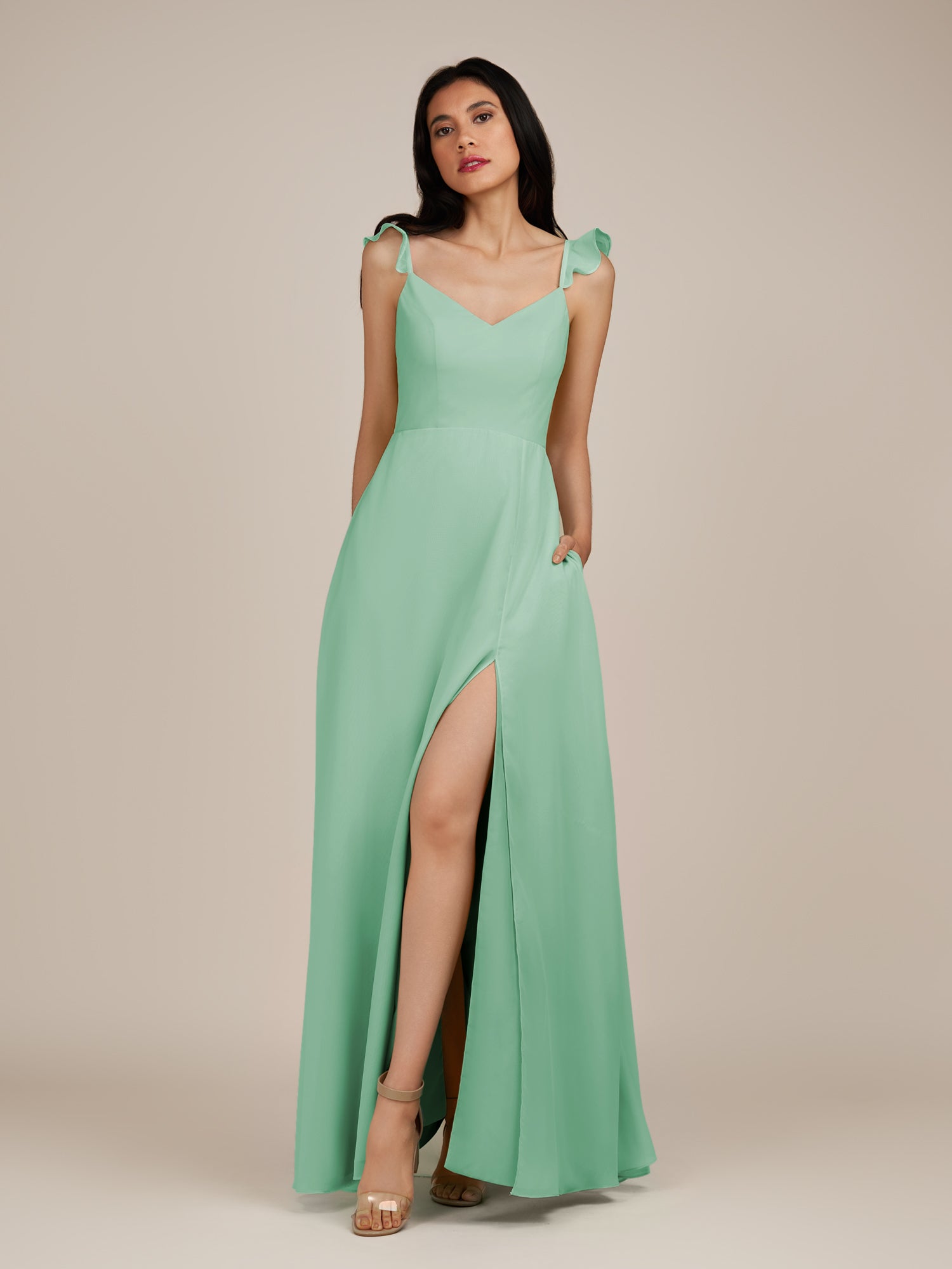 Rhonda | Pale Pistachio - Sheath Chiffon V Neck Ruffled Long Bridesmaid Dress with Slit