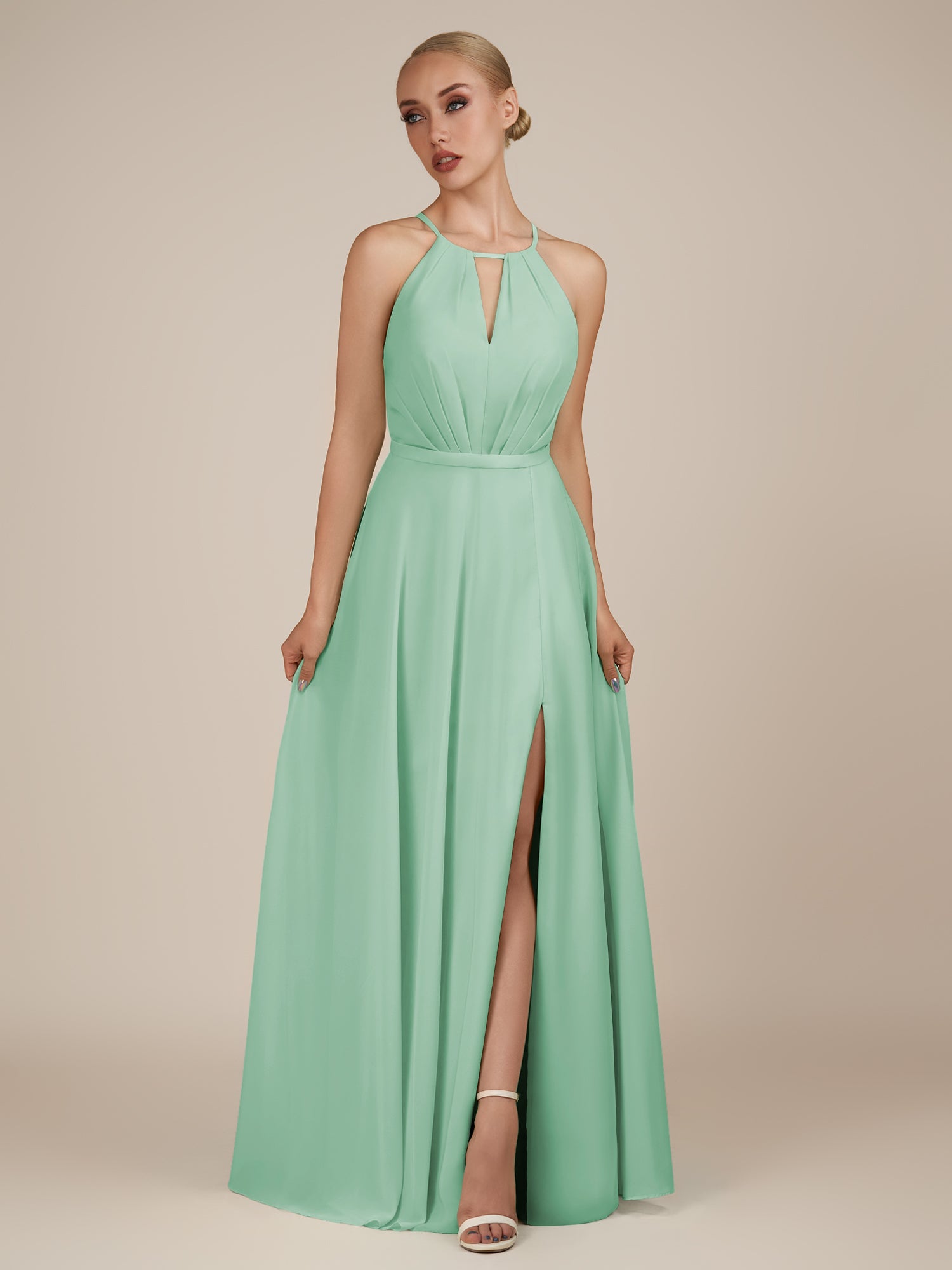 Ione | Pale Pistachio - A Line Chiffon Halter Neck Long Bridesmaid Dress with Slit