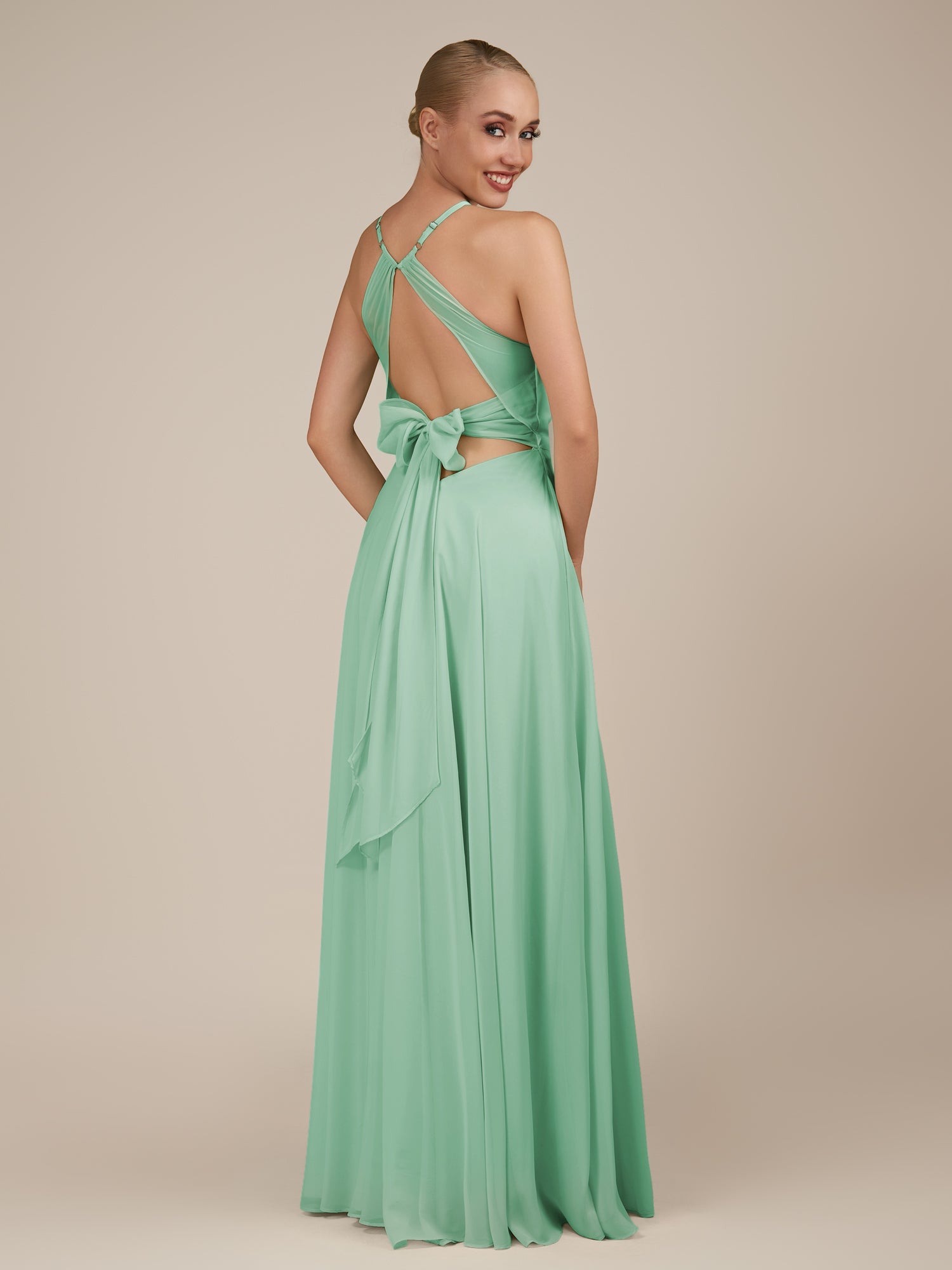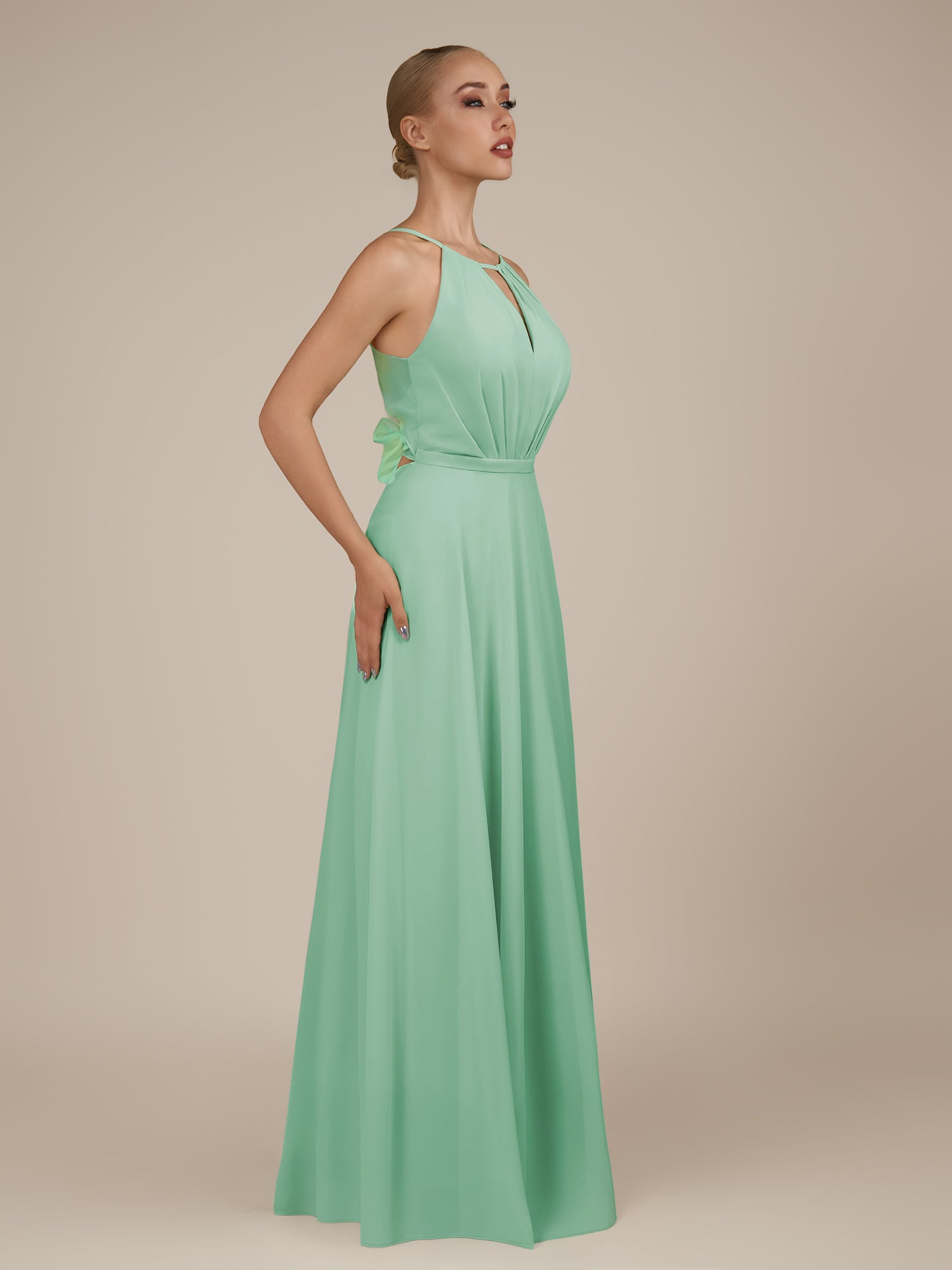 Illyria | Pale Pistachio - A Line Chiffon Halter Neck Long Bridesmaid Dress with Cut Out