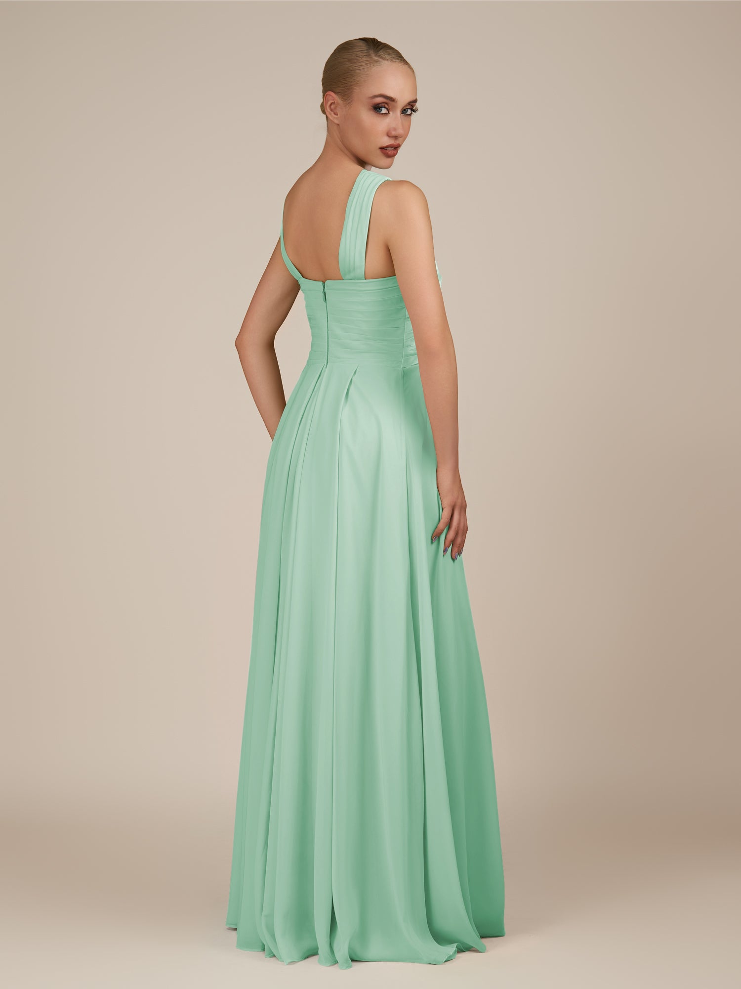 Gaura | Silver - A Line Chiffon One Shoulder Pleated Long Bridesmaid Dress with Slit