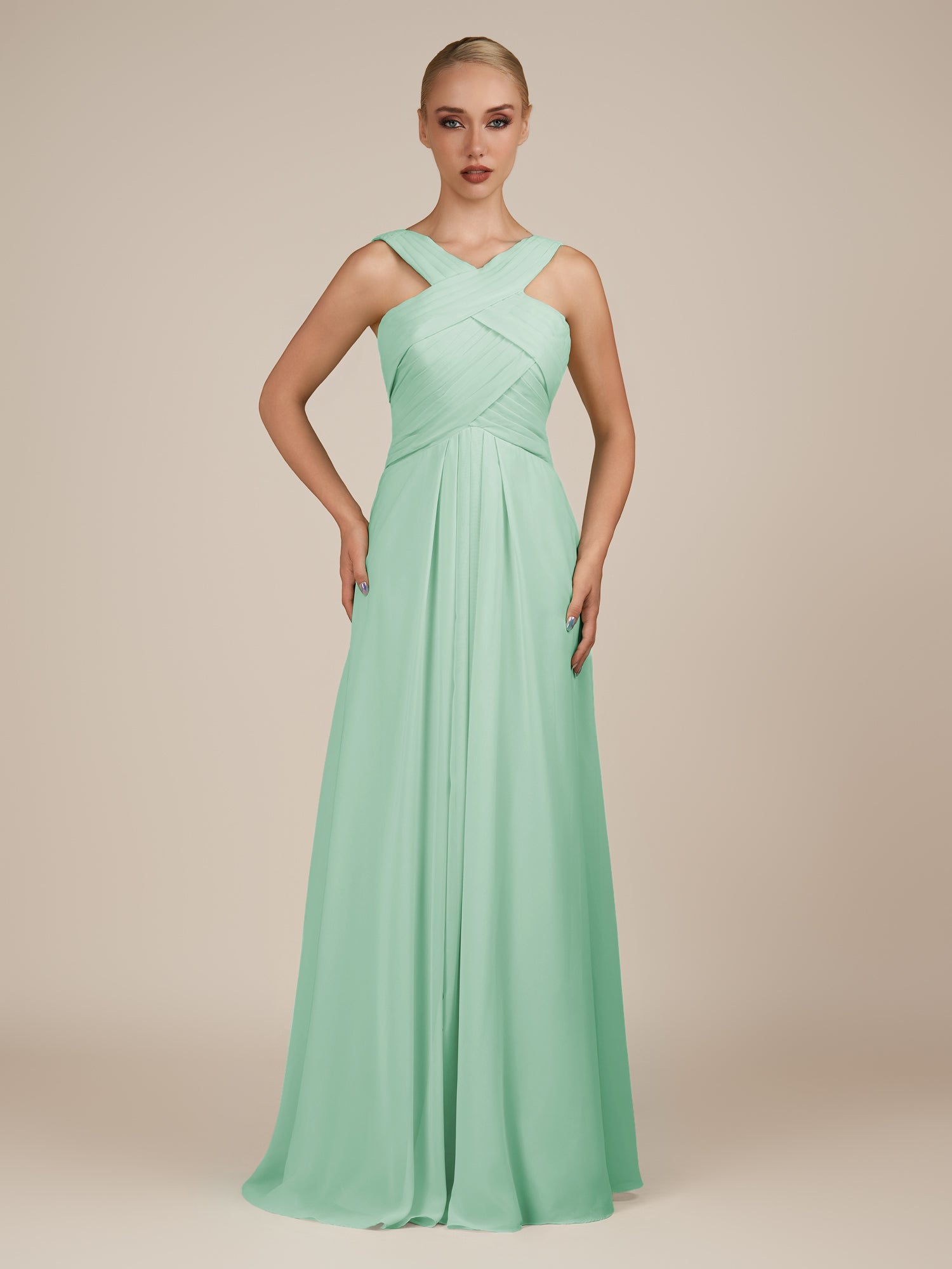 Sharlie | Pale Pistachio - A Line Chiffon Halter Neck Long Bridesmaid Dress with Pleats