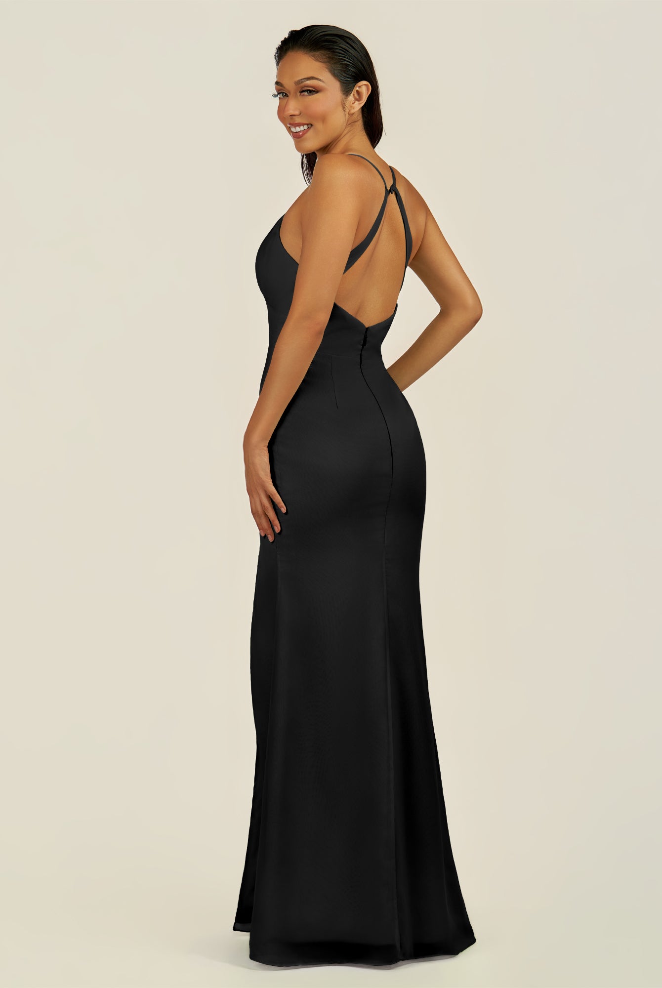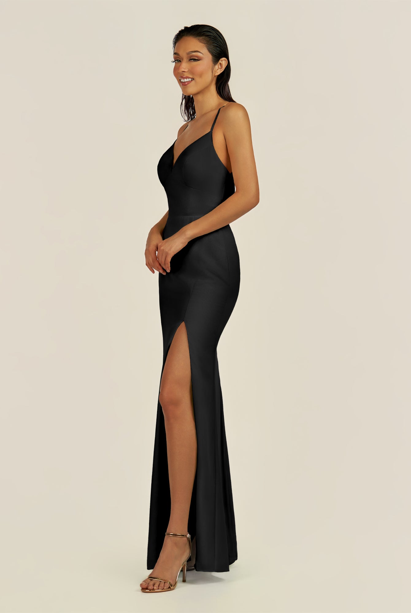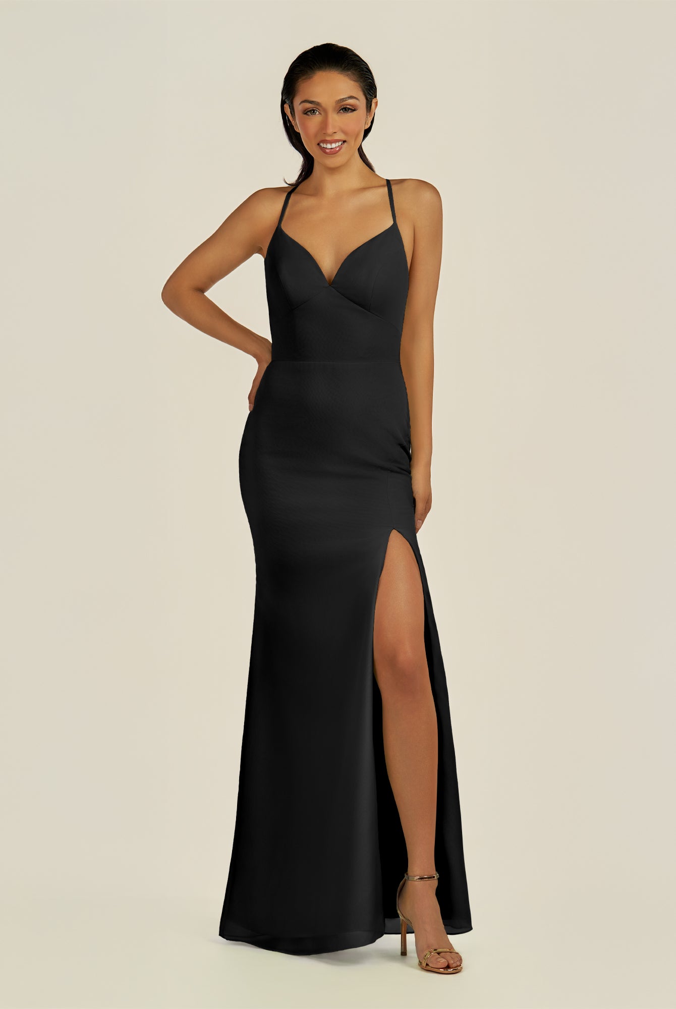 Zeryn | Black - Sheath V Neck Chiffon Long Bridesmaid Dress with Slit