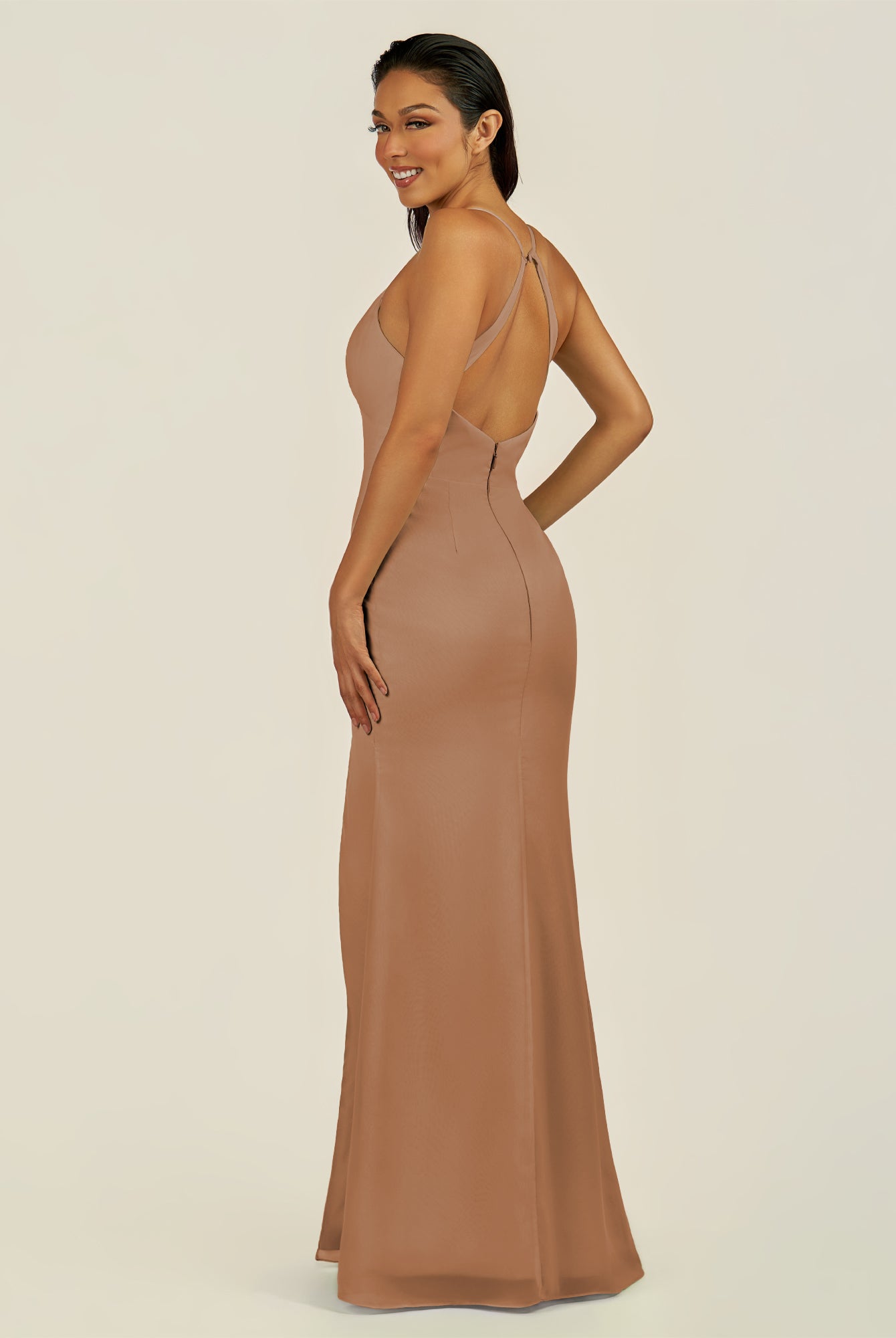Zeryn | Toffee - Sheath V Neck Chiffon Long Bridesmaid Dress with Slit