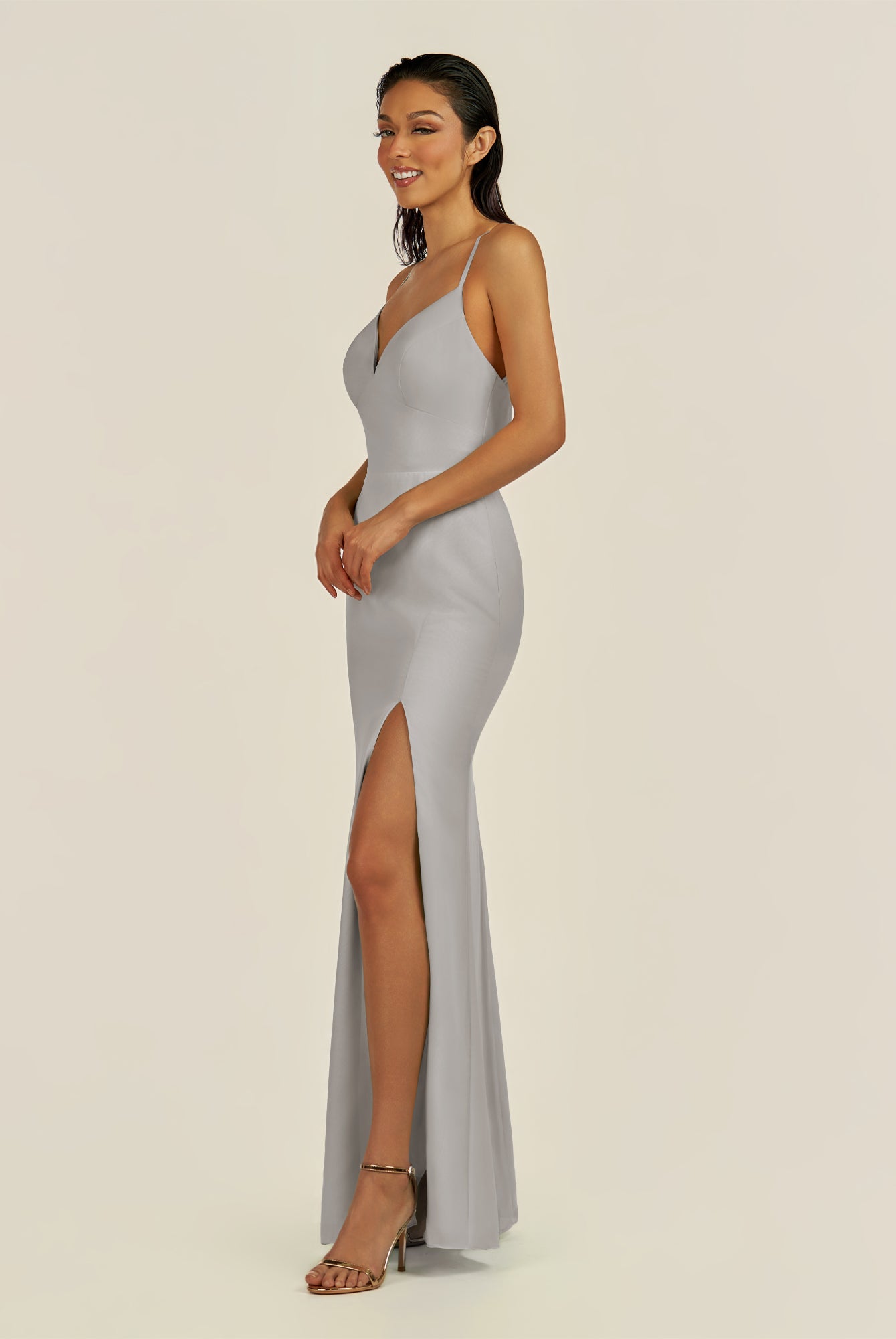Zeryn | Silver - Sheath V Neck Chiffon Long Bridesmaid Dress with Slit
