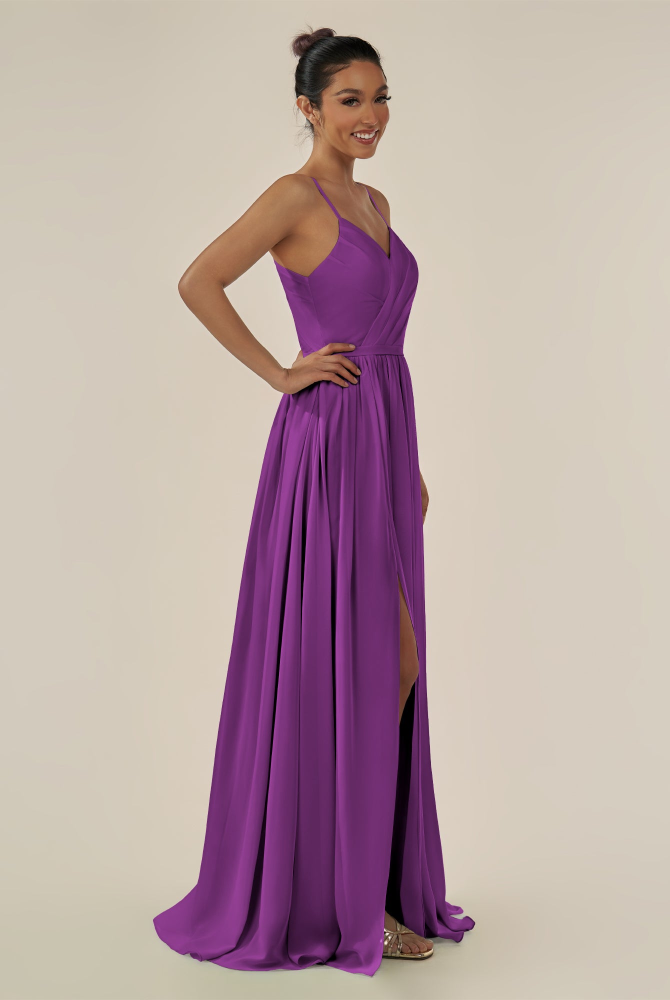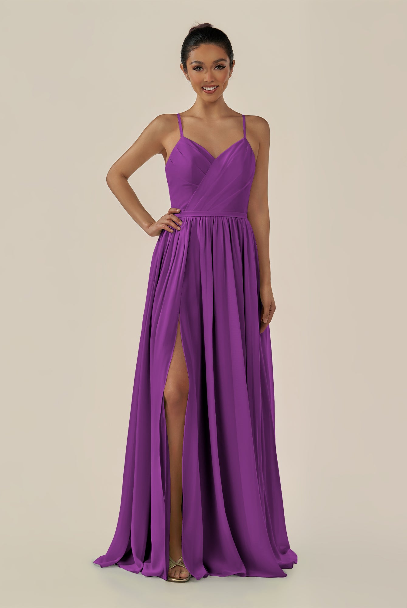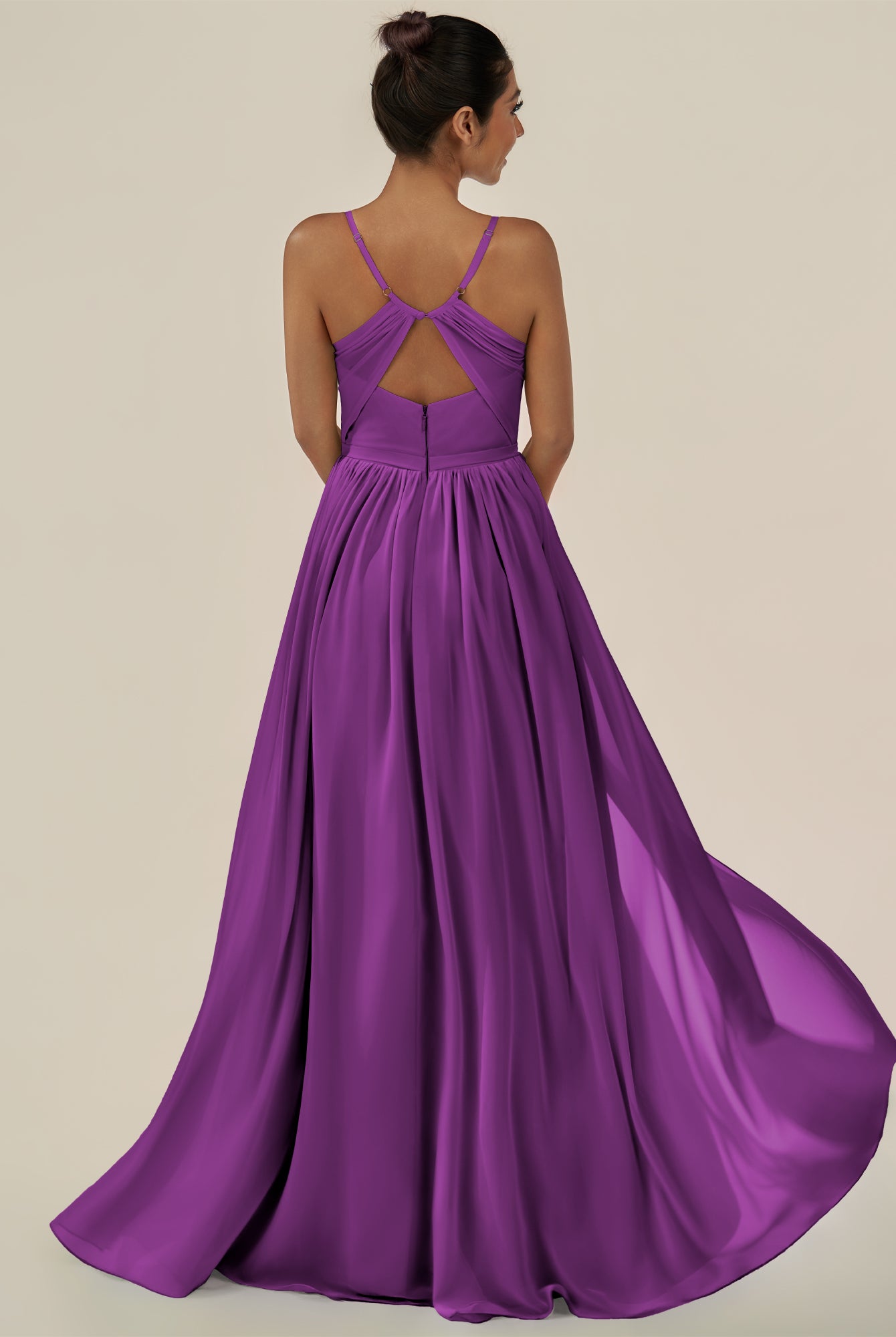 Irissa | Amethyst - A Line Chiffon V Neck Pleated Long Bridesmaid Dress with Slit