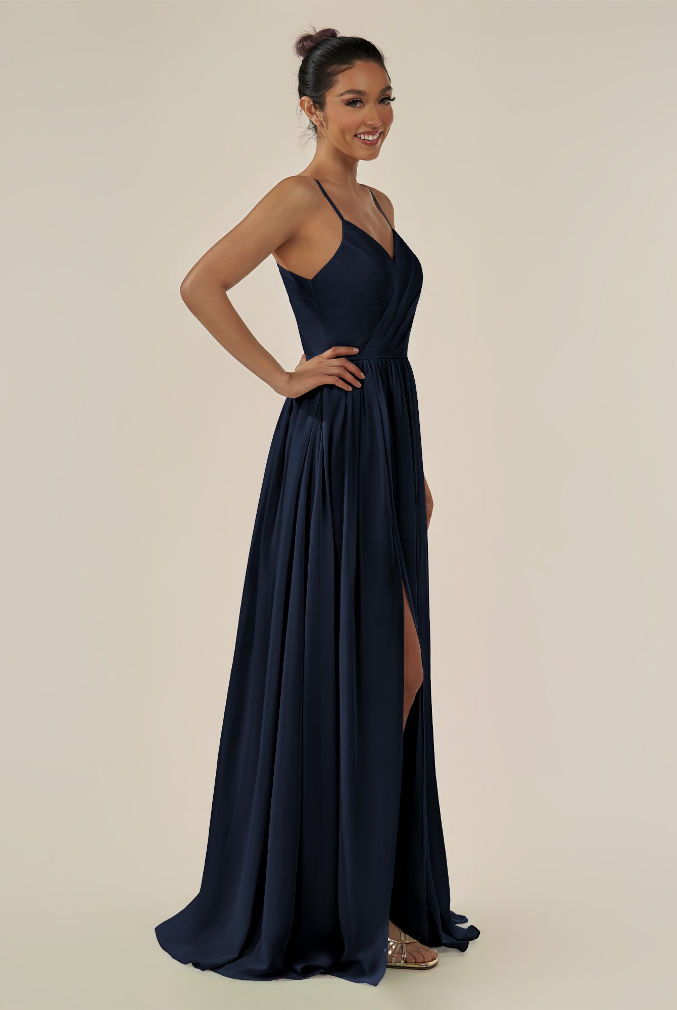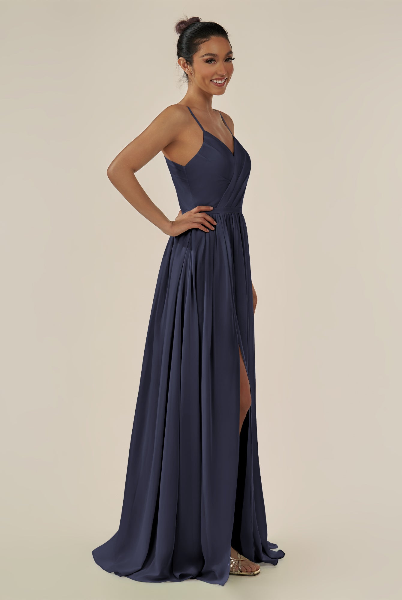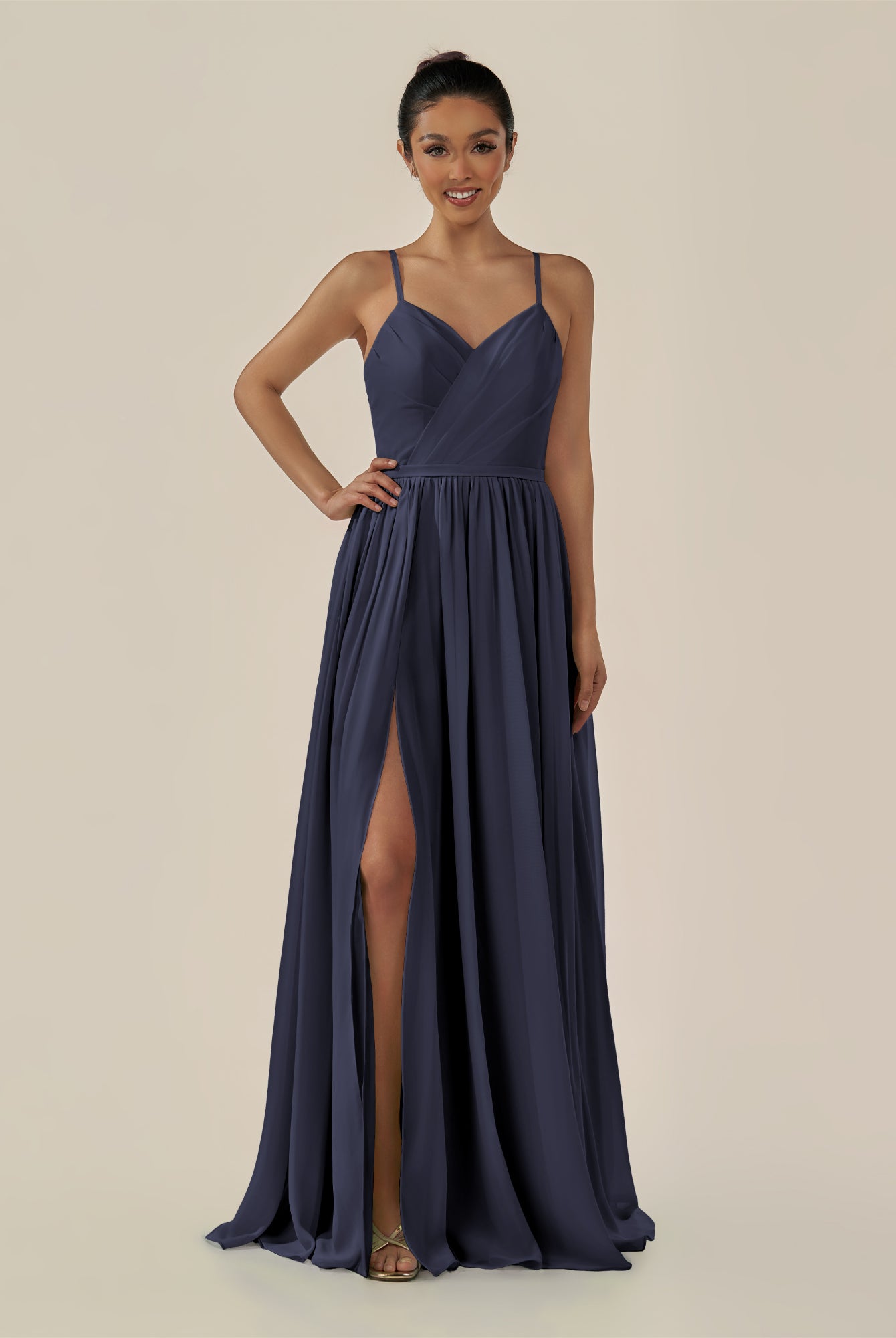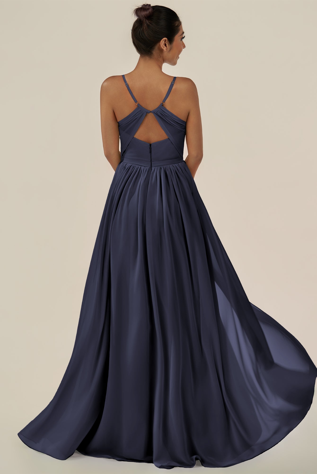 Irissa | Dark Navy - A Line Chiffon V Neck Pleated Long Bridesmaid Dress with Slit