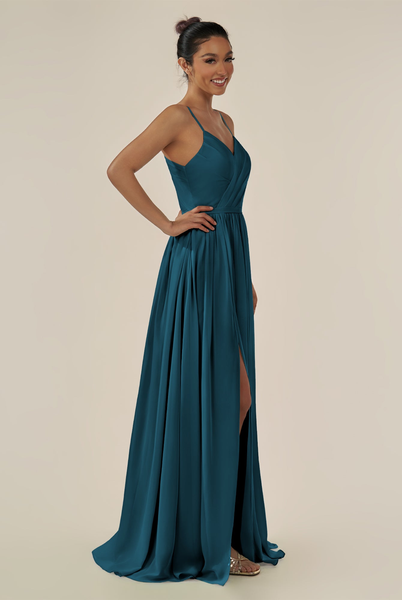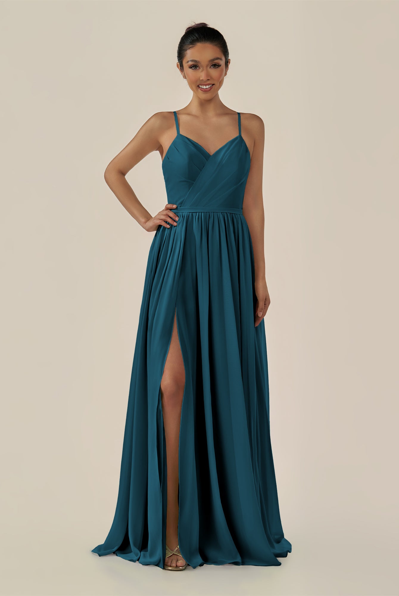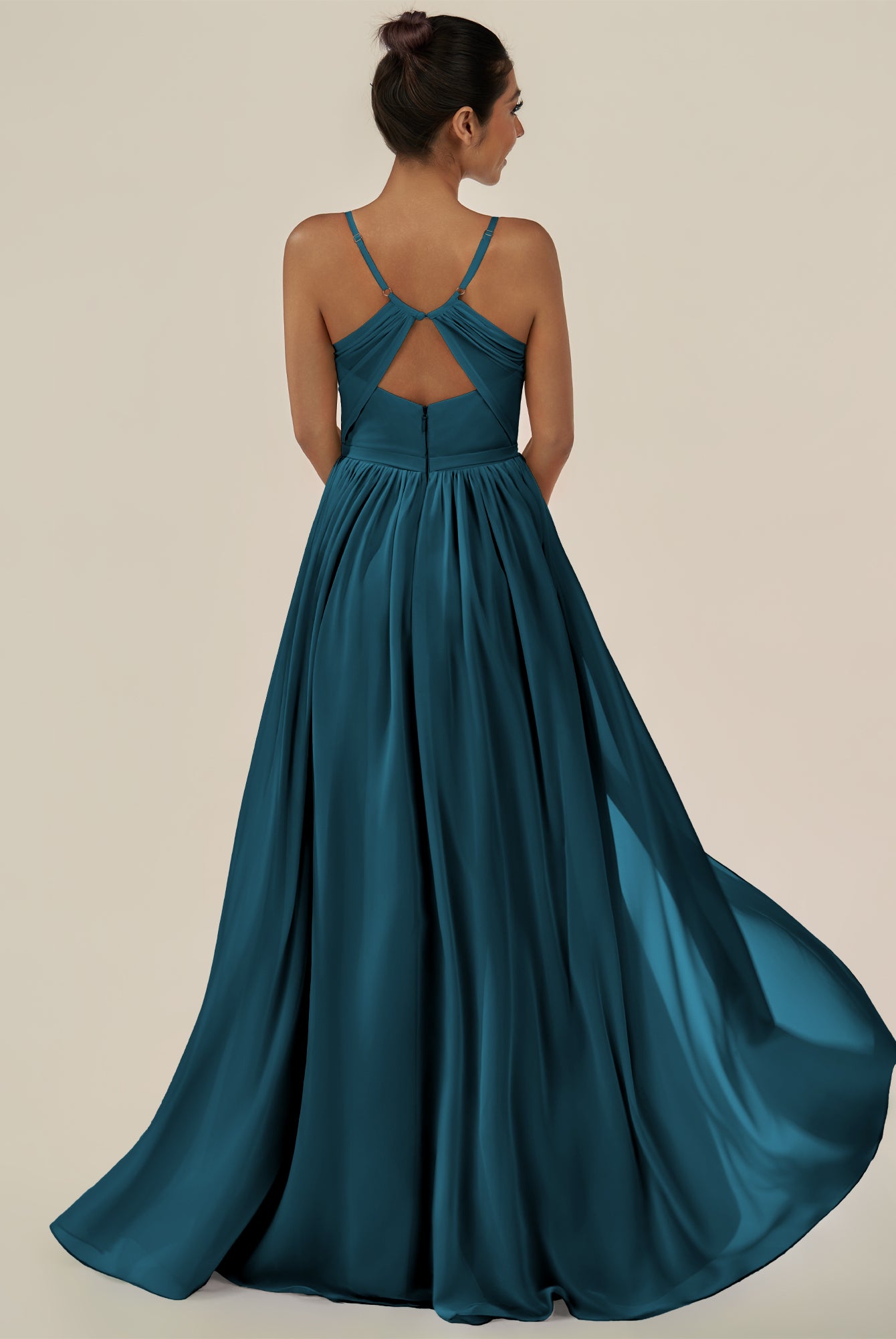 Irissa | Dark Teal - A Line Chiffon V Neck Pleated Long Bridesmaid Dress with Slit