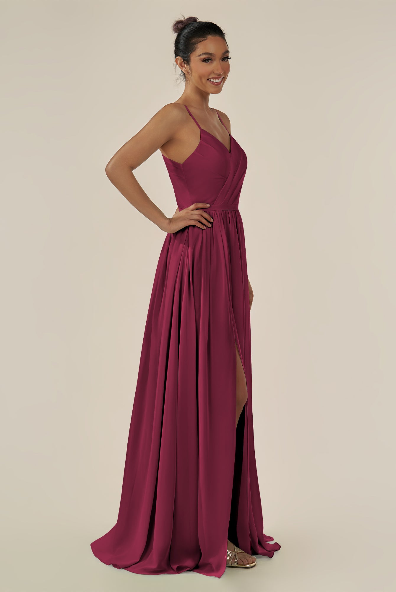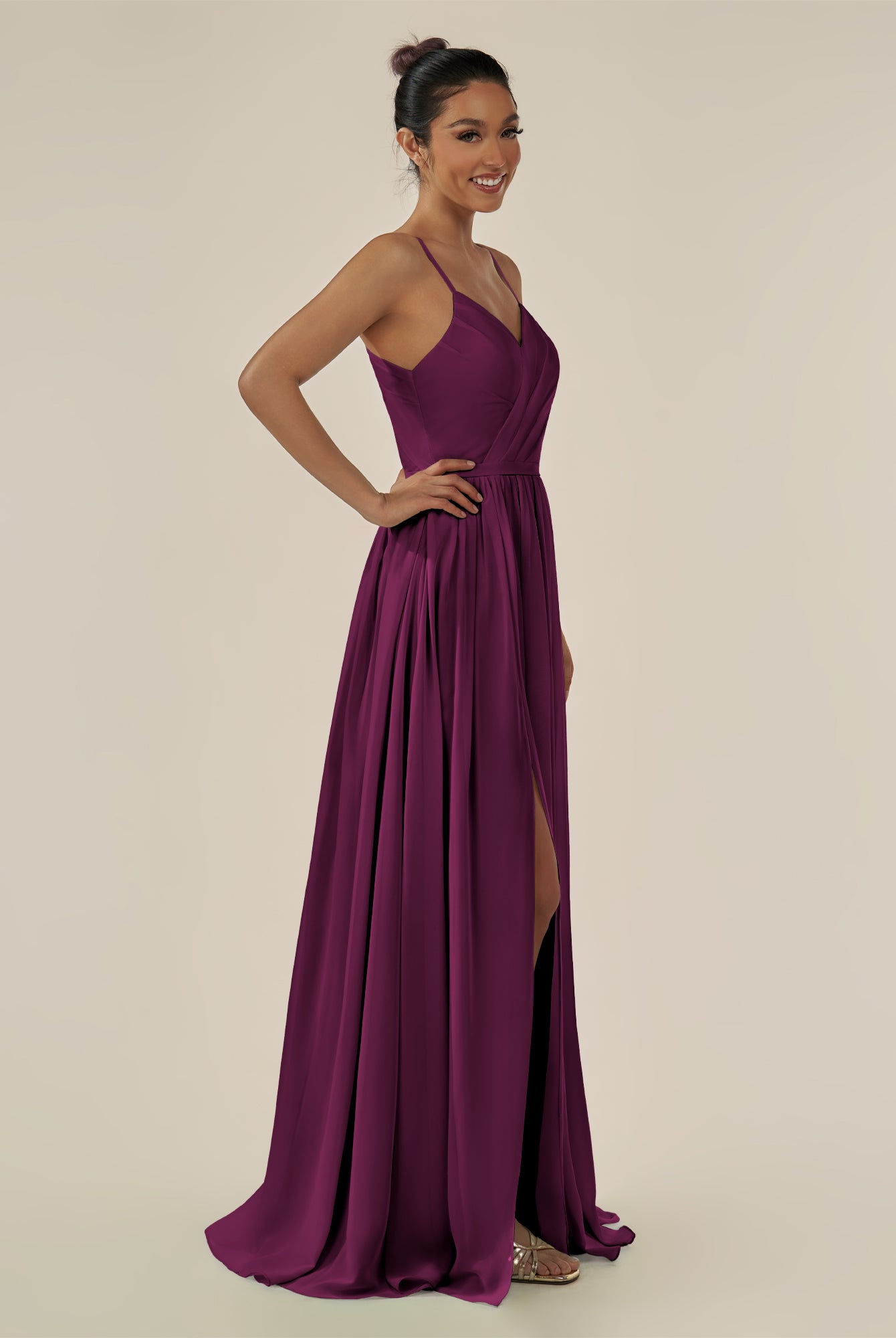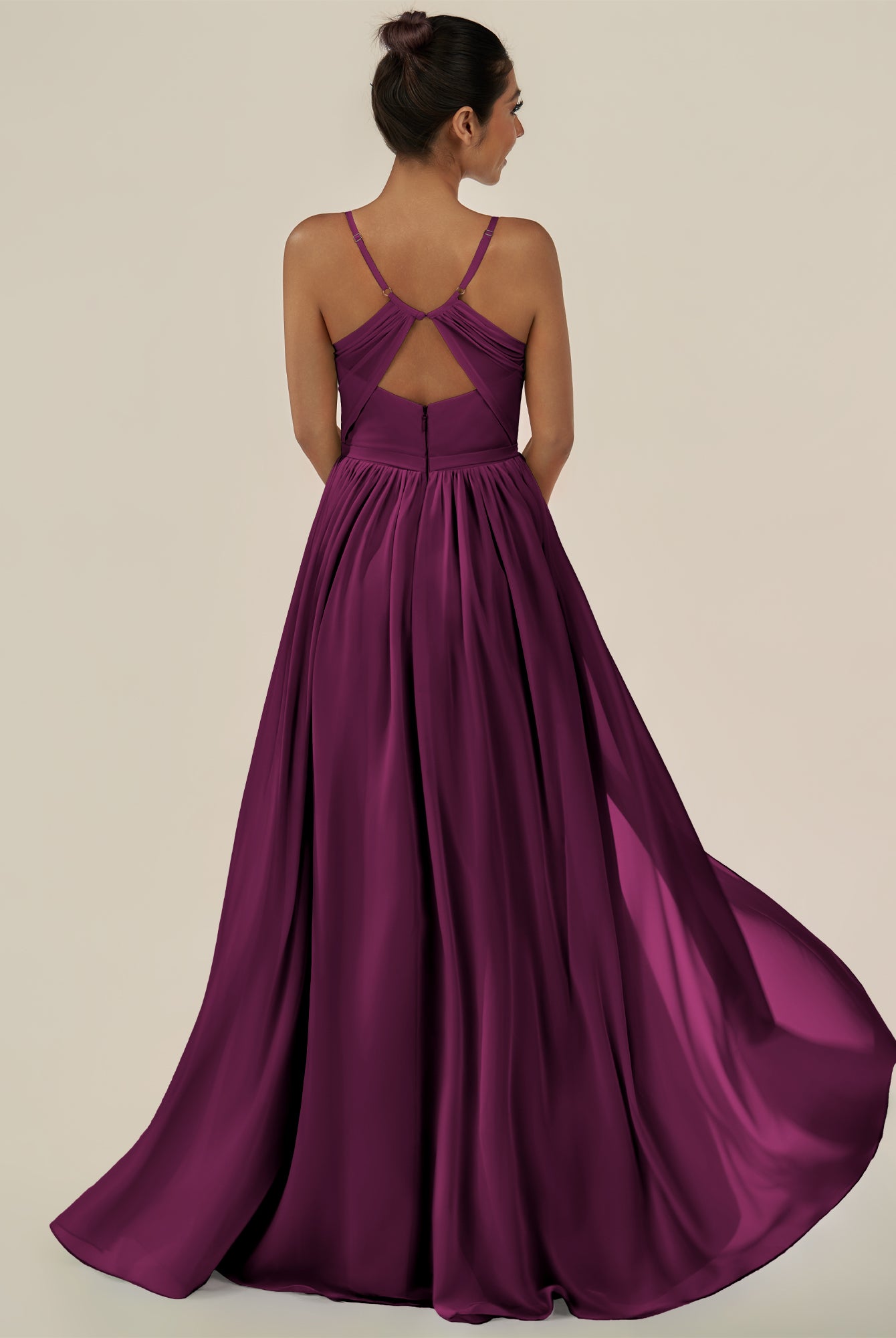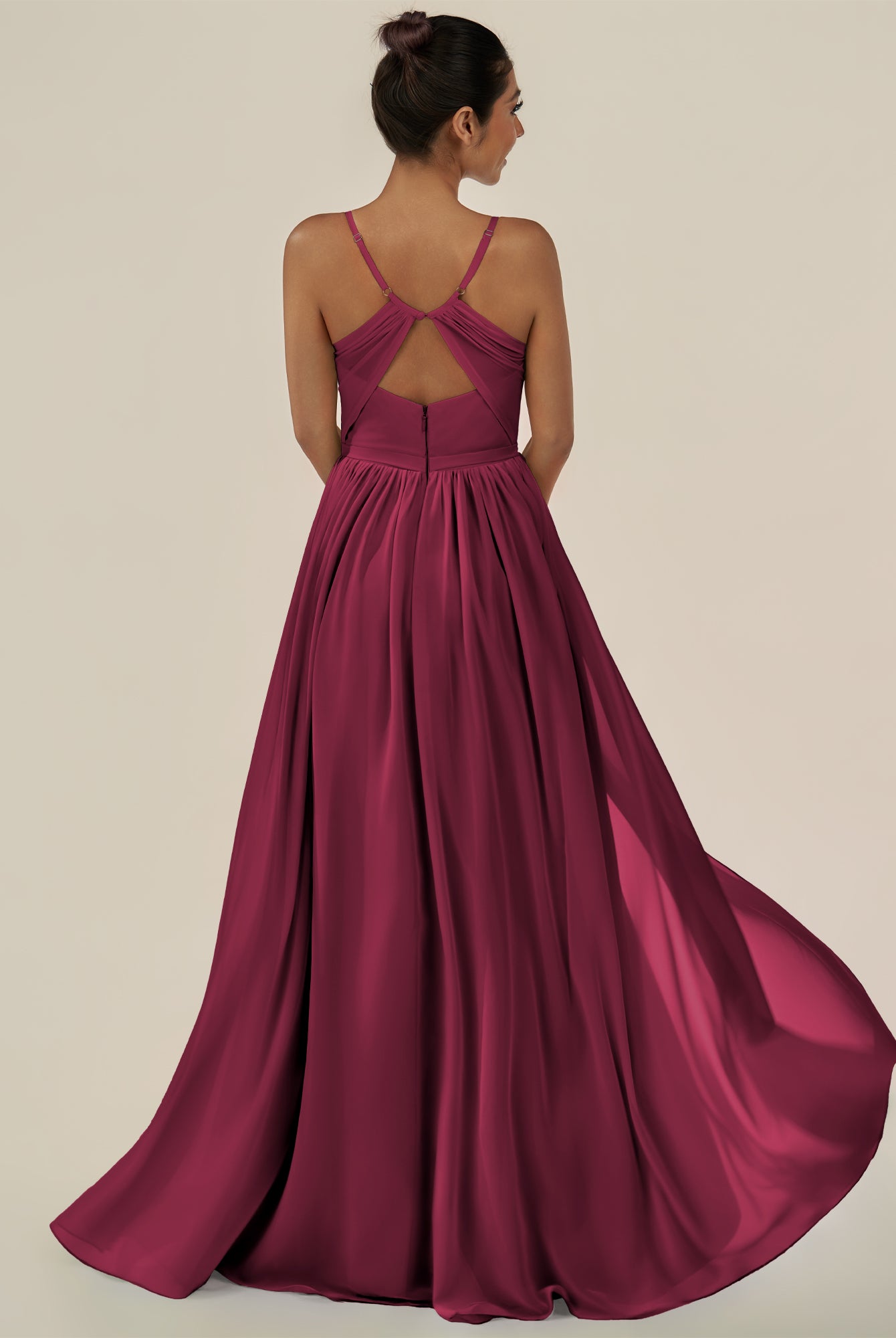 Irissa | Fig - A Line Chiffon V Neck Pleated Long Bridesmaid Dress with Slit