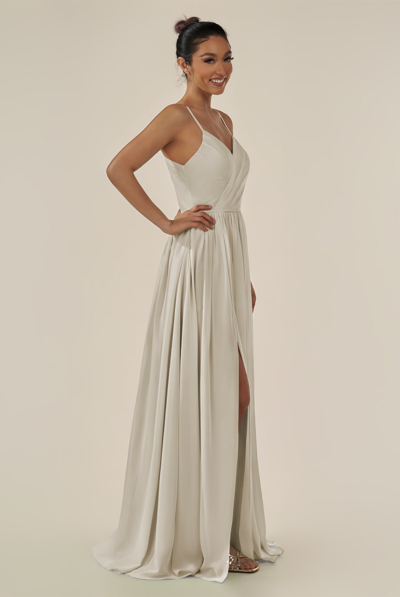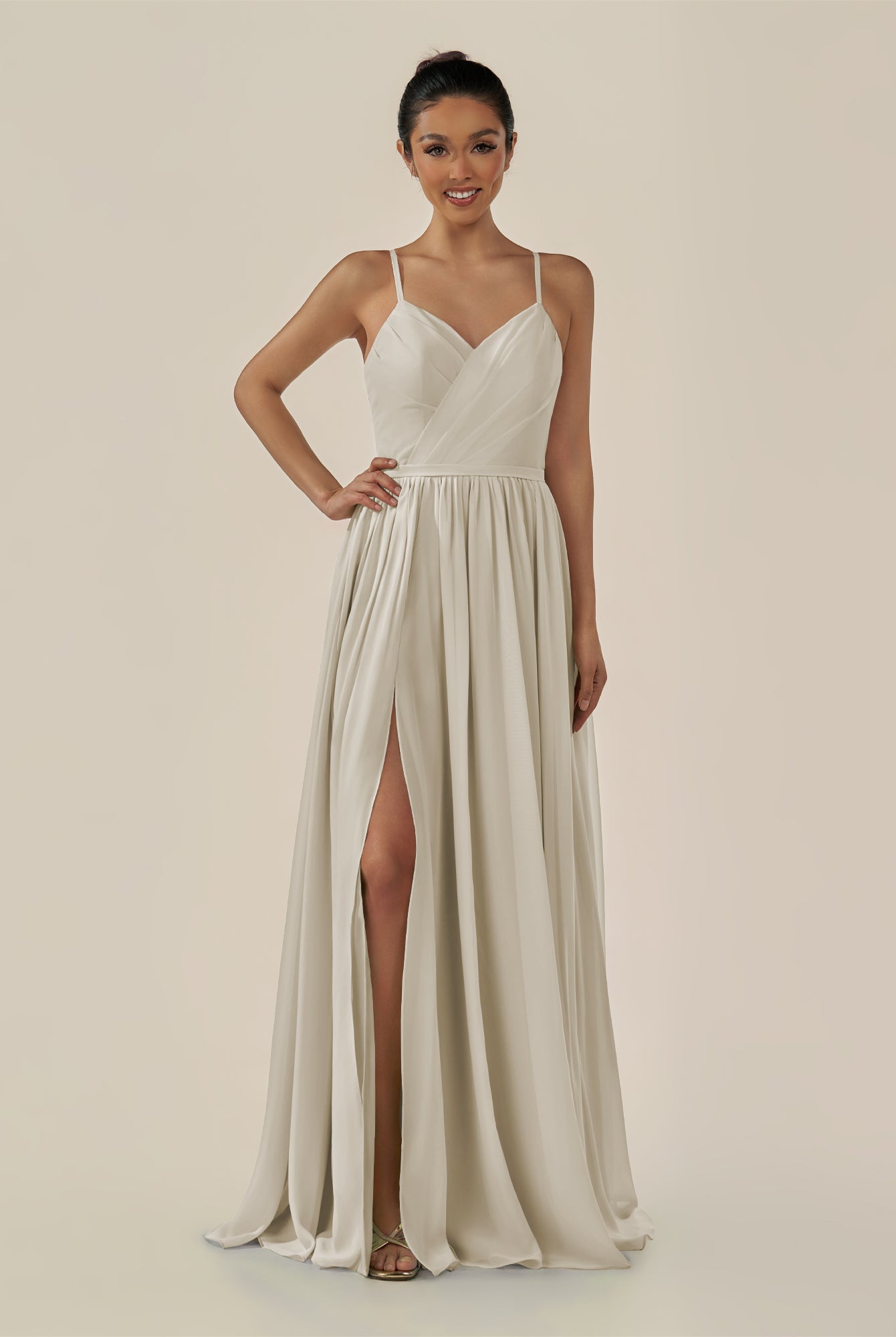 Irissa | Frost - A Line Chiffon V Neck Pleated Long Bridesmaid Dress with Slit