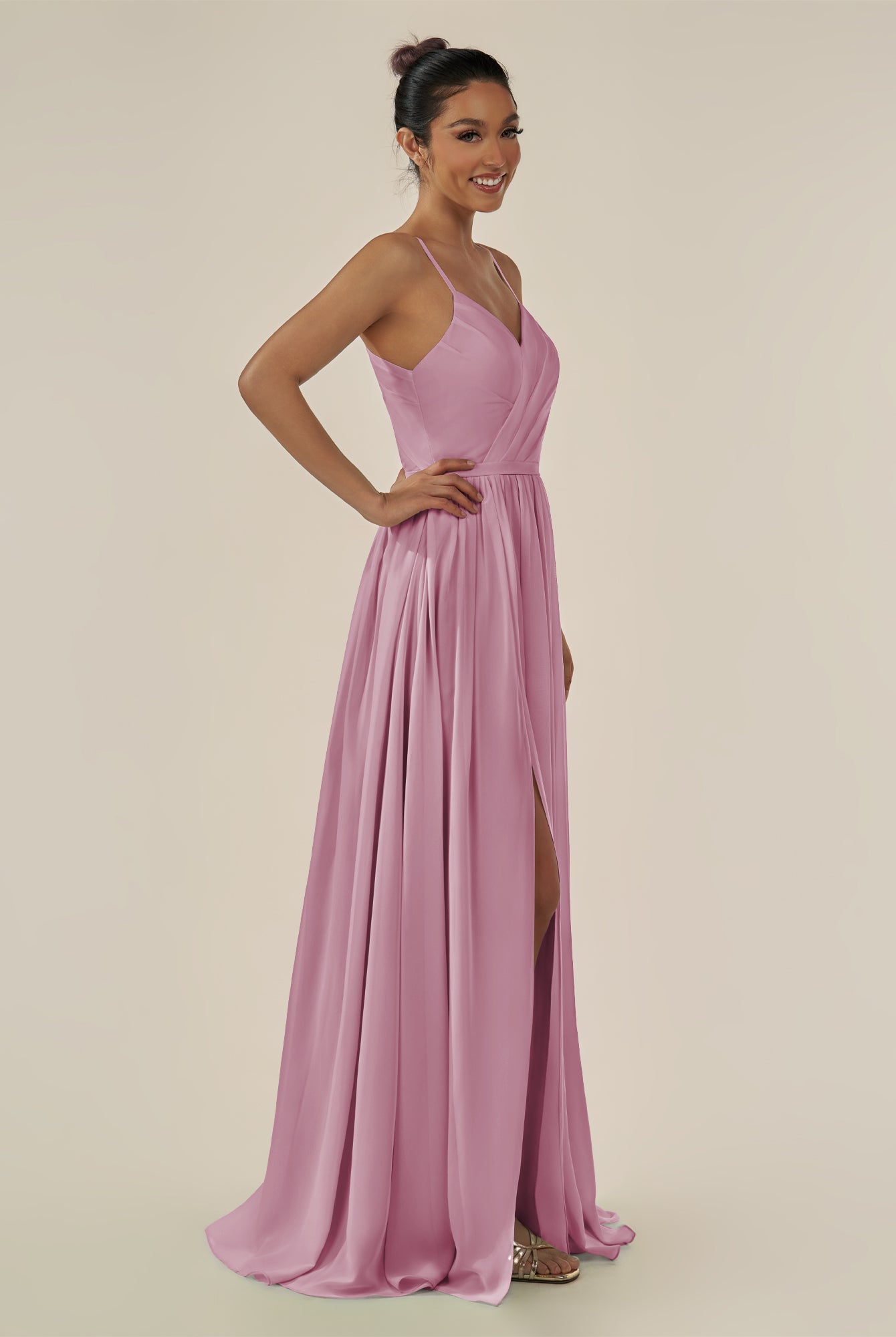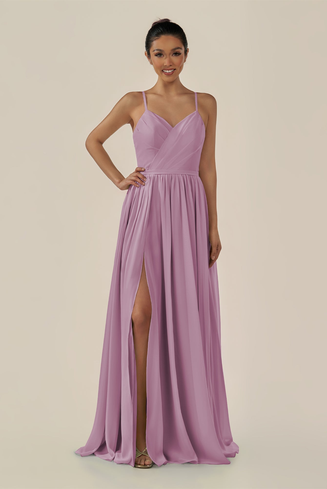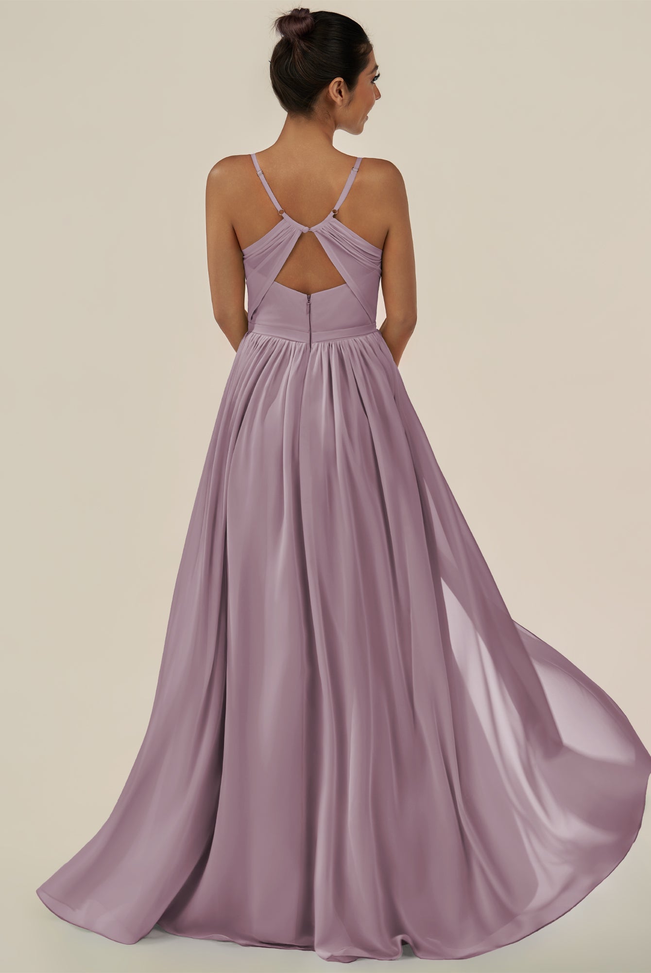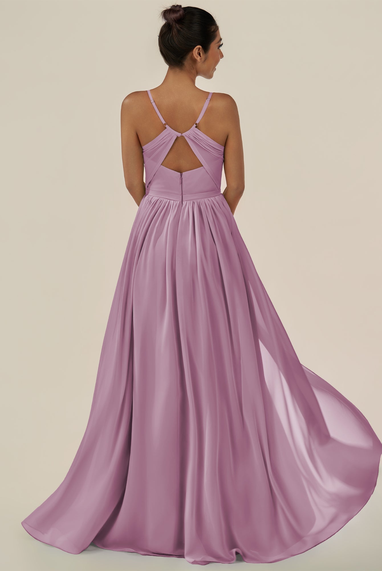 Irissa | Vintage Mauve - A Line Chiffon V Neck Pleated Long Bridesmaid Dress with Slit