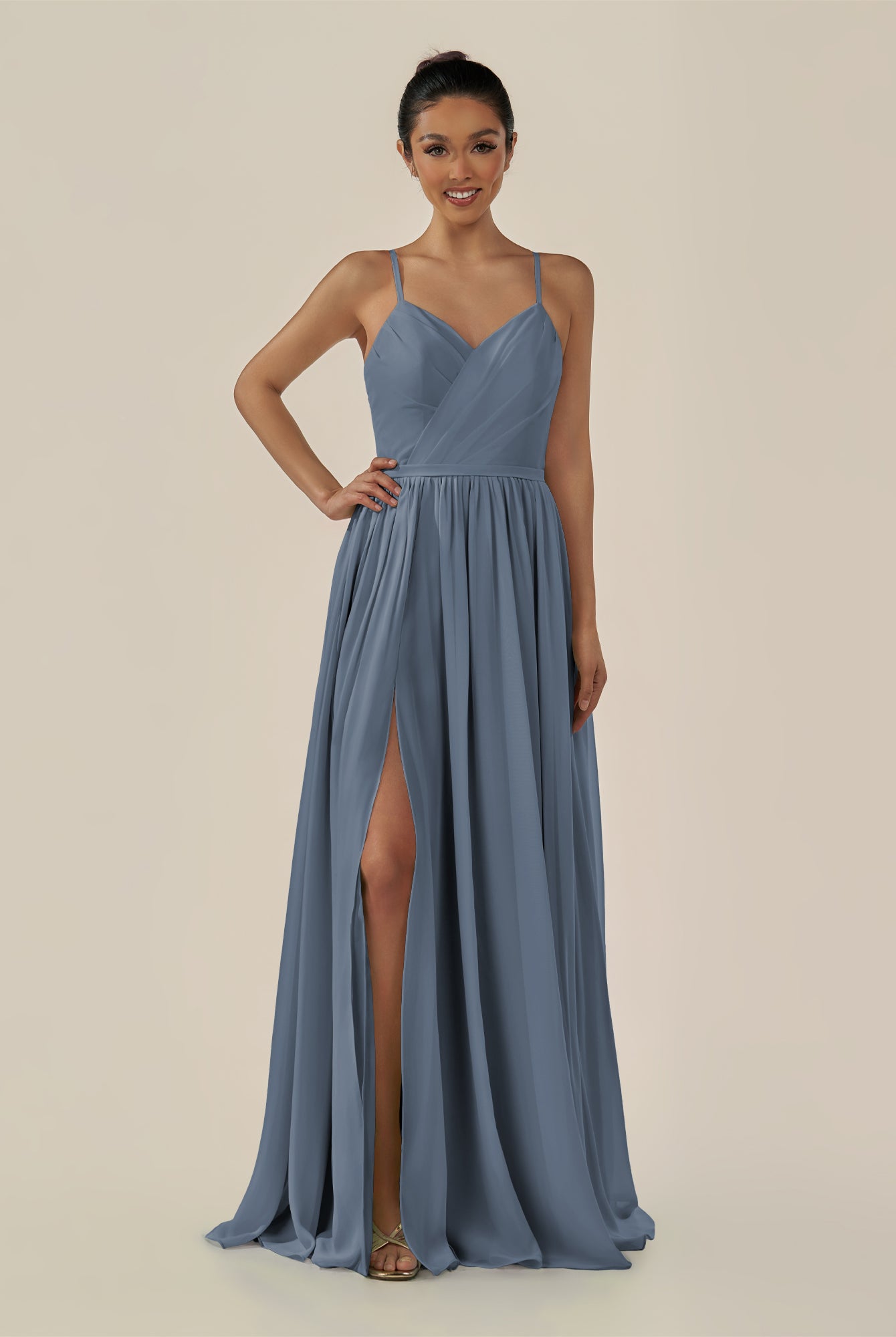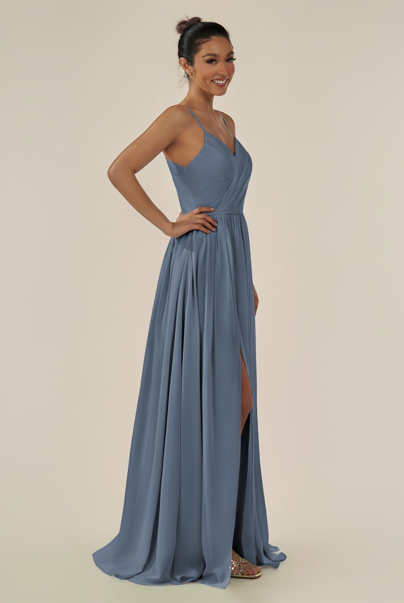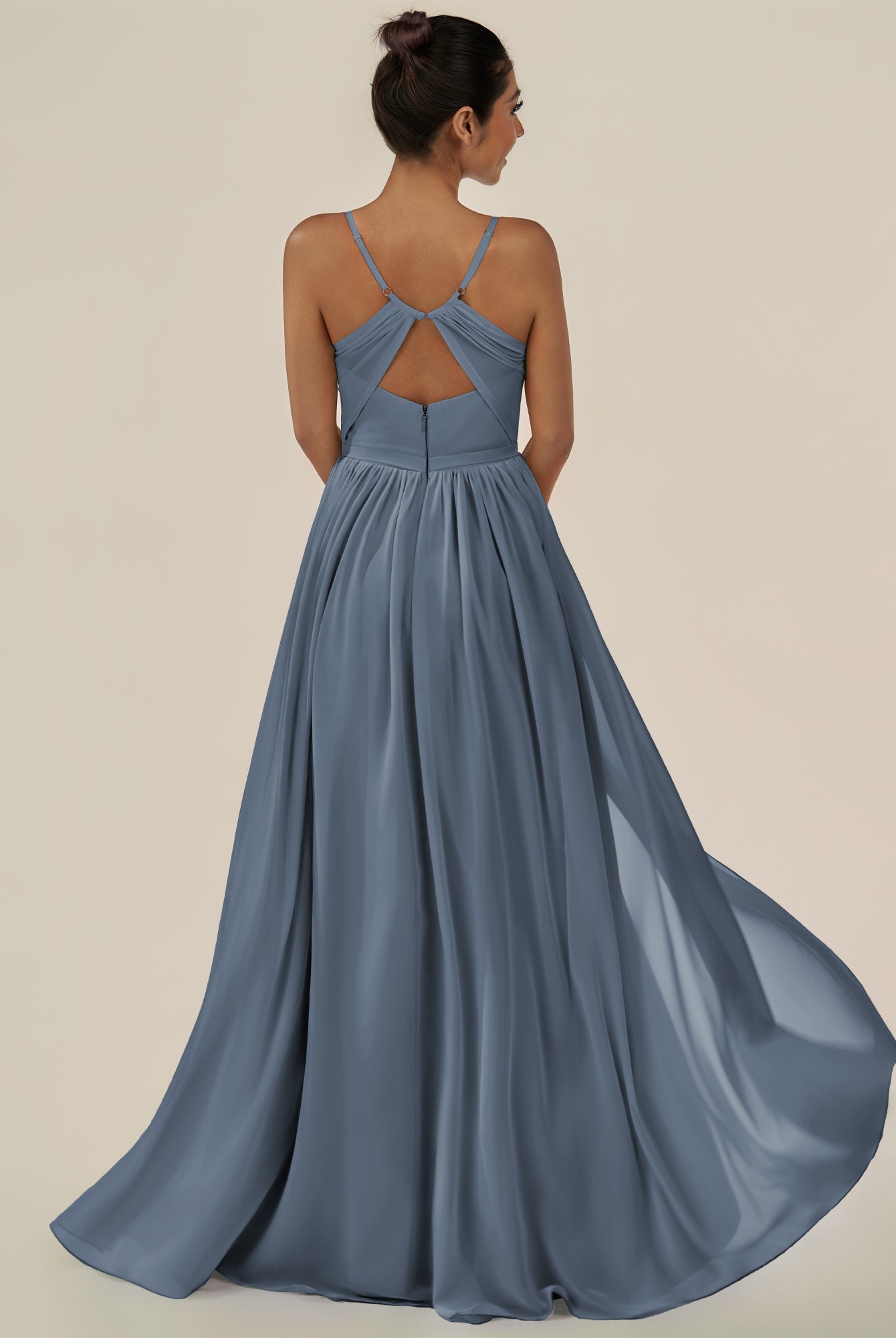 Irissa | Dusk Blue - A Line Chiffon V Neck Pleated Long Bridesmaid Dress with Slit