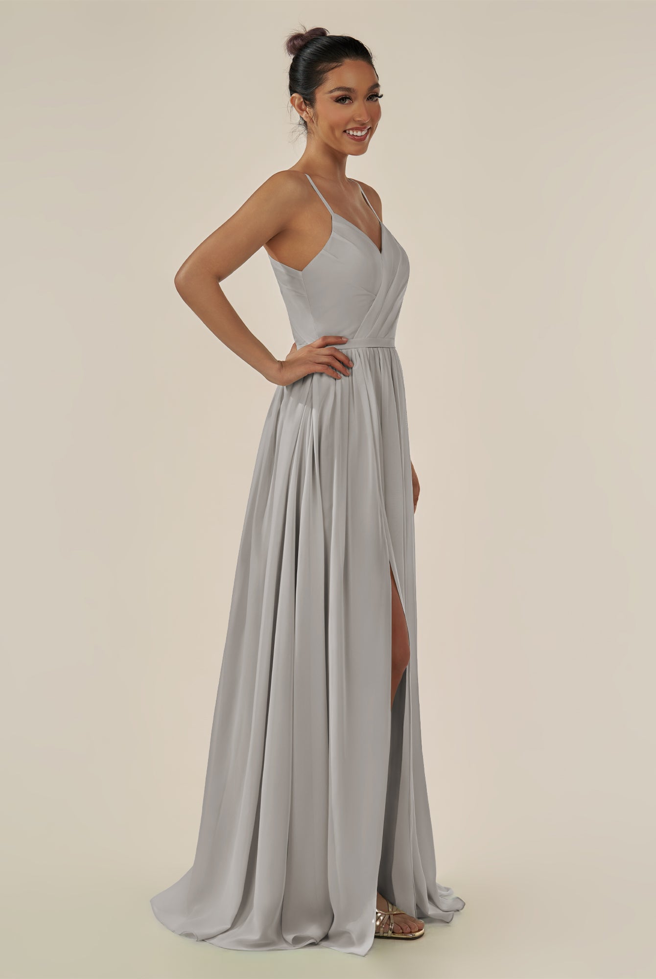 Irissa | Silver - A Line Chiffon V Neck Pleated Long Bridesmaid Dress with Slit