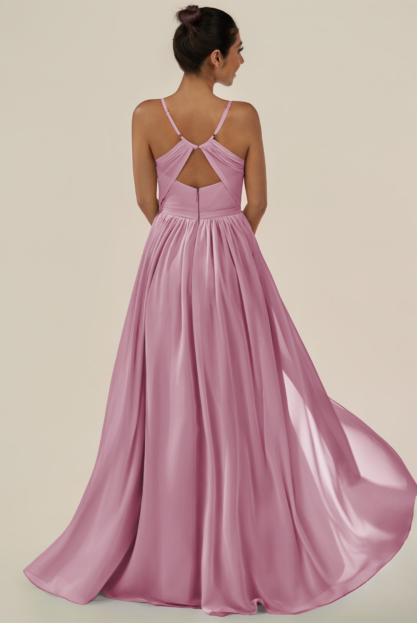 Irissa | Desert Rose - A Line Chiffon V Neck Pleated Long Bridesmaid Dress with Slit