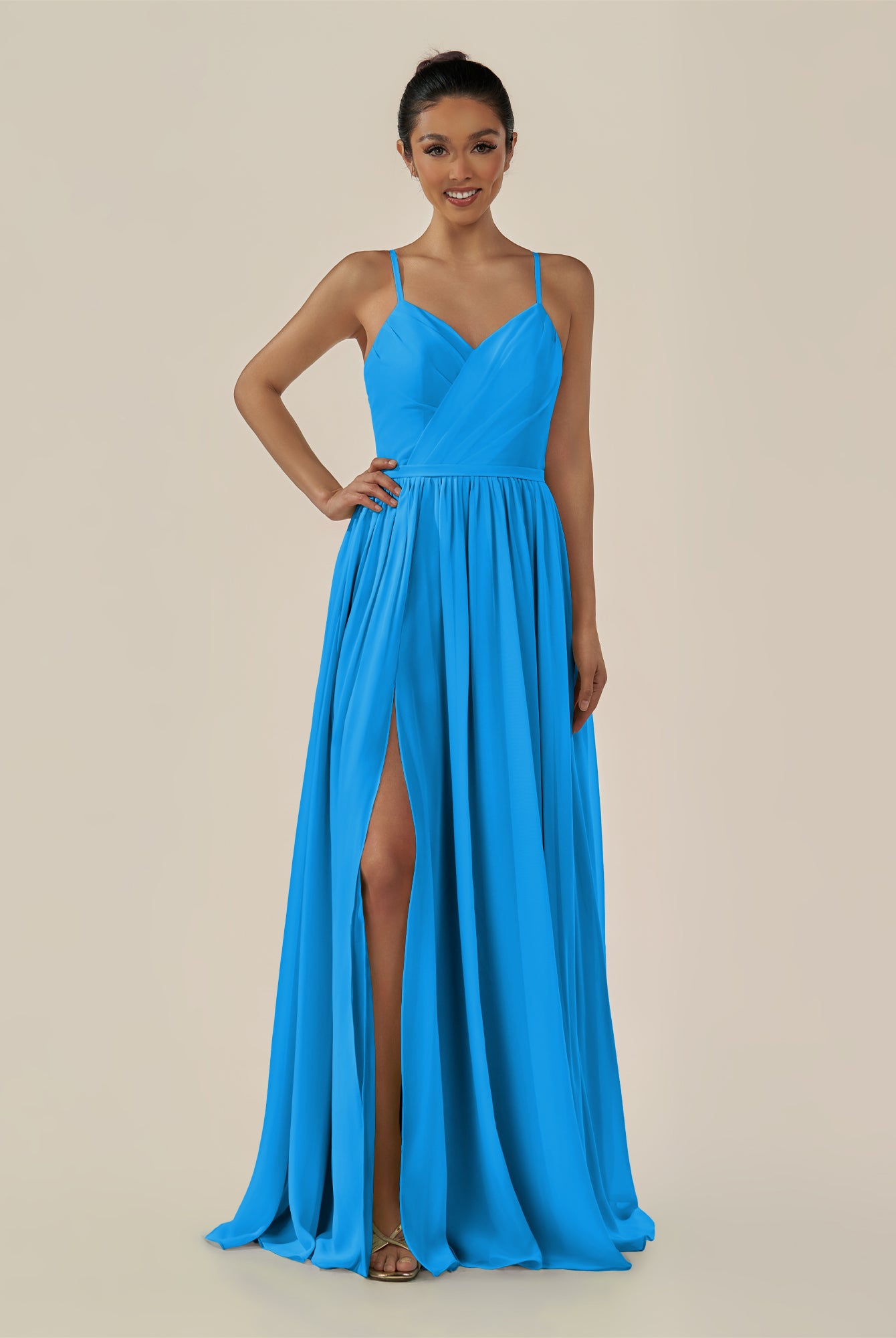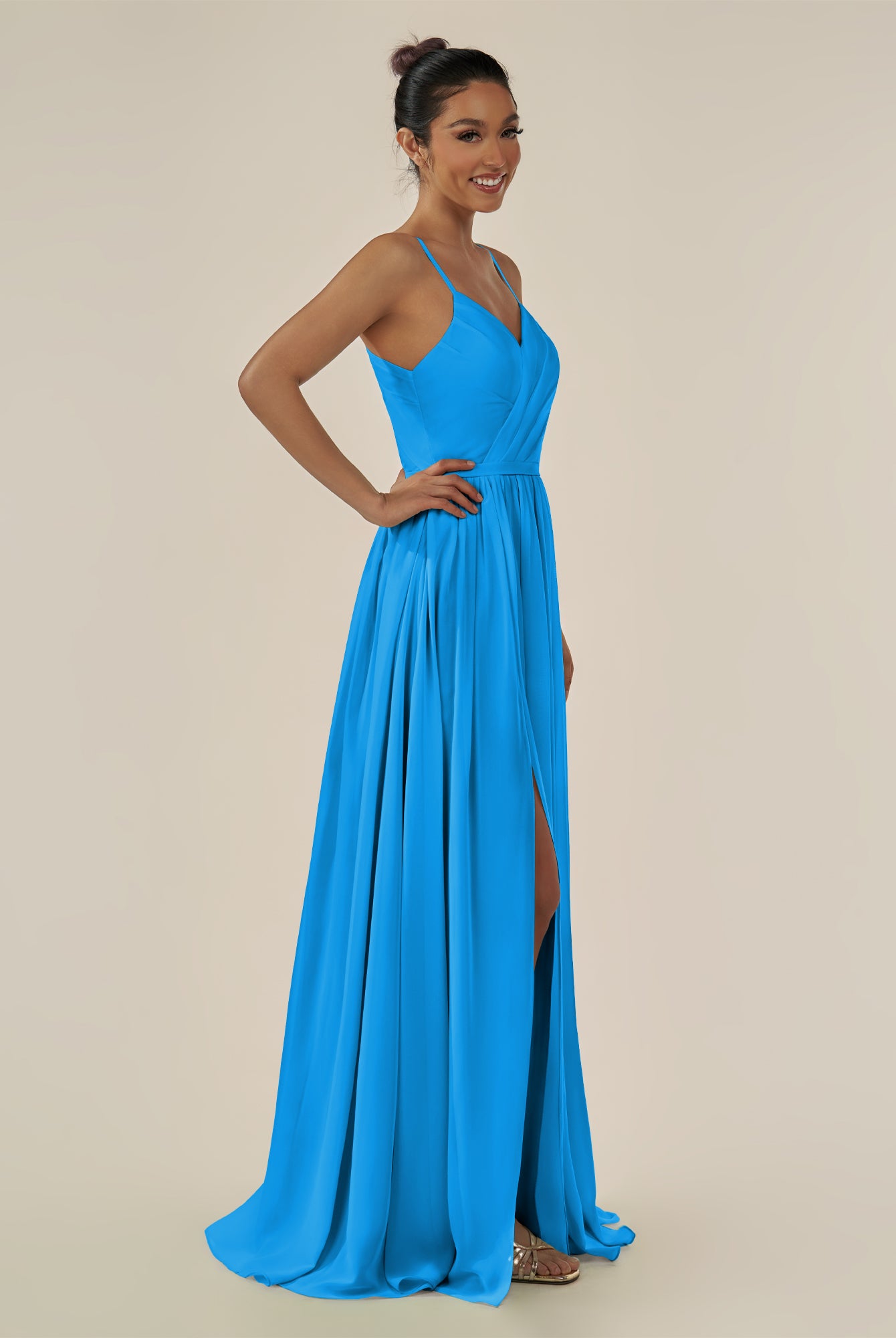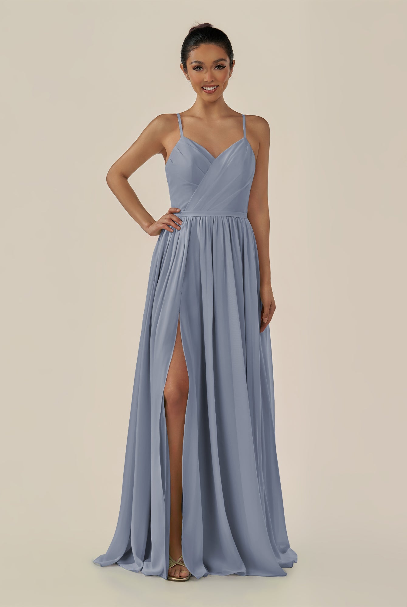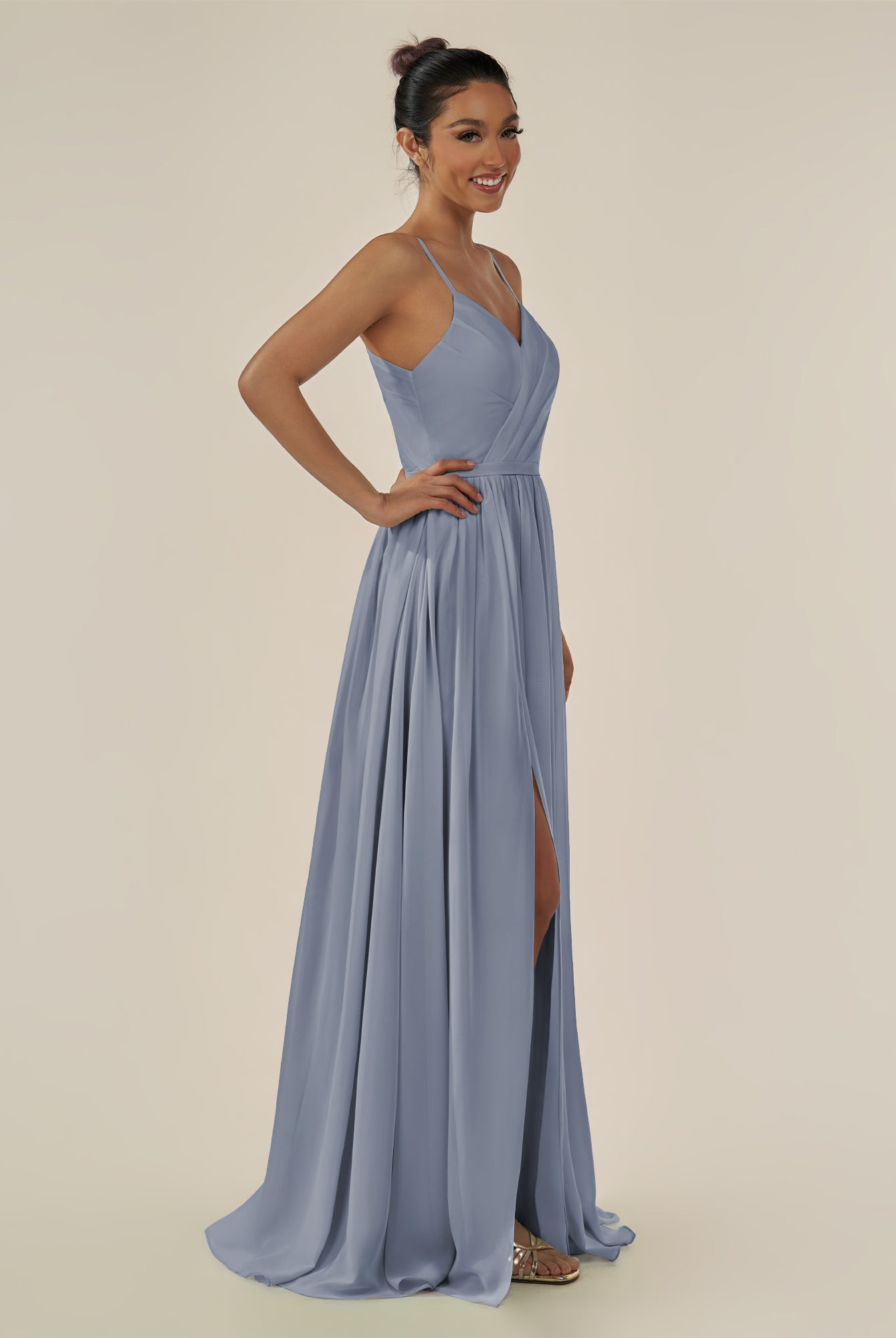 Irissa | Blue Jay - A Line Chiffon V Neck Pleated Long Bridesmaid Dress with Slit