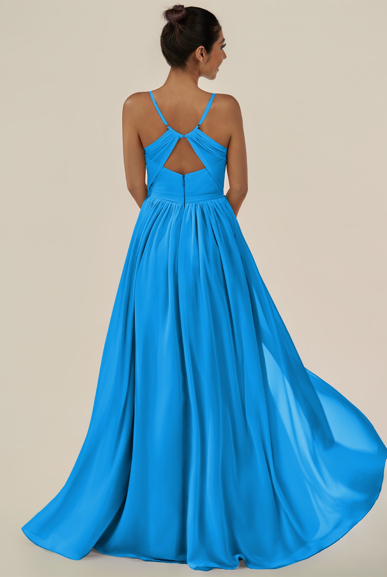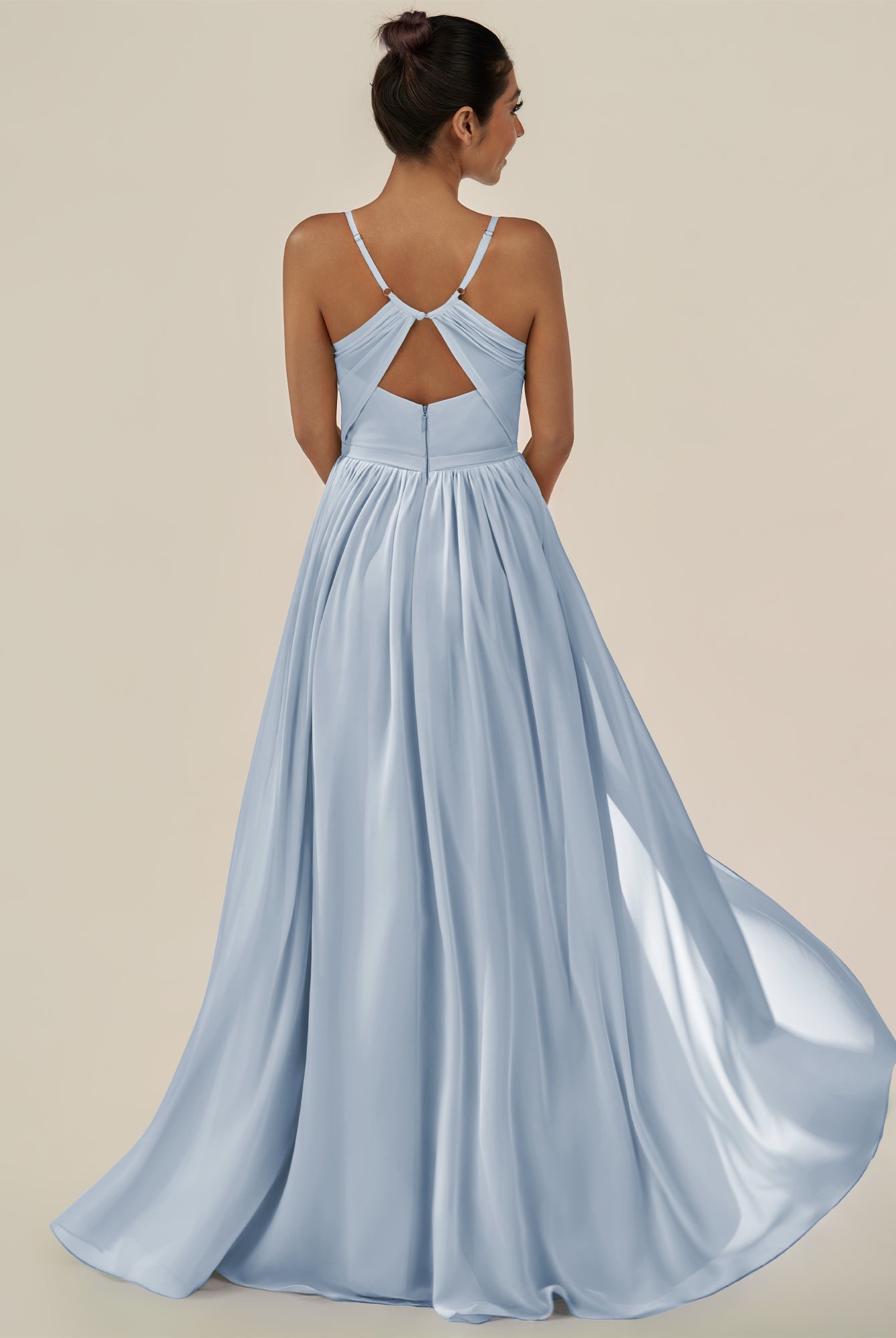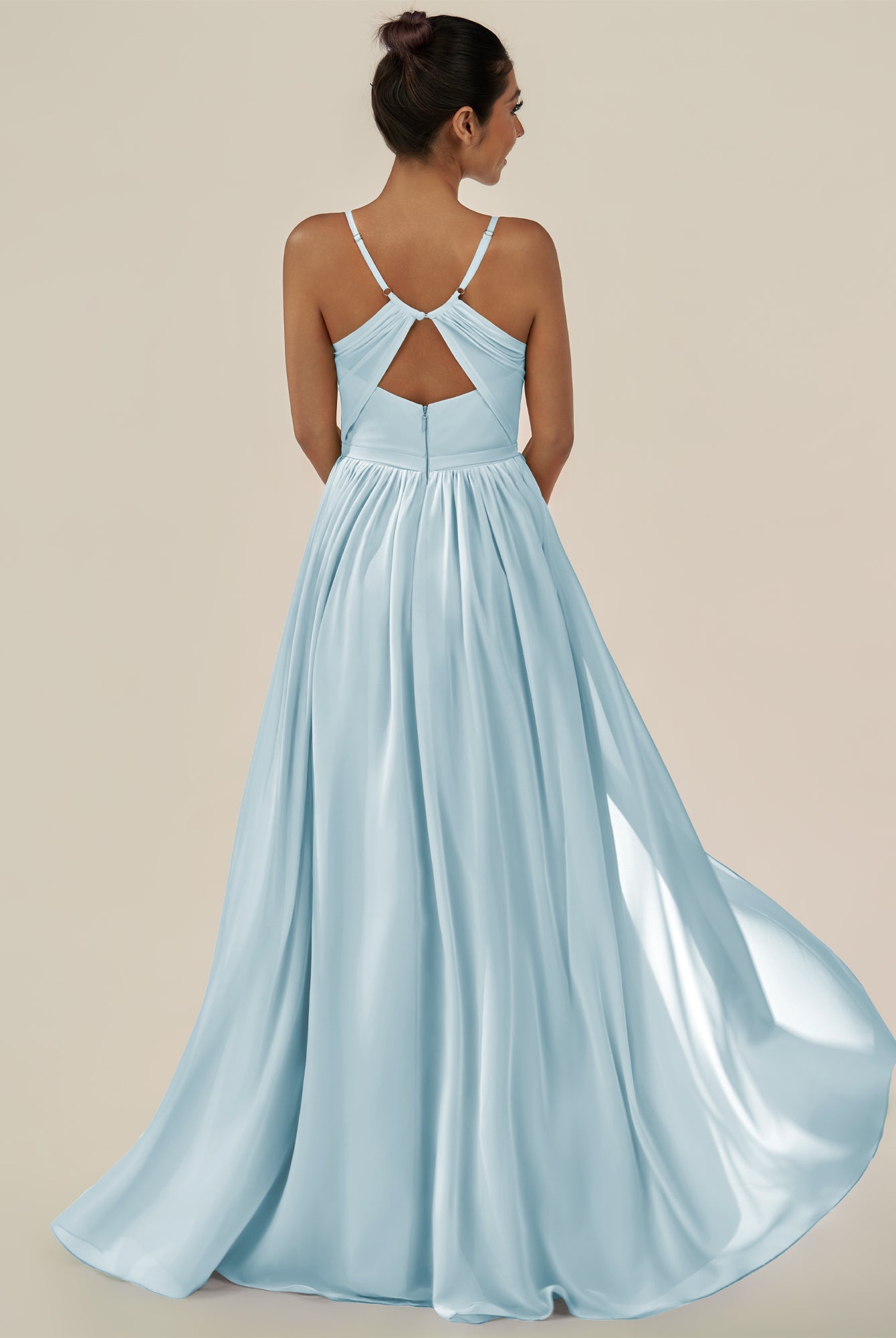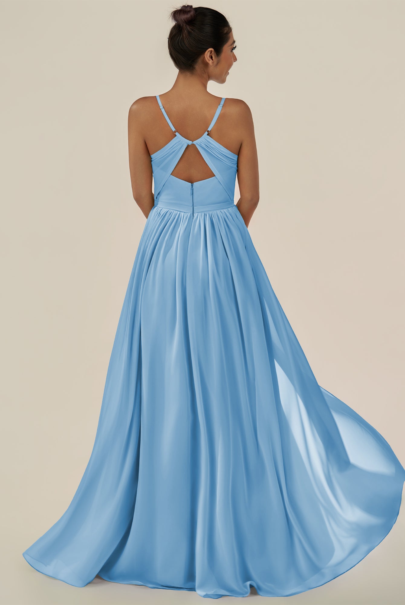 Irissa | Sky Blue - A Line Chiffon V Neck Pleated Long Bridesmaid Dress with Slit