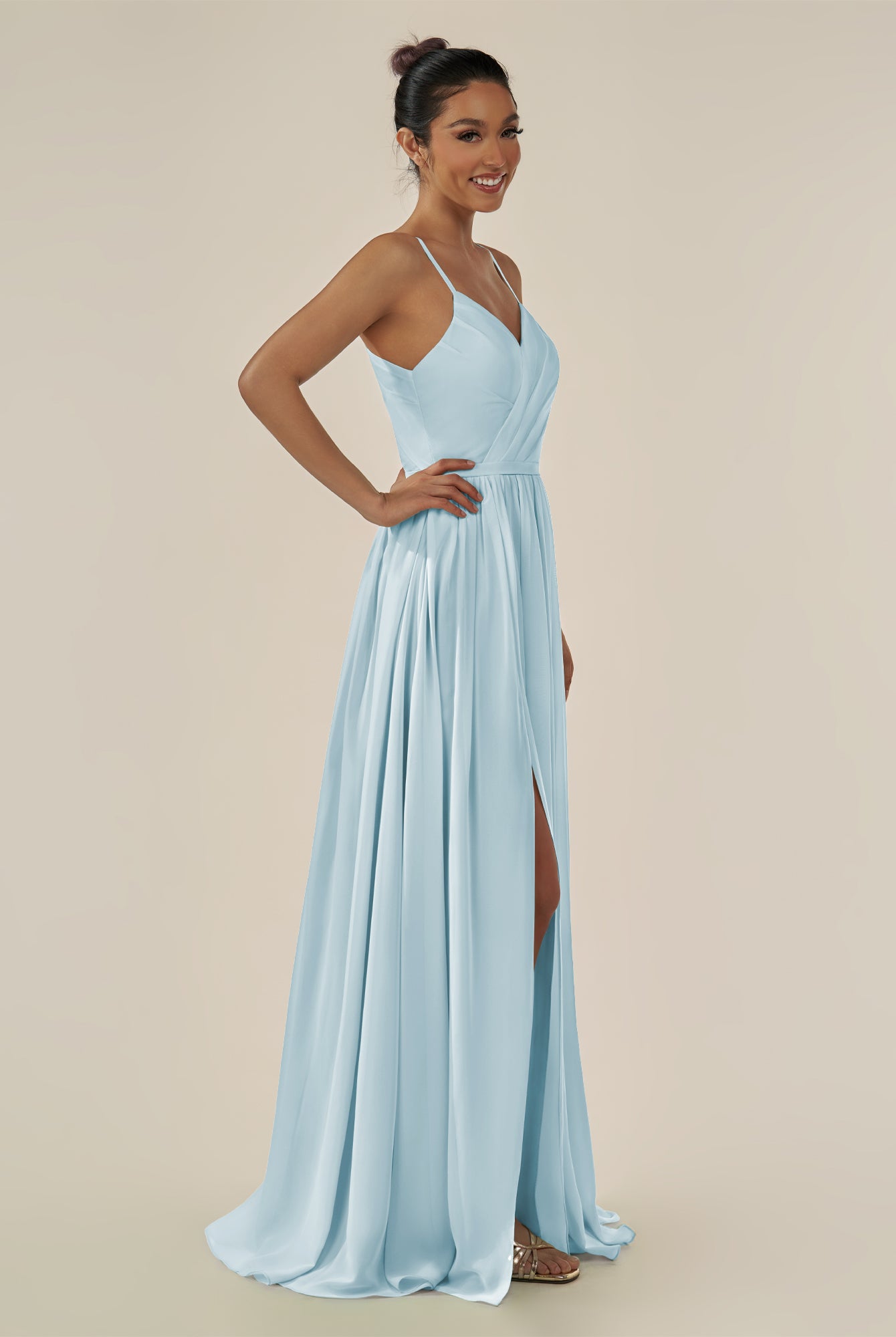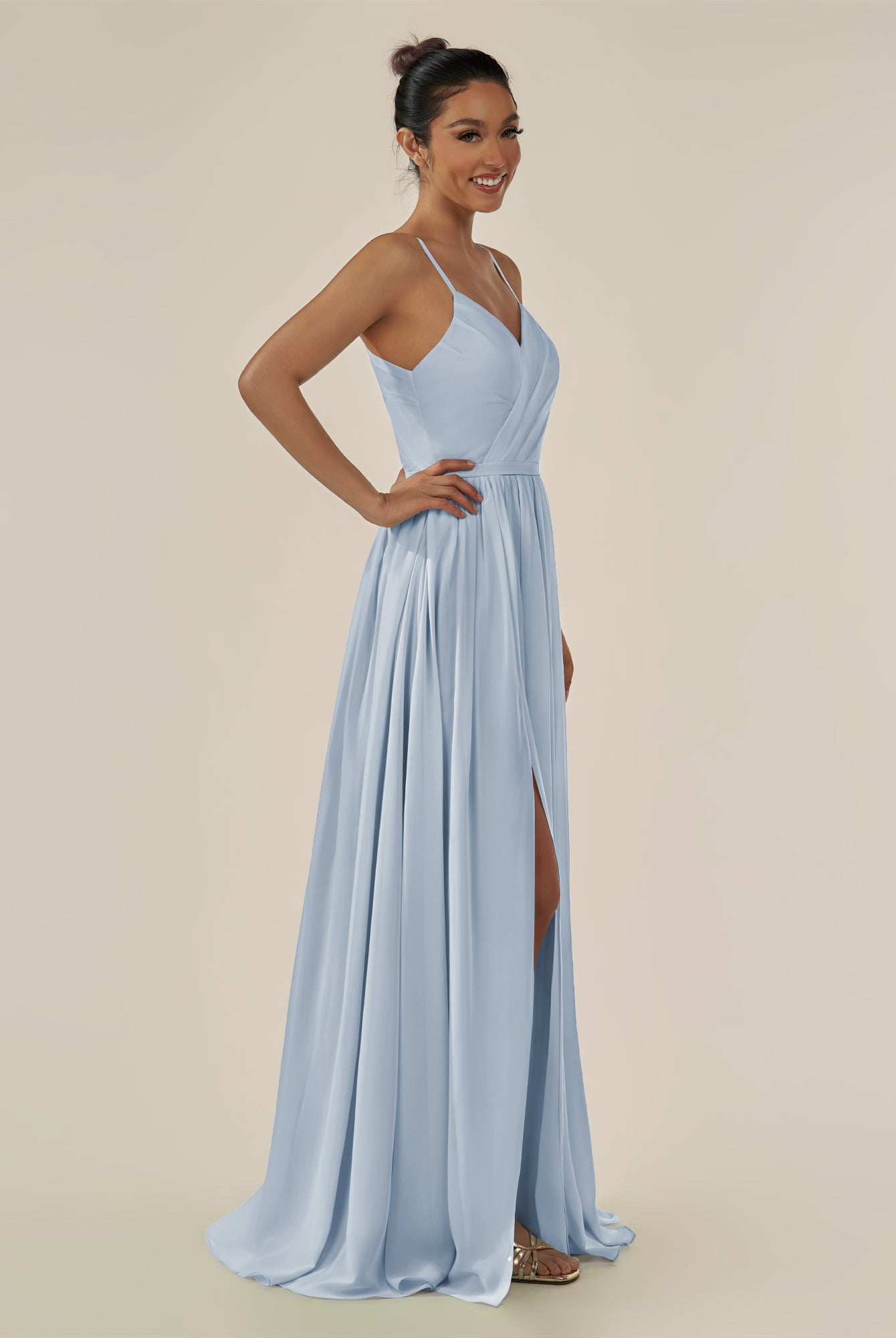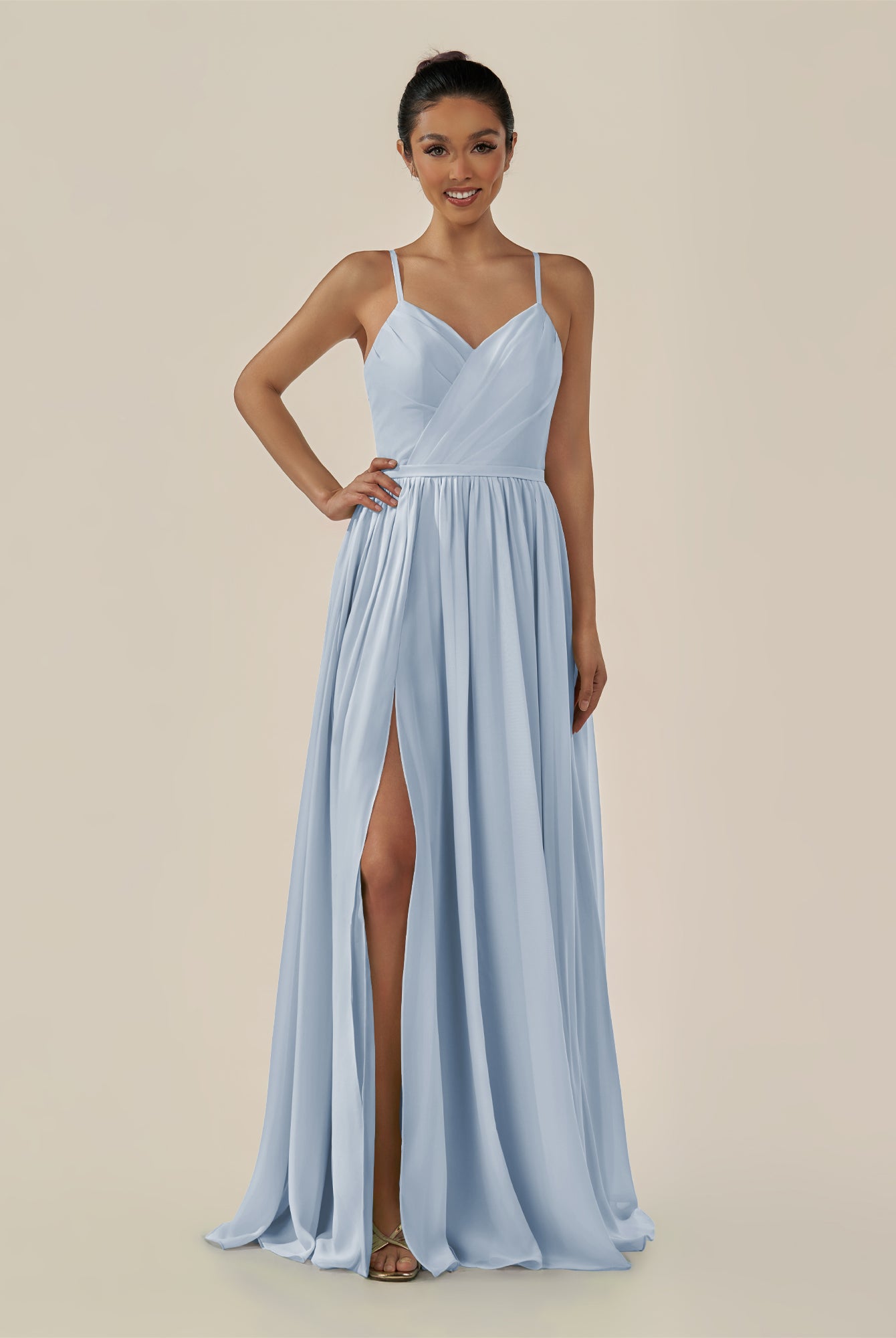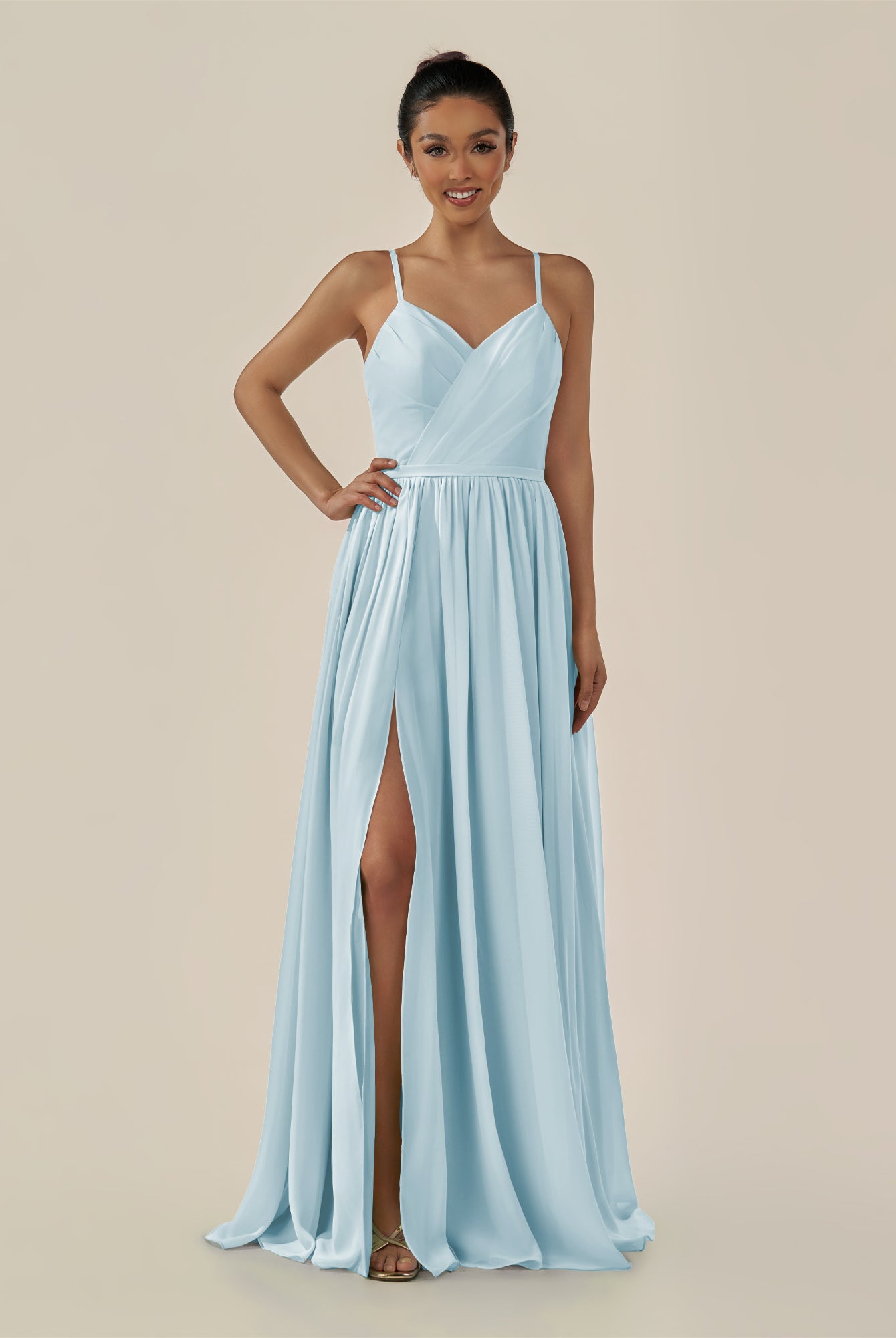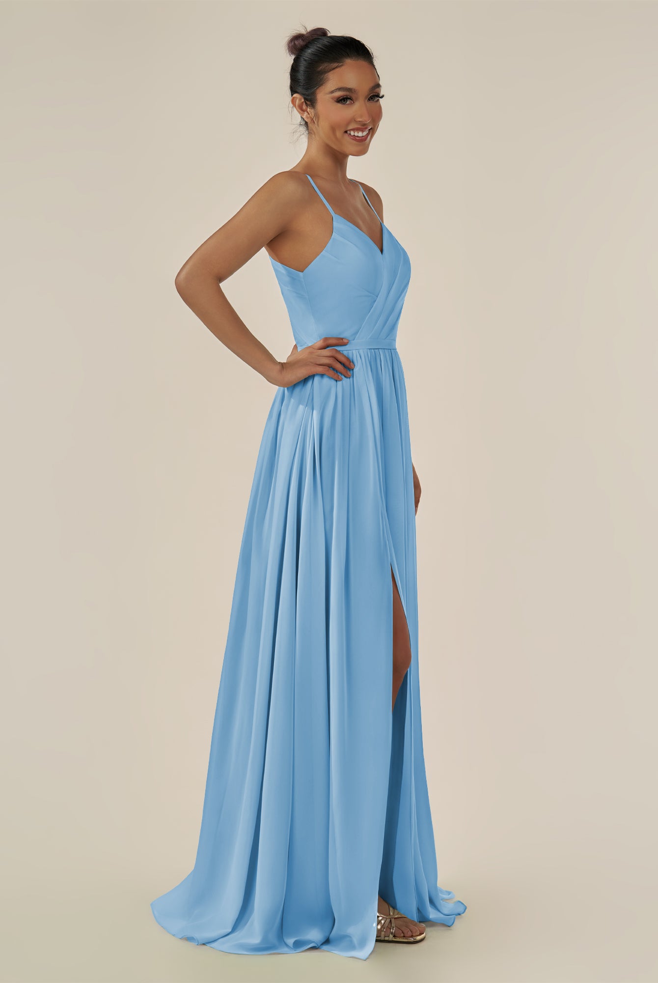 Irissa | Sky Blue - A Line Chiffon V Neck Pleated Long Bridesmaid Dress with Slit