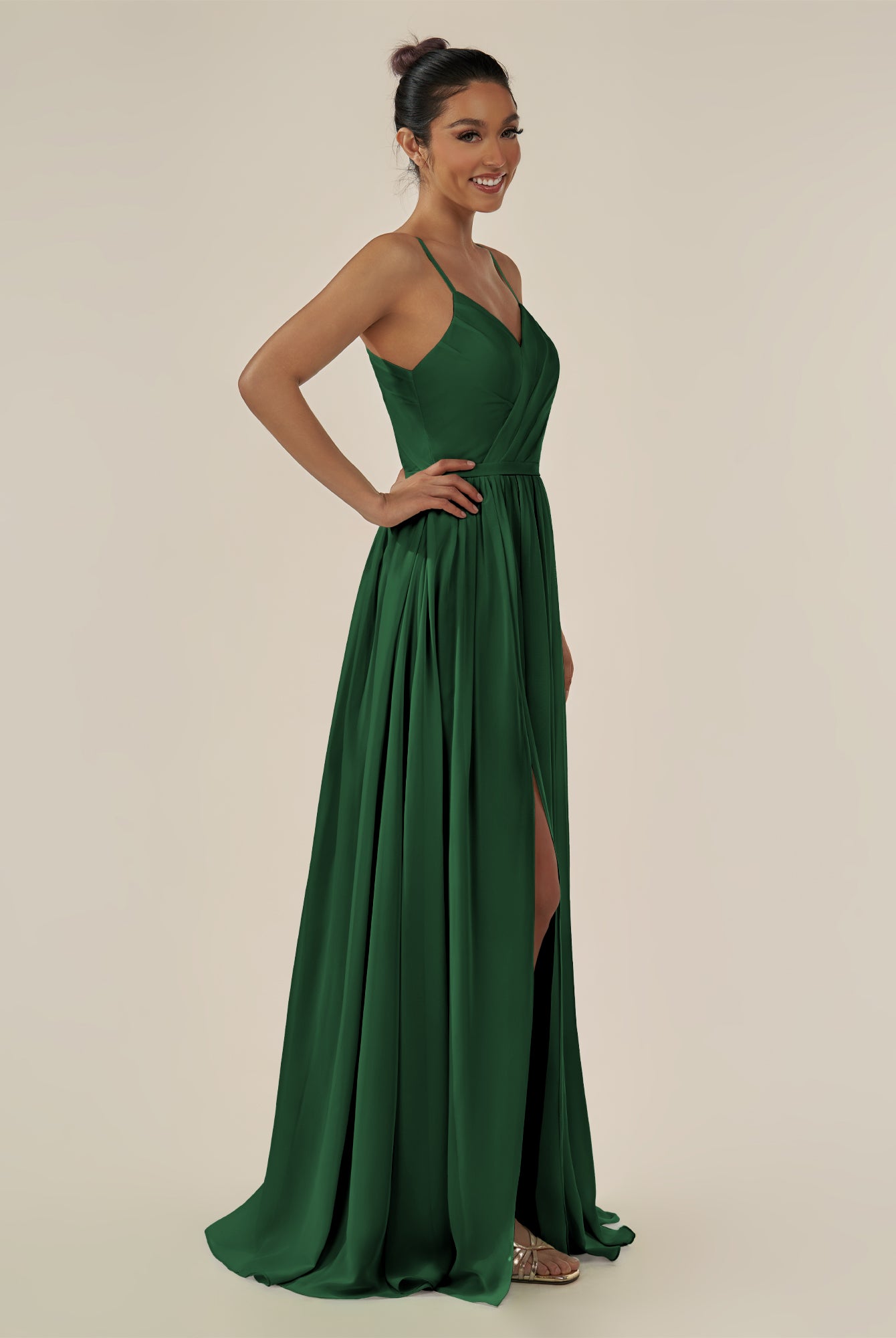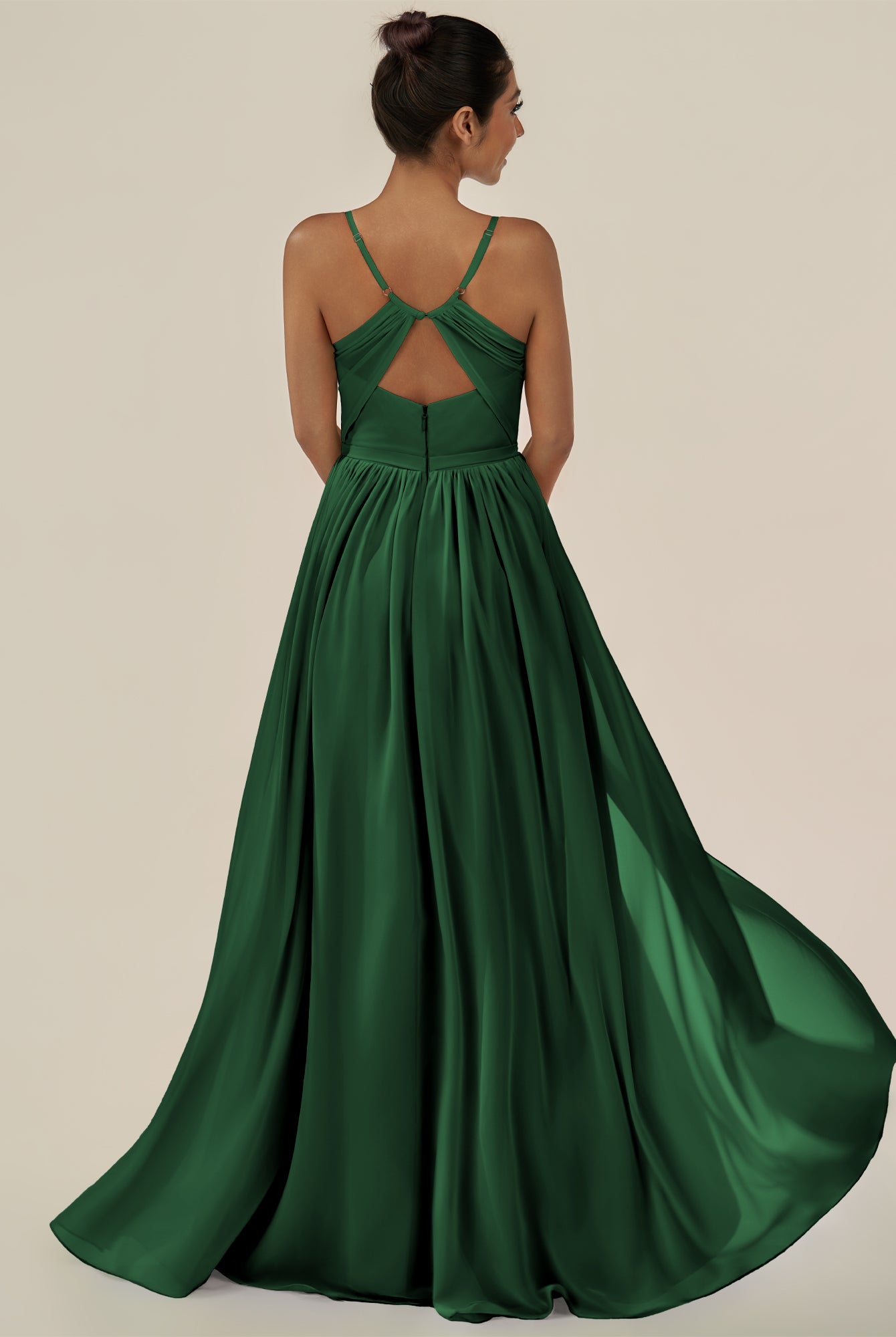 Irissa | Dark Green - A Line Chiffon V Neck Pleated Long Bridesmaid Dress with Slit