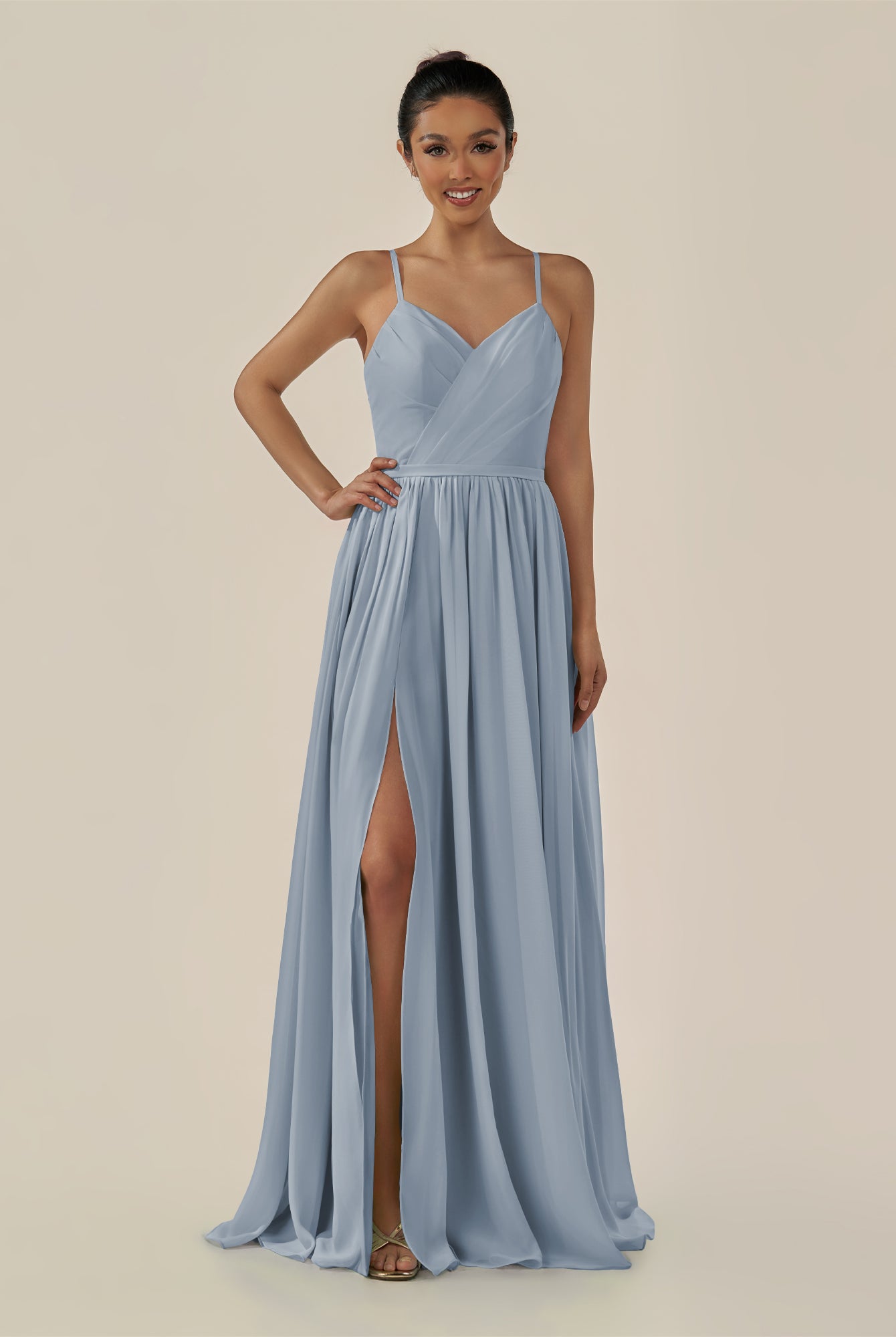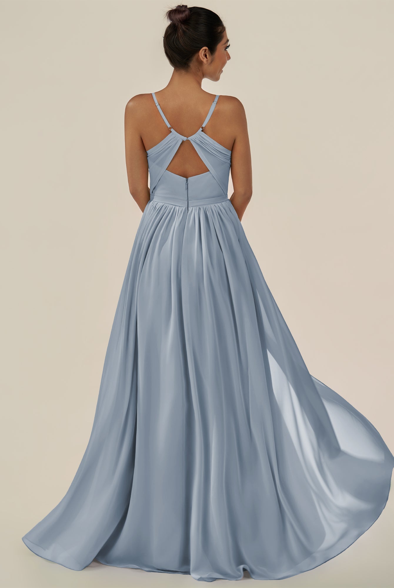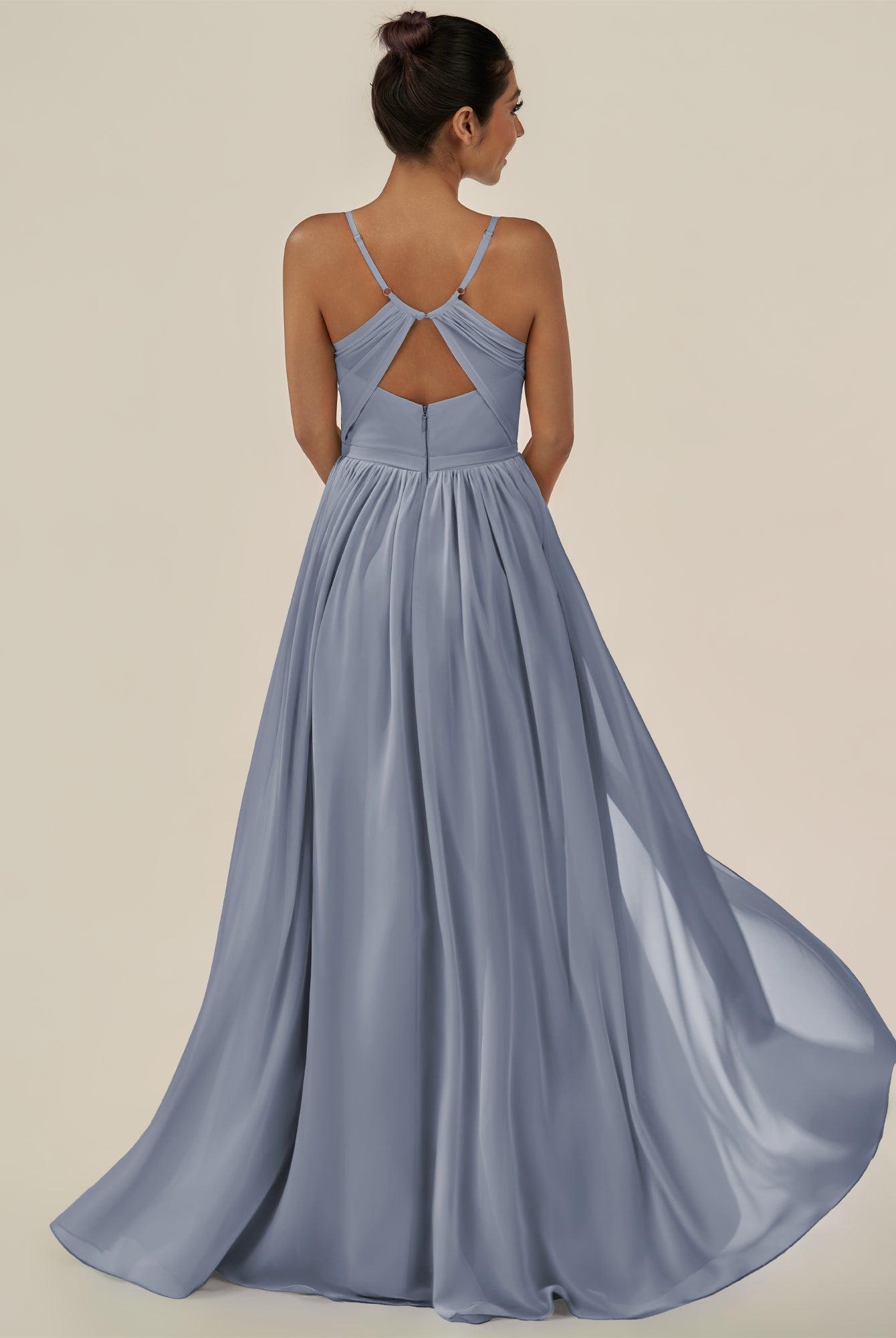 Irissa | Dusty Blue - A Line Chiffon V Neck Pleated Long Bridesmaid Dress with Slit