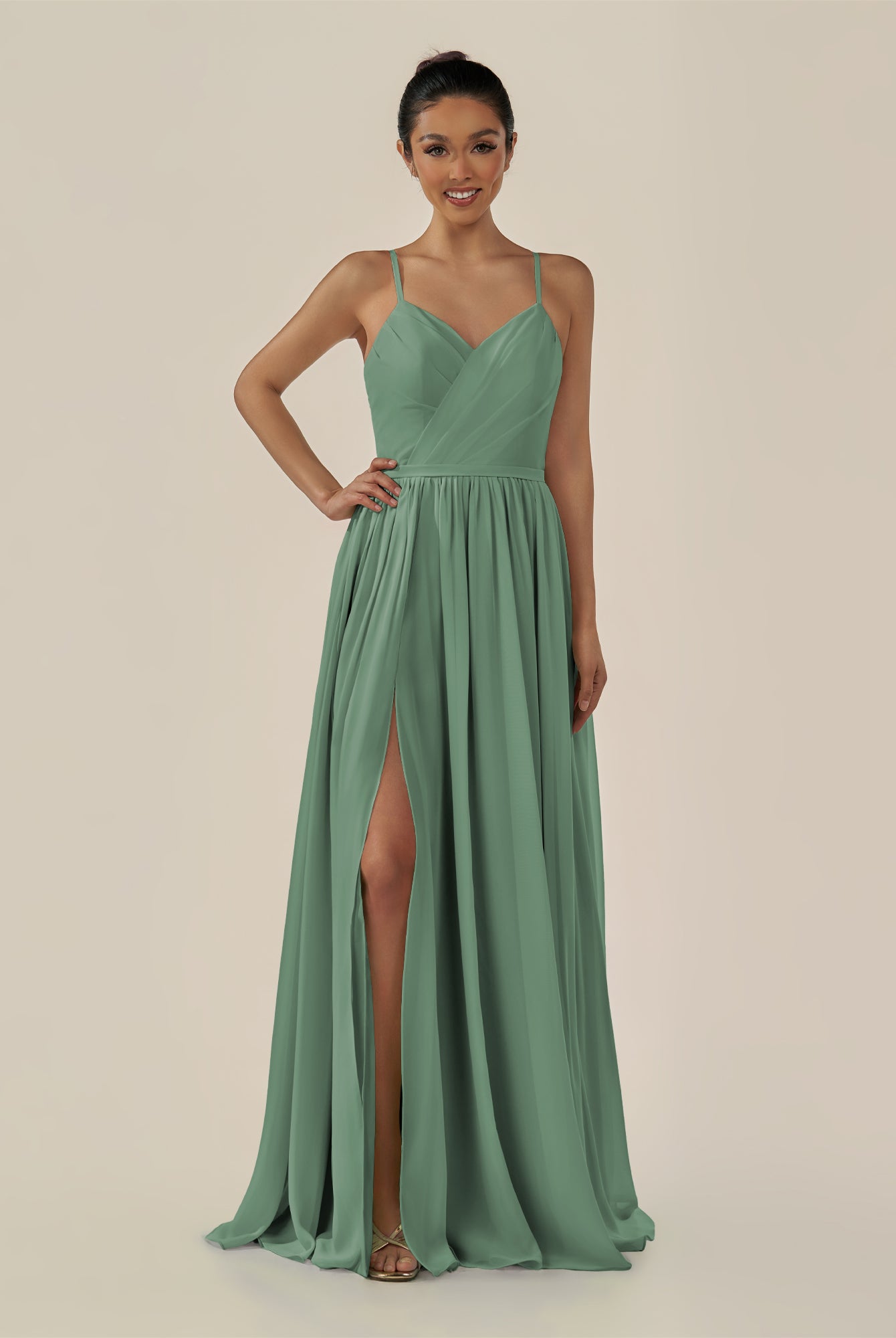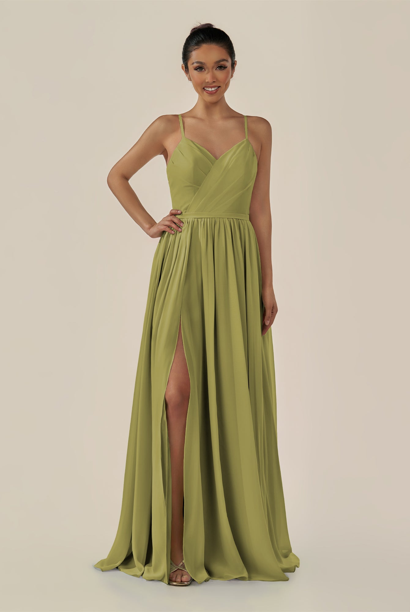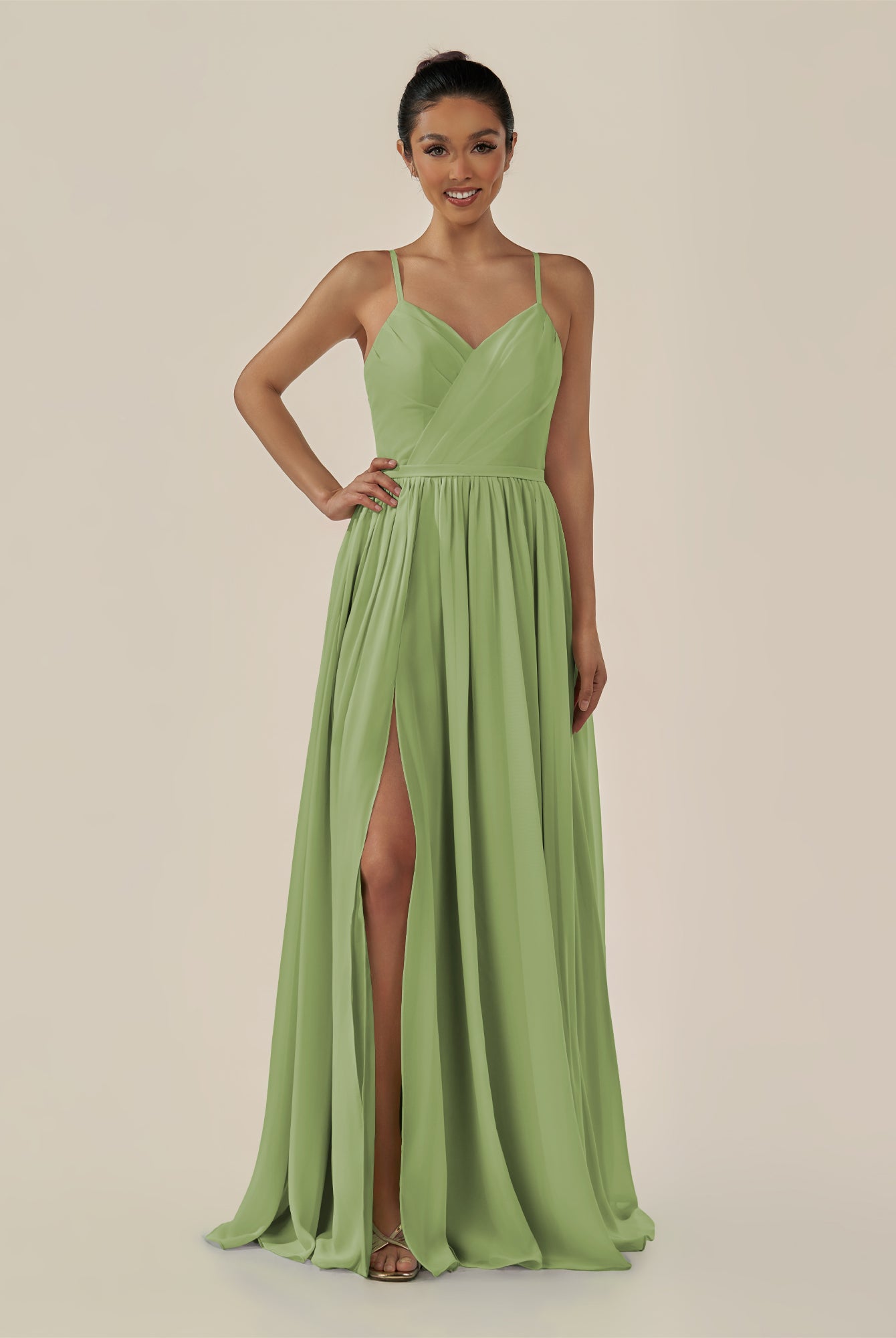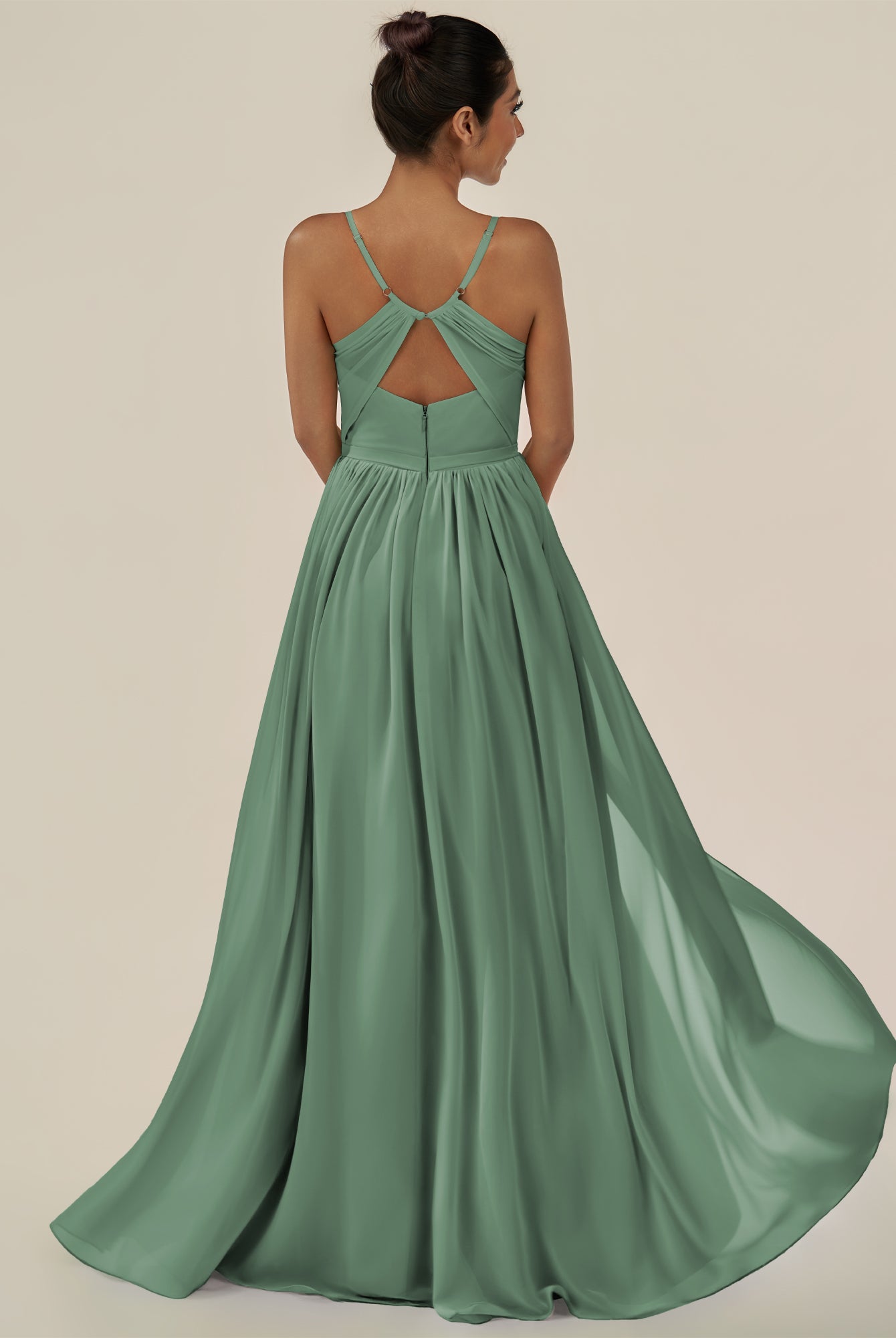 Irissa | Pine - A Line Chiffon V Neck Pleated Long Bridesmaid Dress with Slit