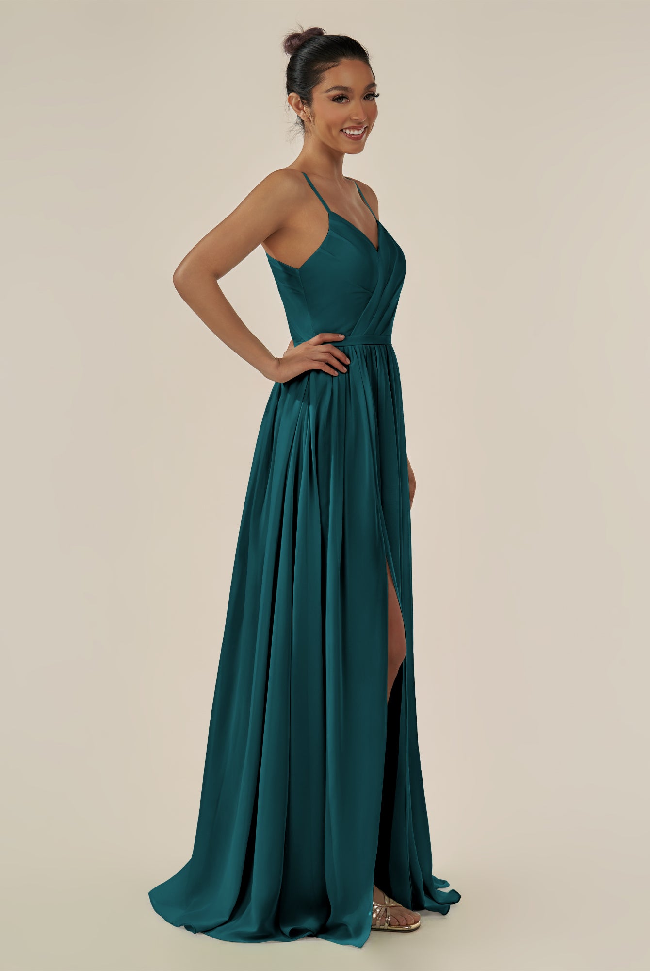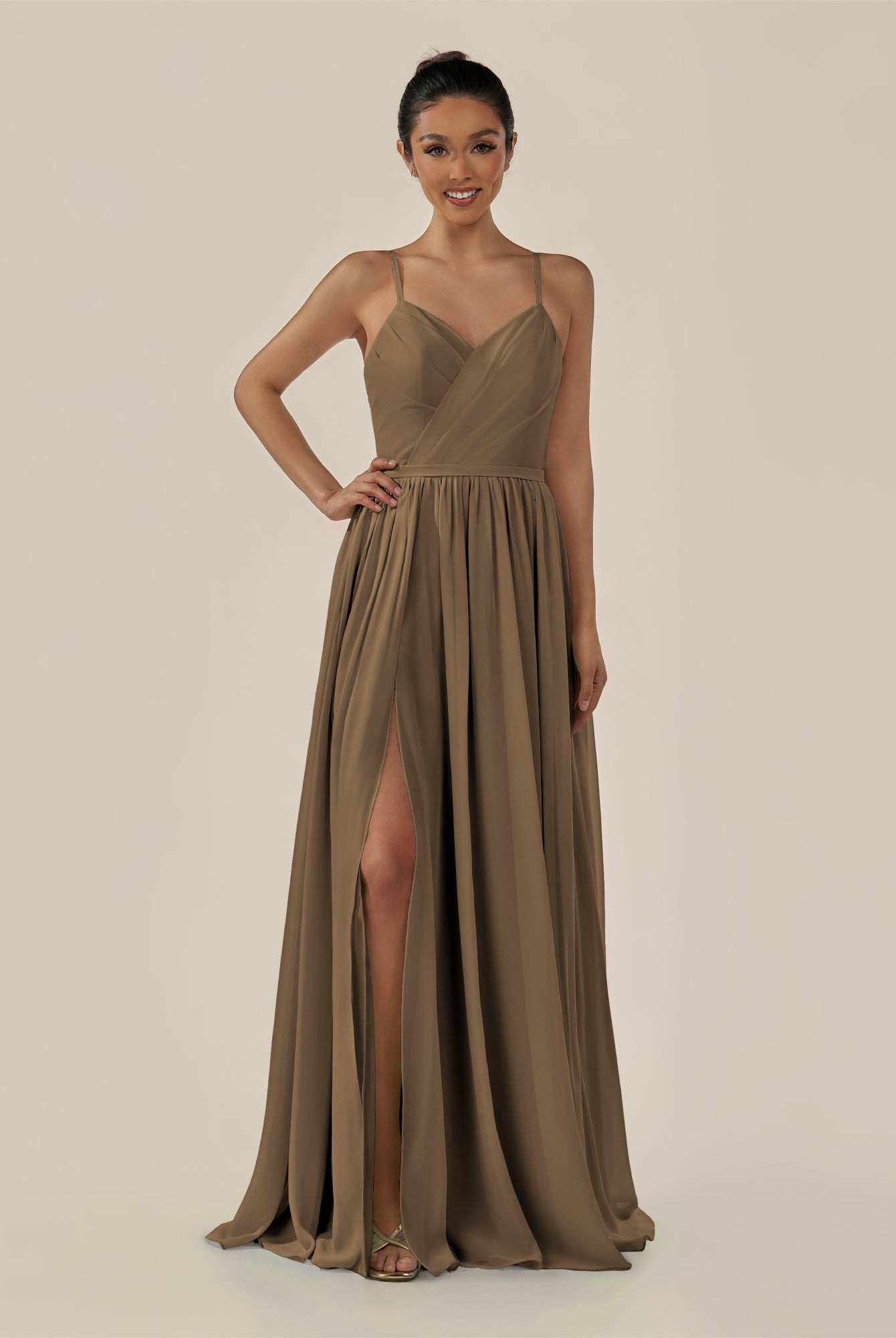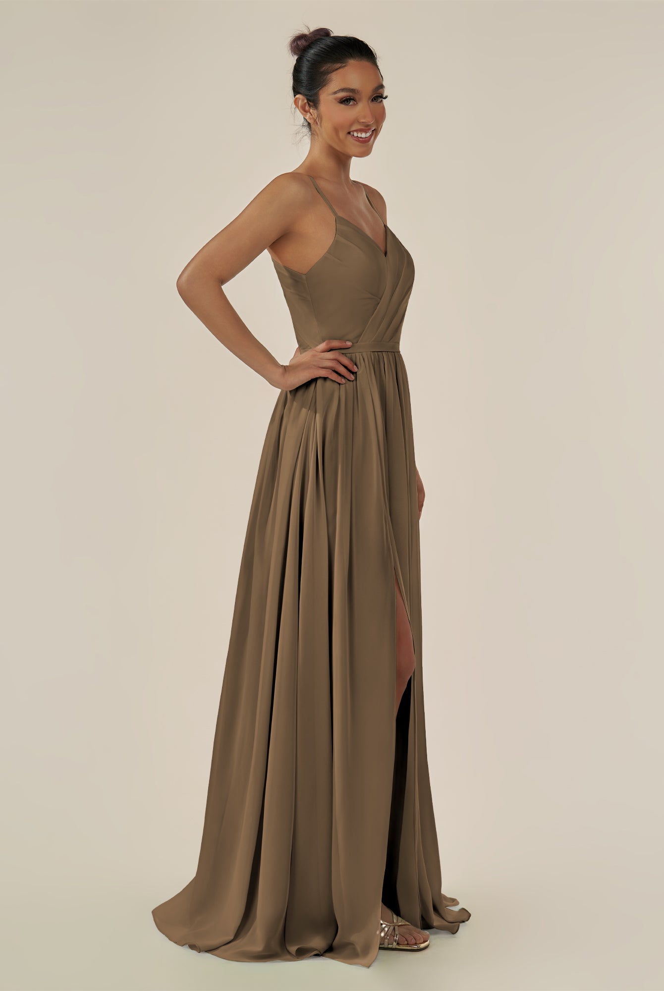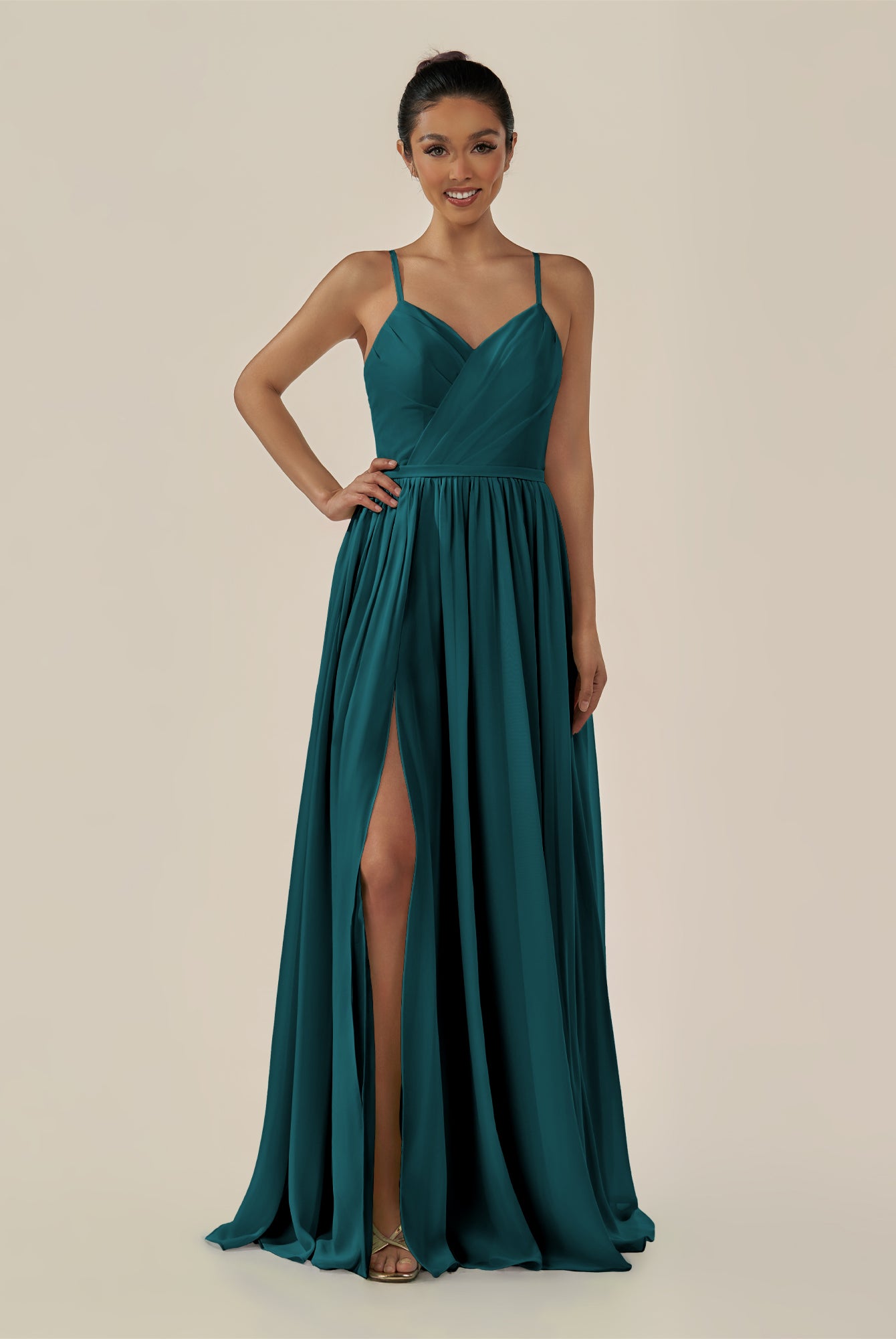 Irissa | Pine - A Line Chiffon V Neck Pleated Long Bridesmaid Dress with Slit