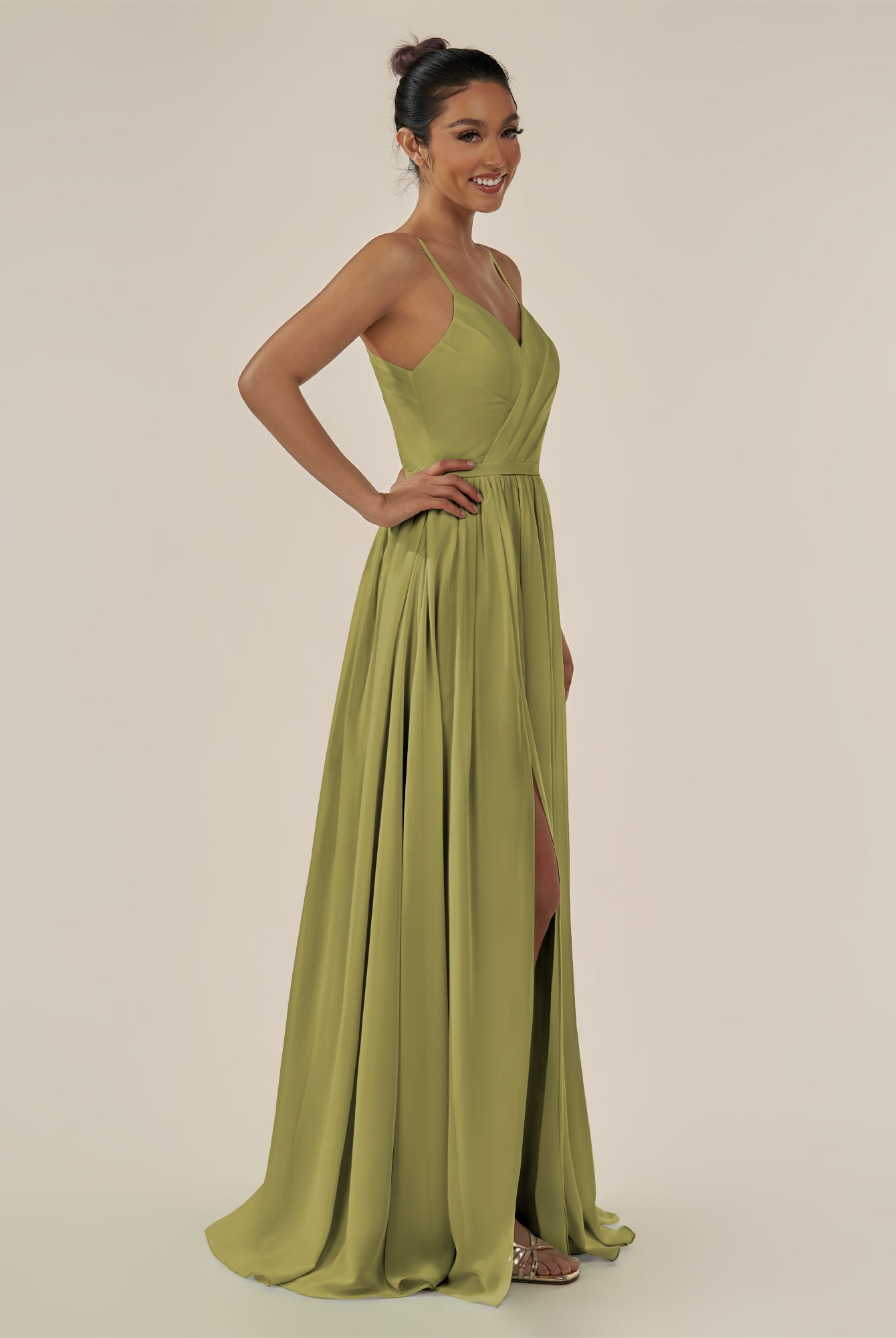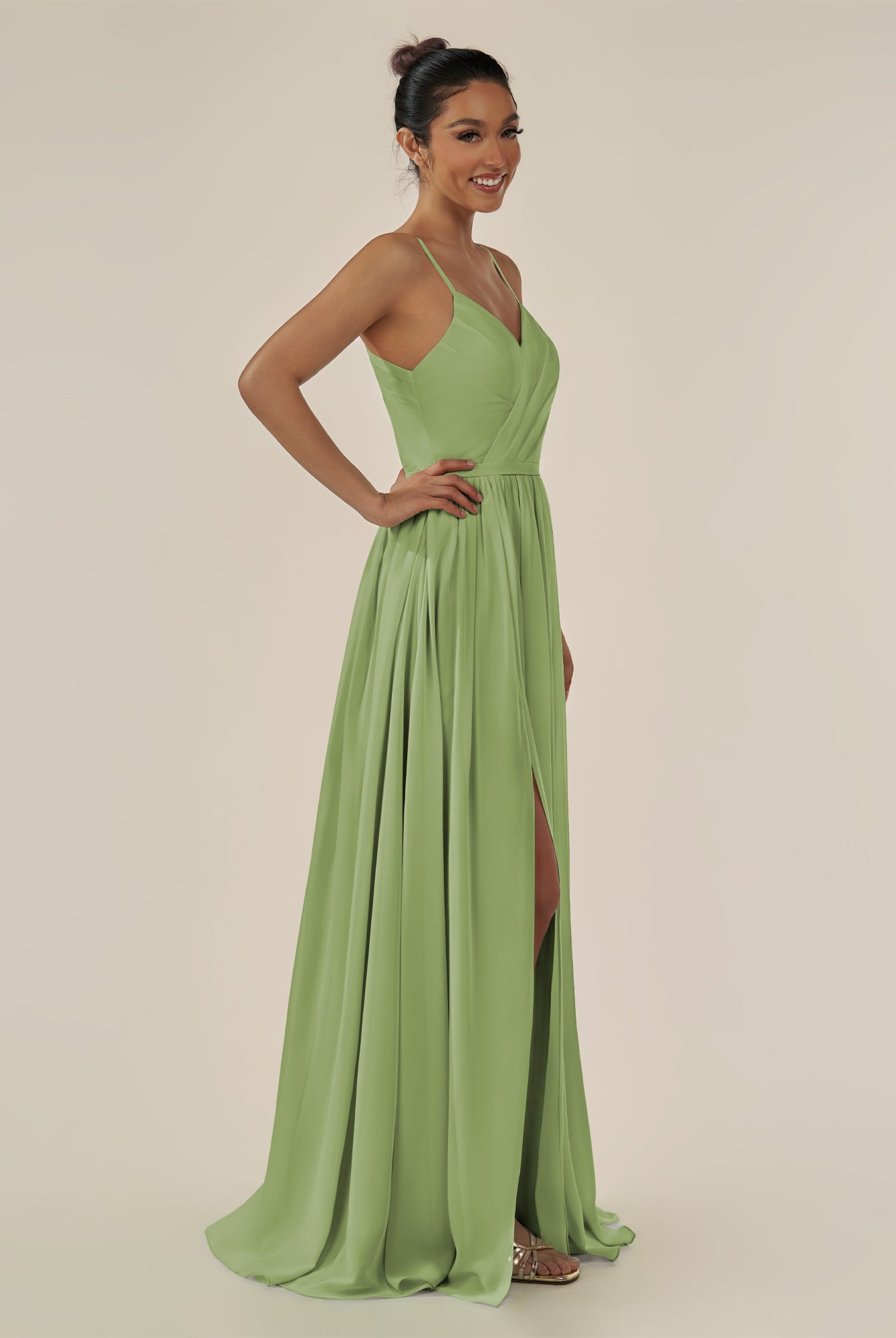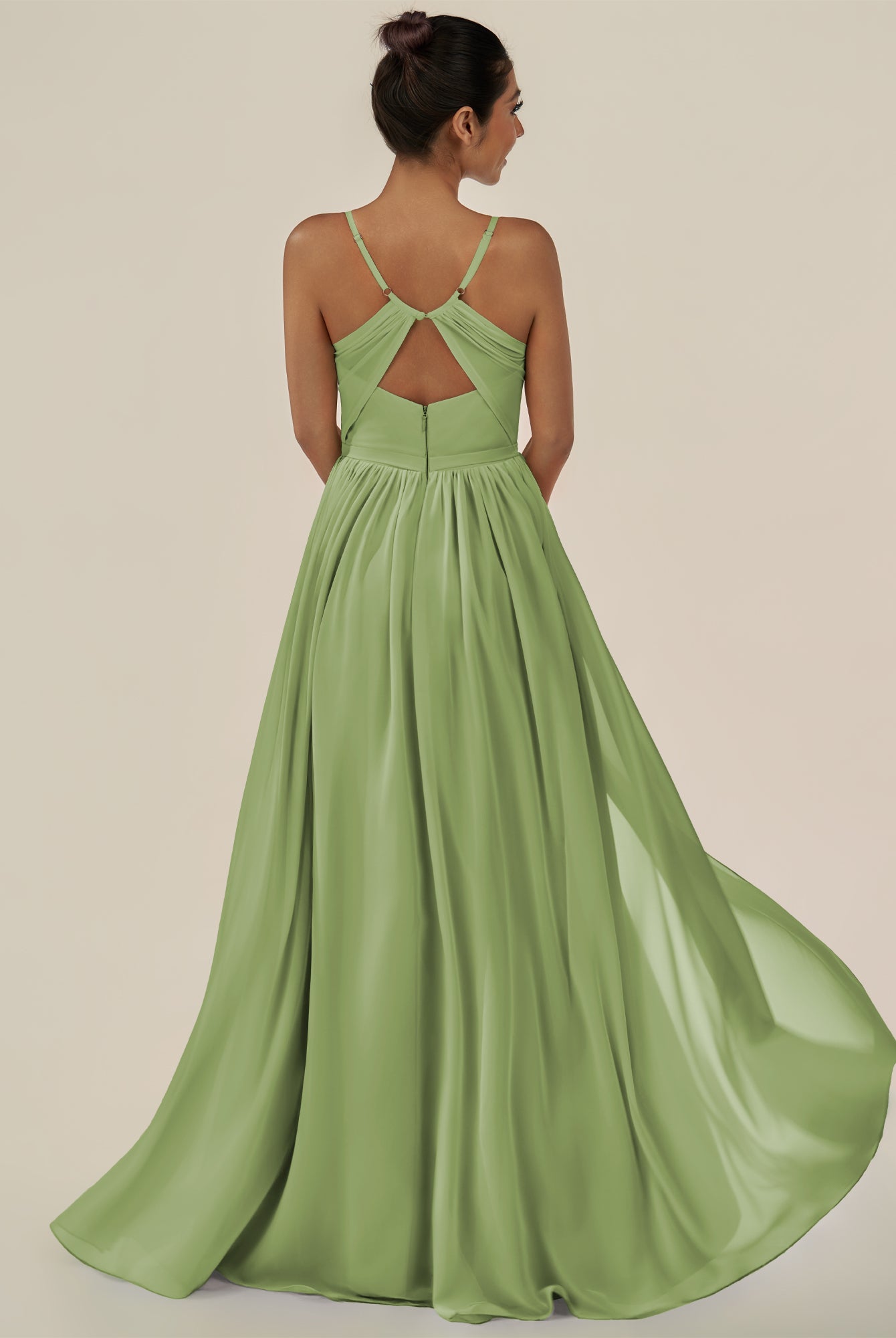 Irissa | Matcha - A Line Chiffon V Neck Pleated Long Bridesmaid Dress with Slit