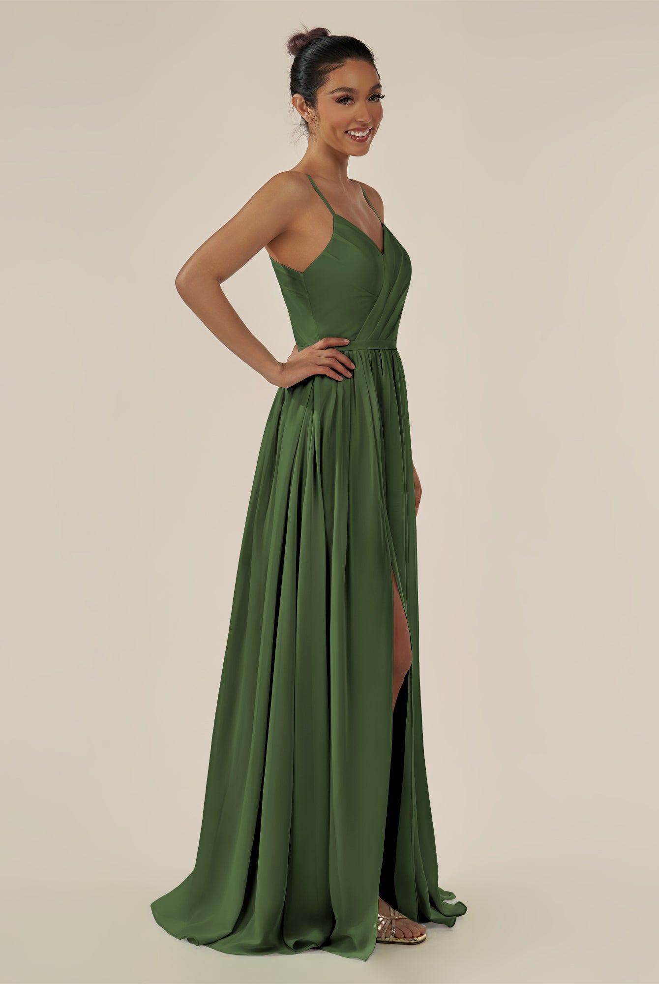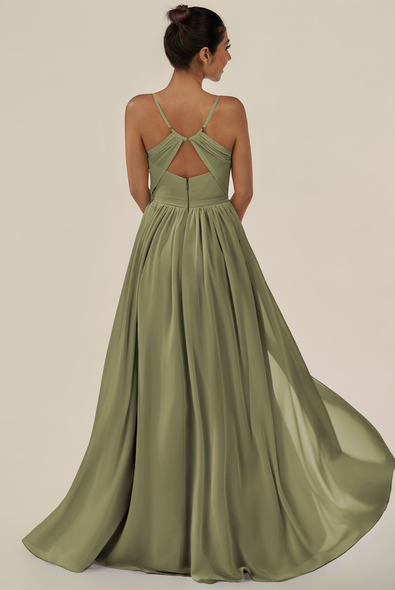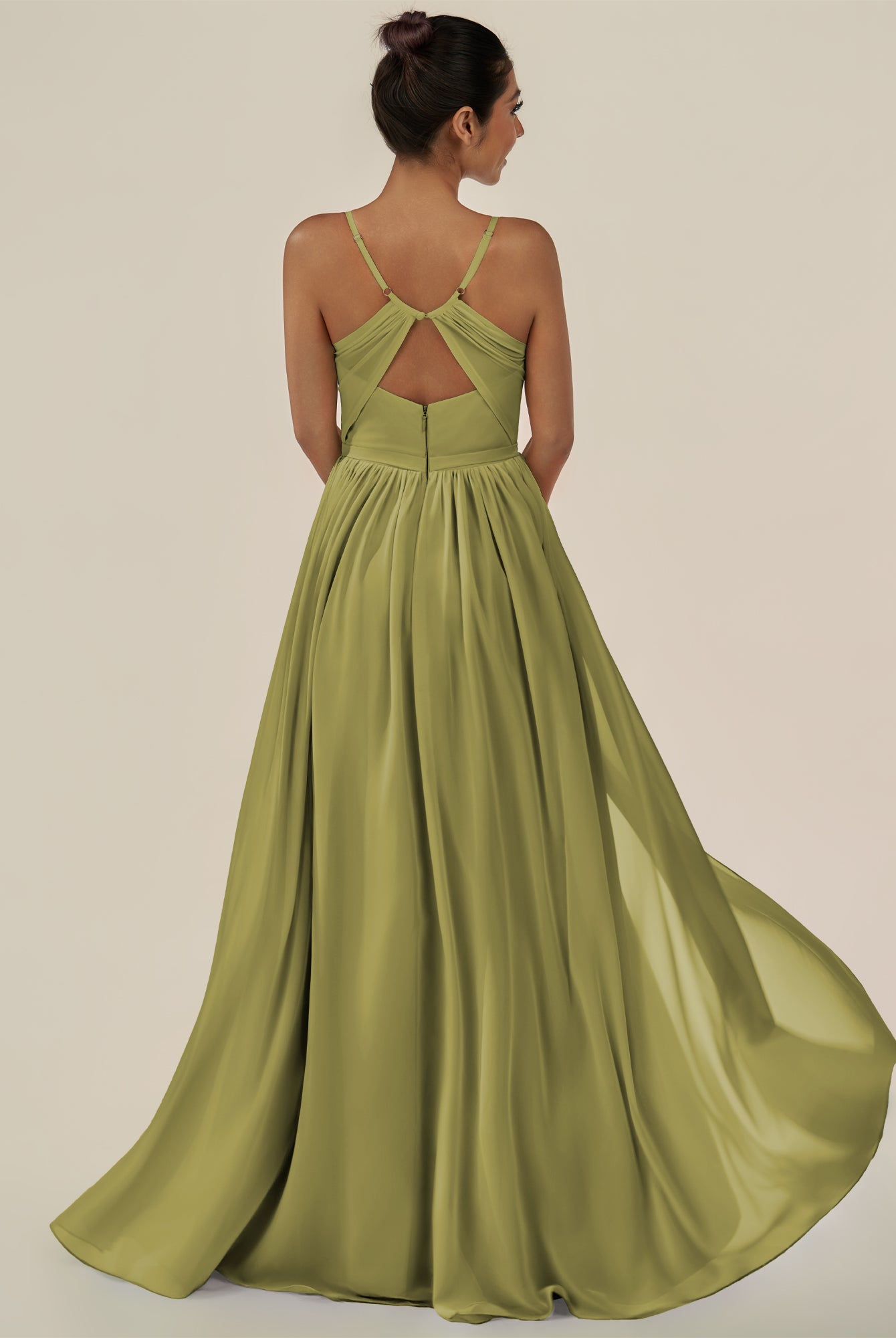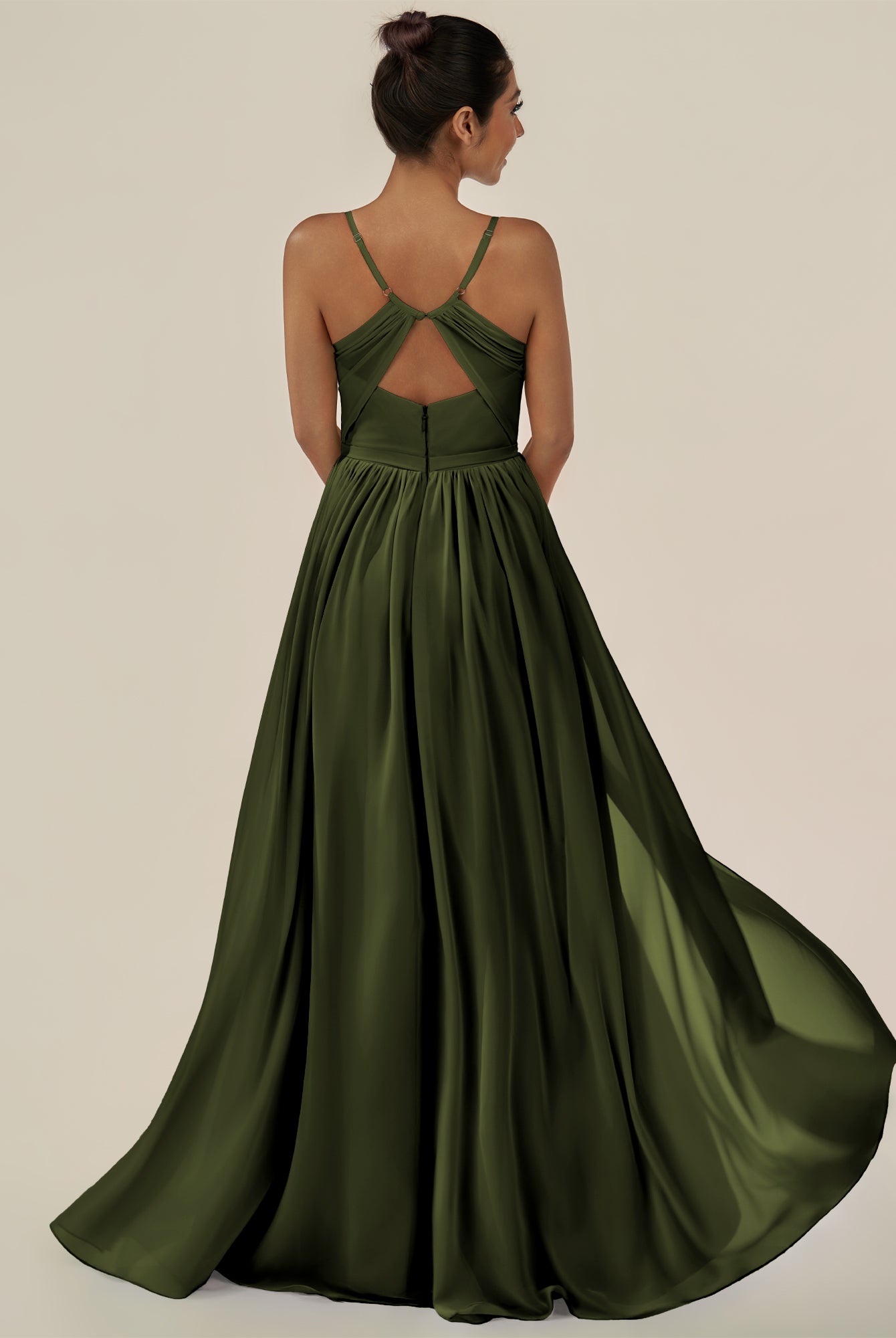 Irissa | Olive - A Line Chiffon V Neck Pleated Long Bridesmaid Dress with Slit