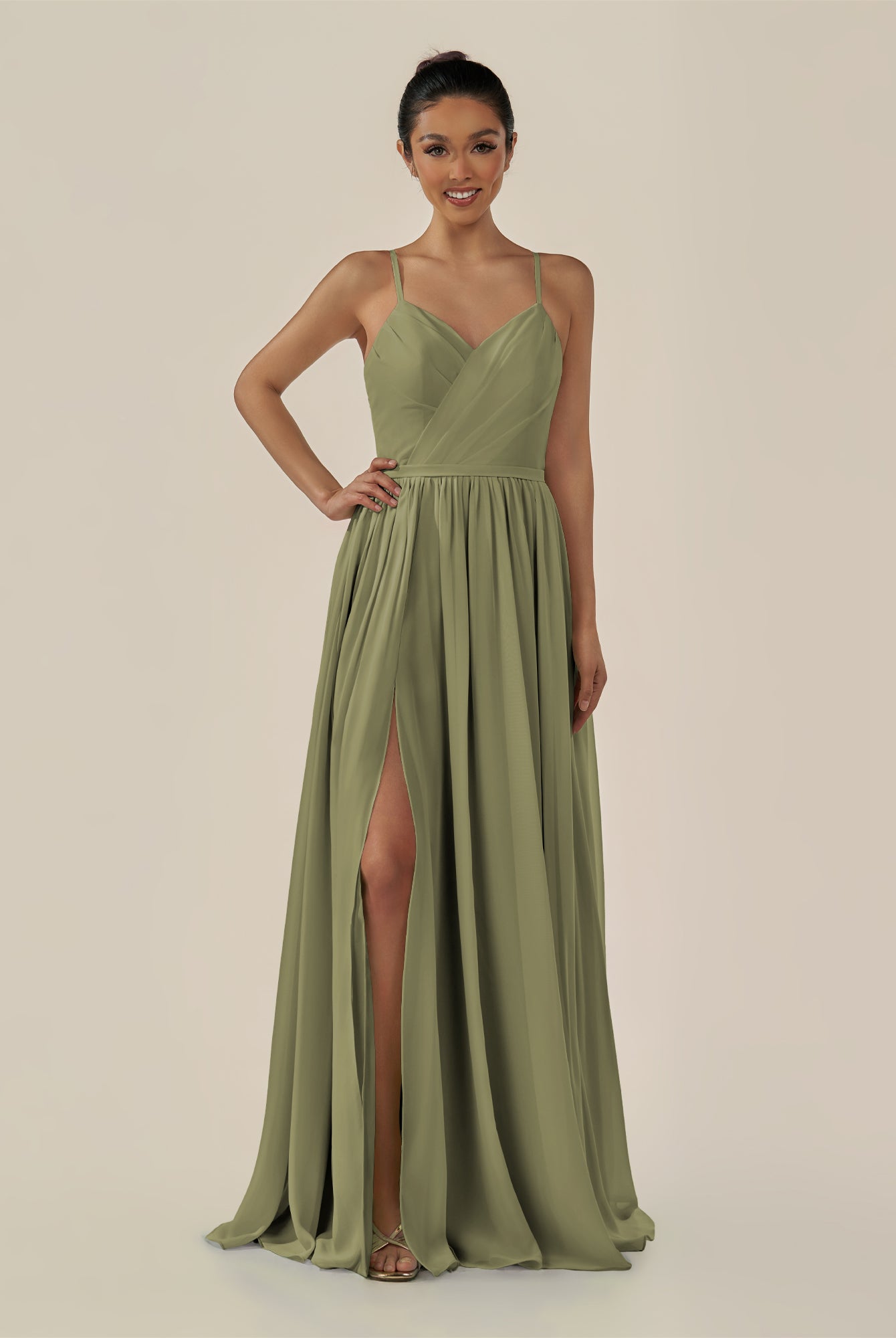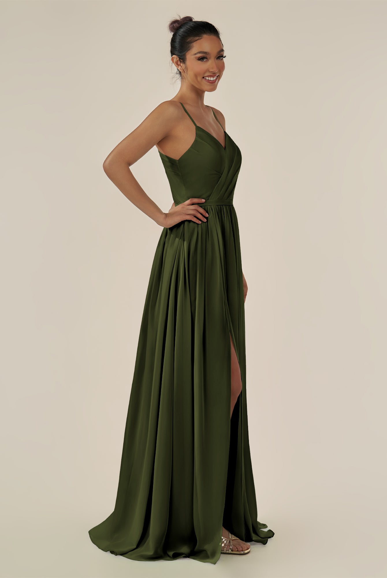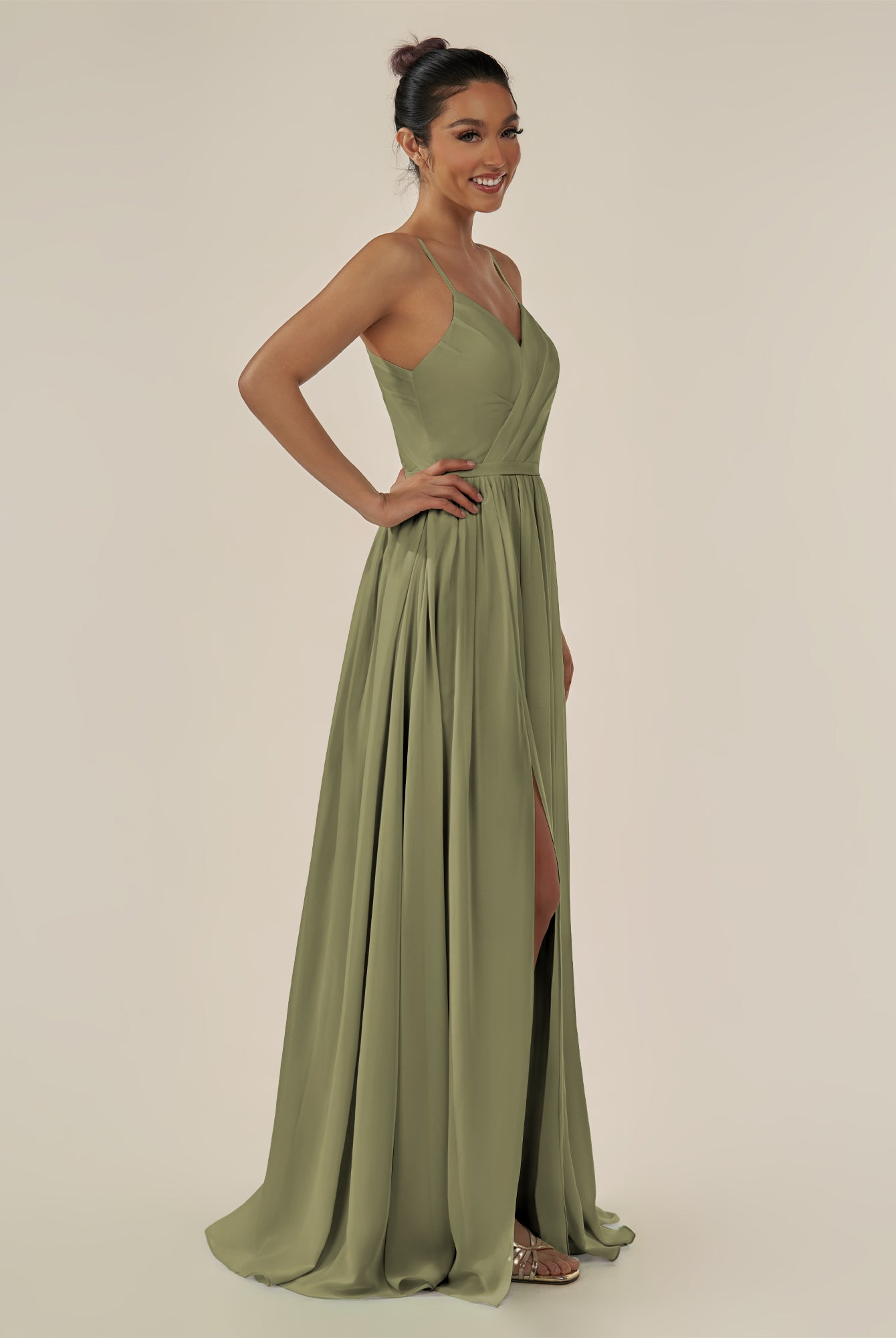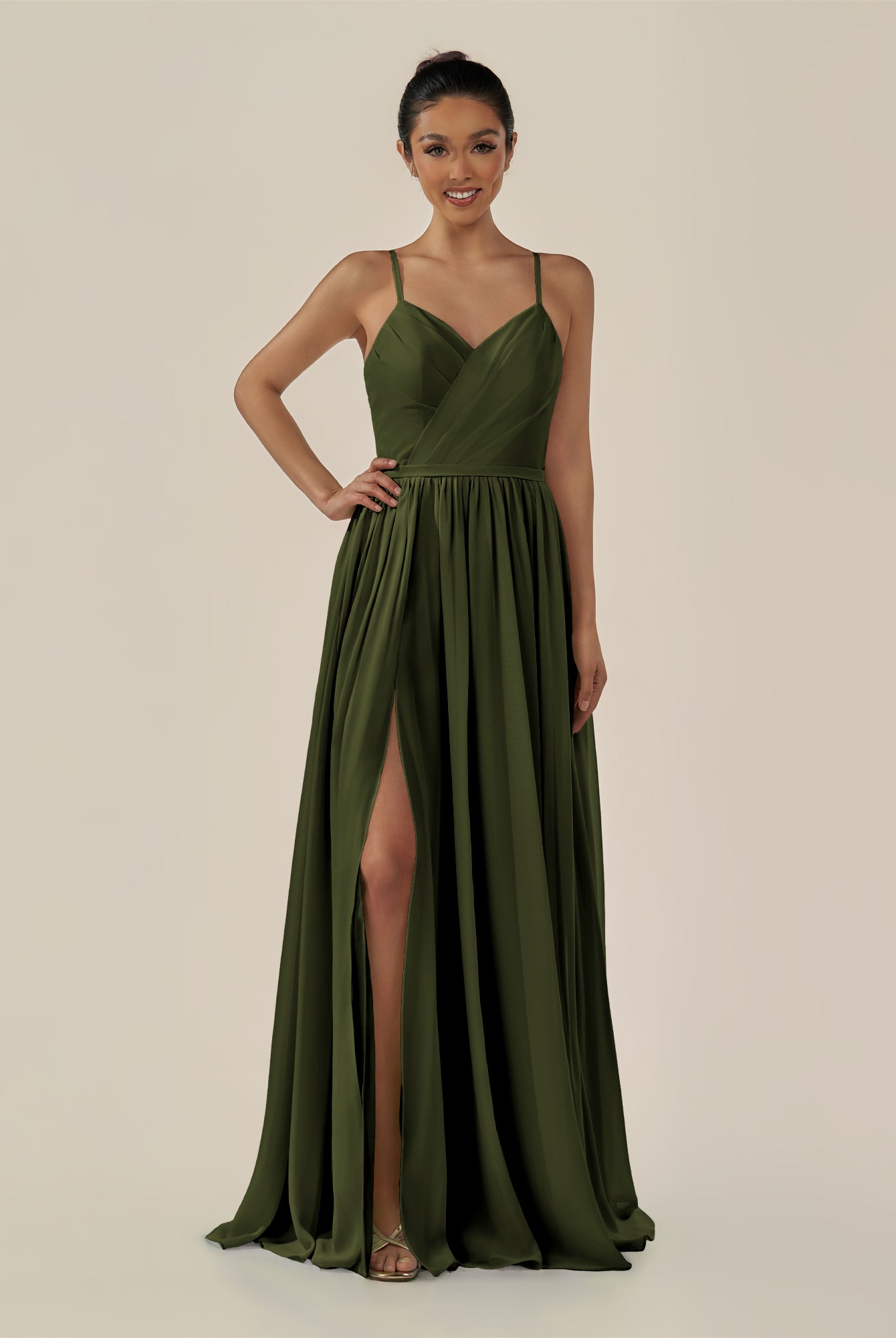Irissa | Olive - A Line Chiffon V Neck Pleated Long Bridesmaid Dress with Slit