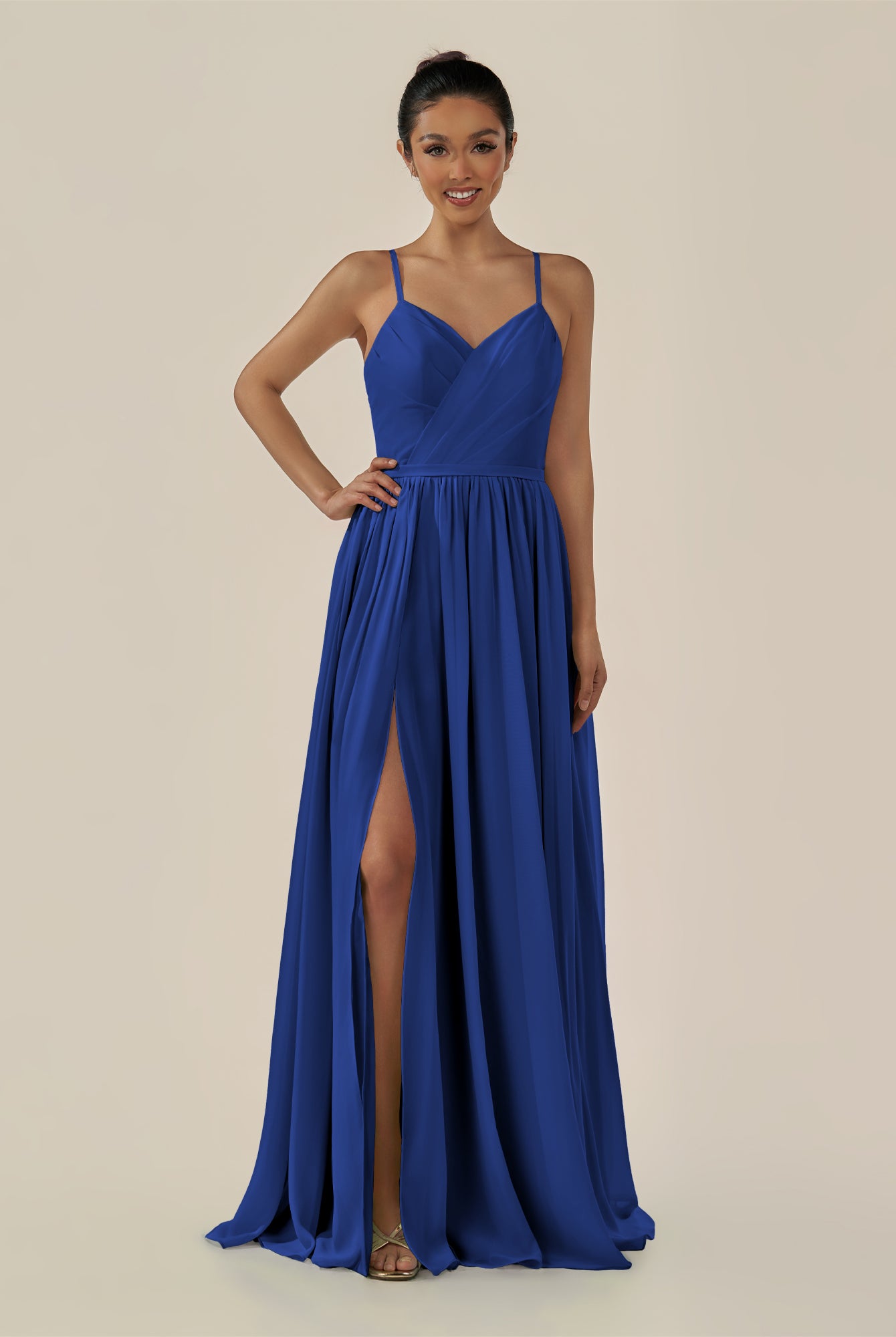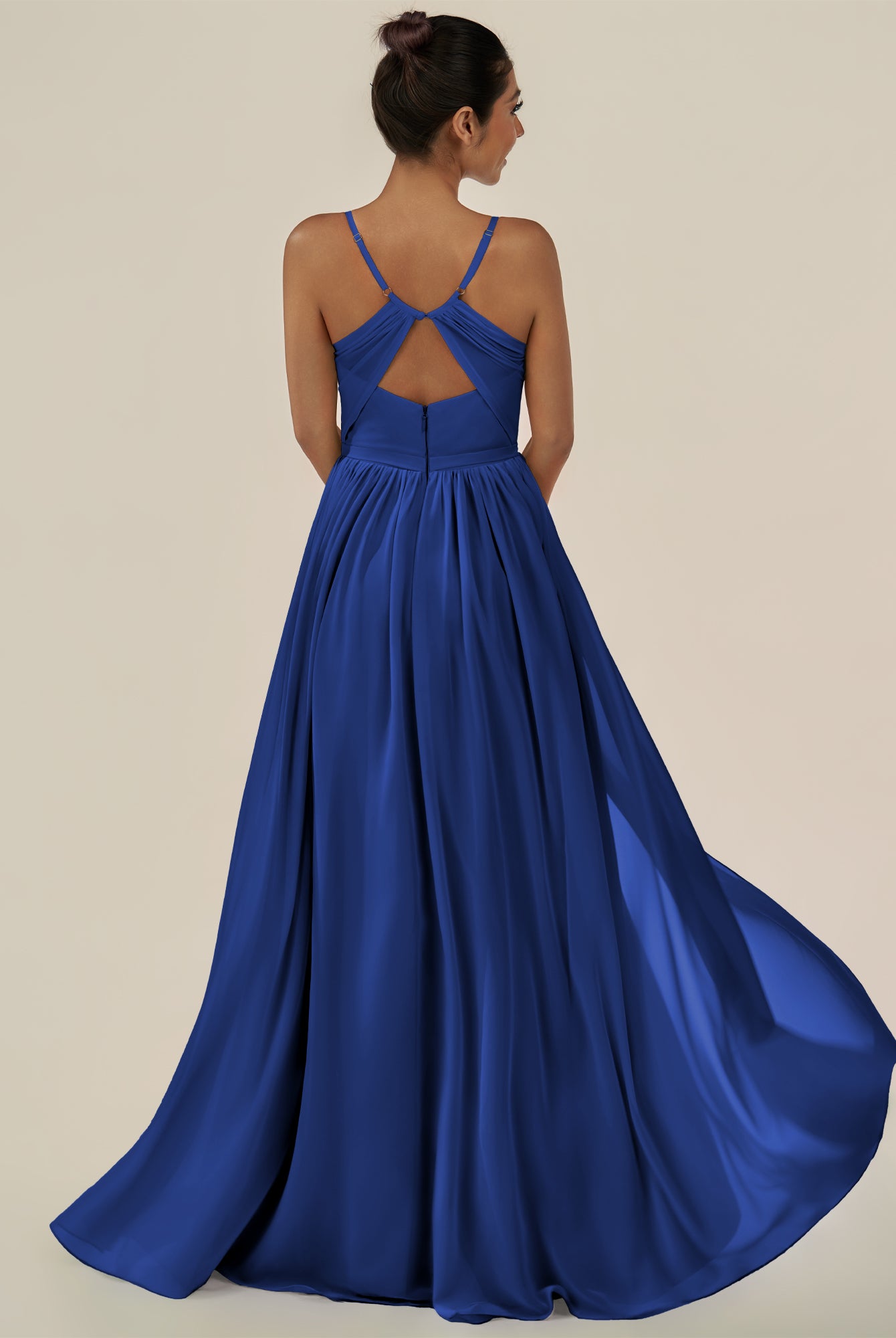 Irissa | Royal Blue - A Line Chiffon V Neck Pleated Long Bridesmaid Dress with Slit