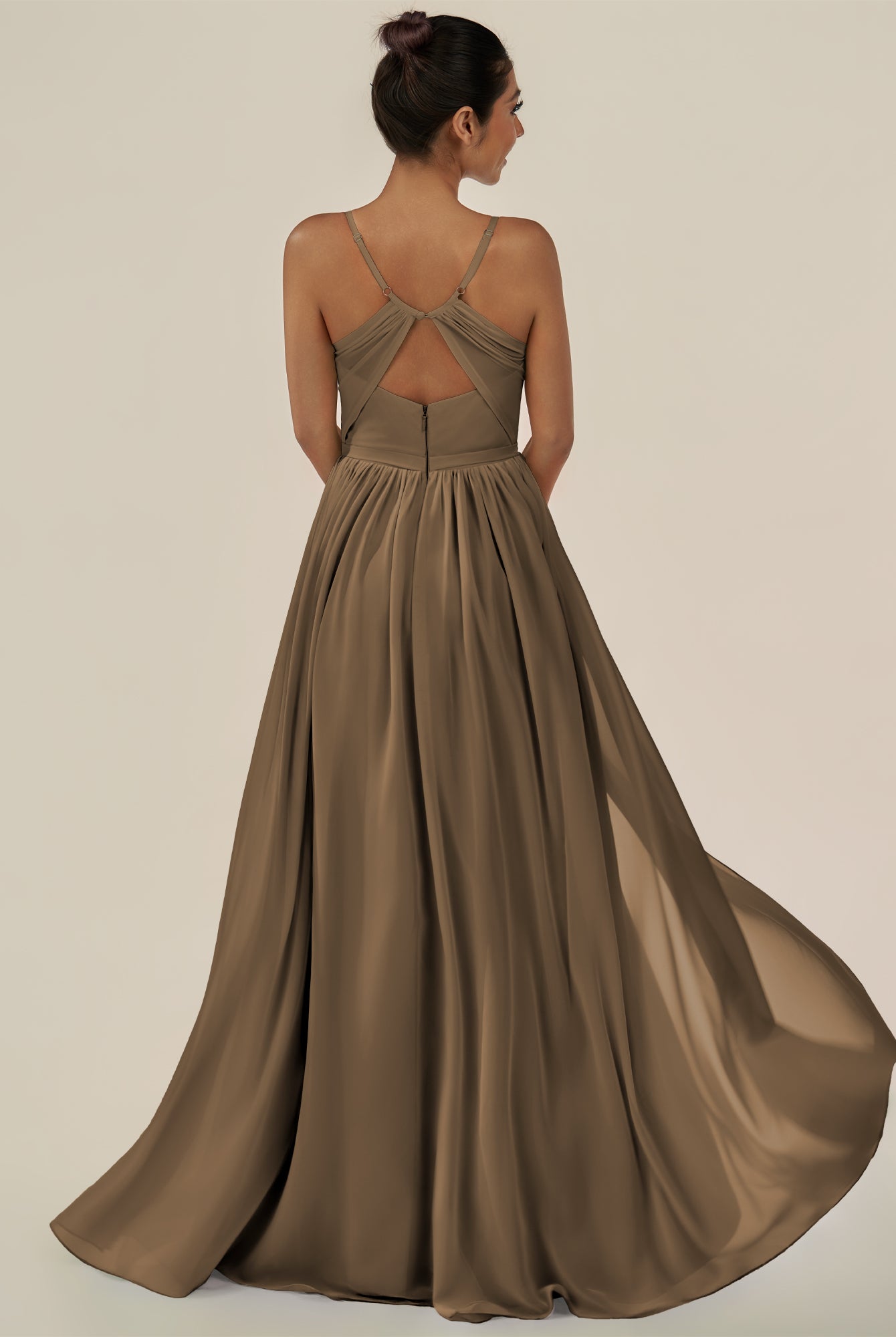 Irissa | Thyme - A Line Chiffon V Neck Pleated Long Bridesmaid Dress with Slit