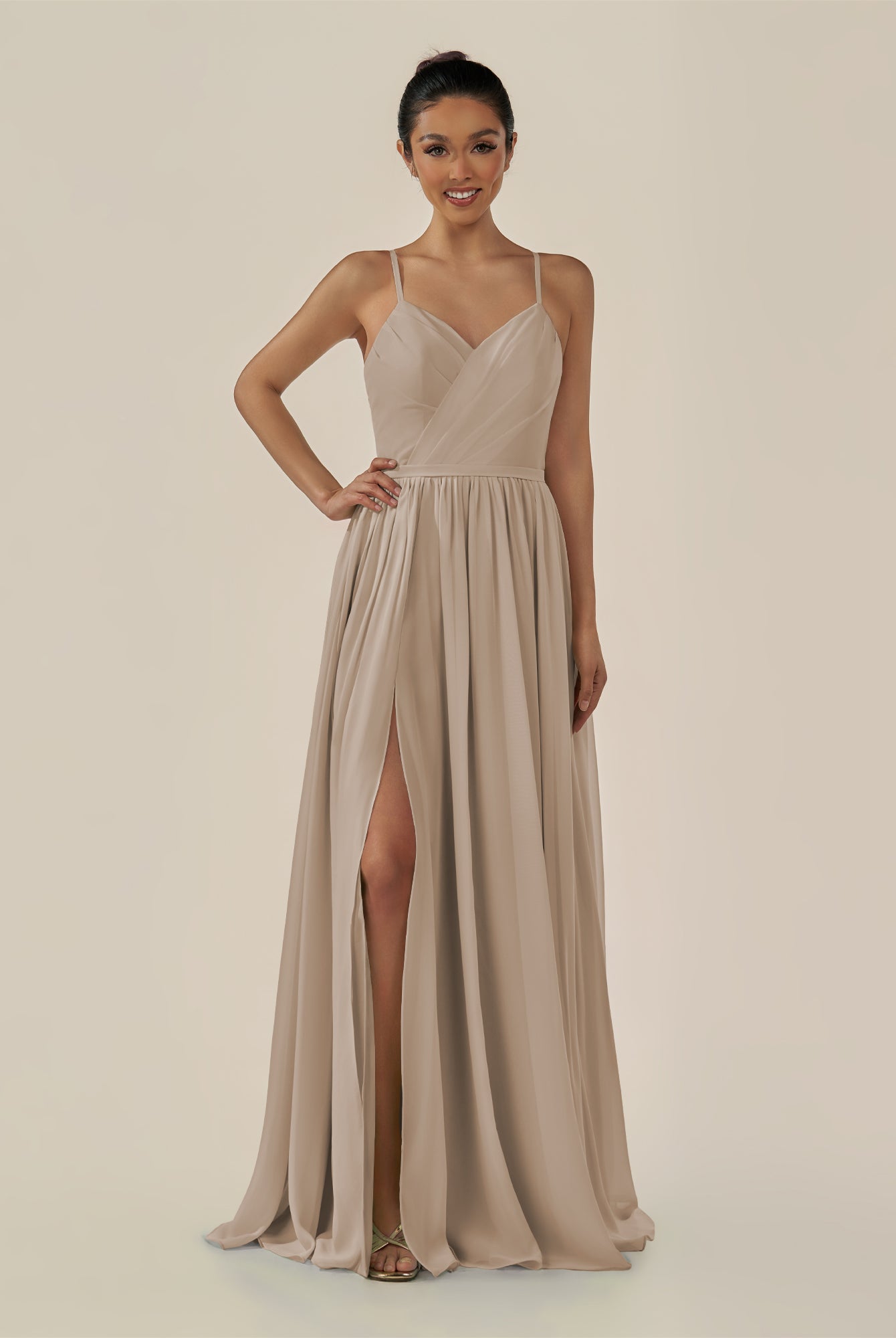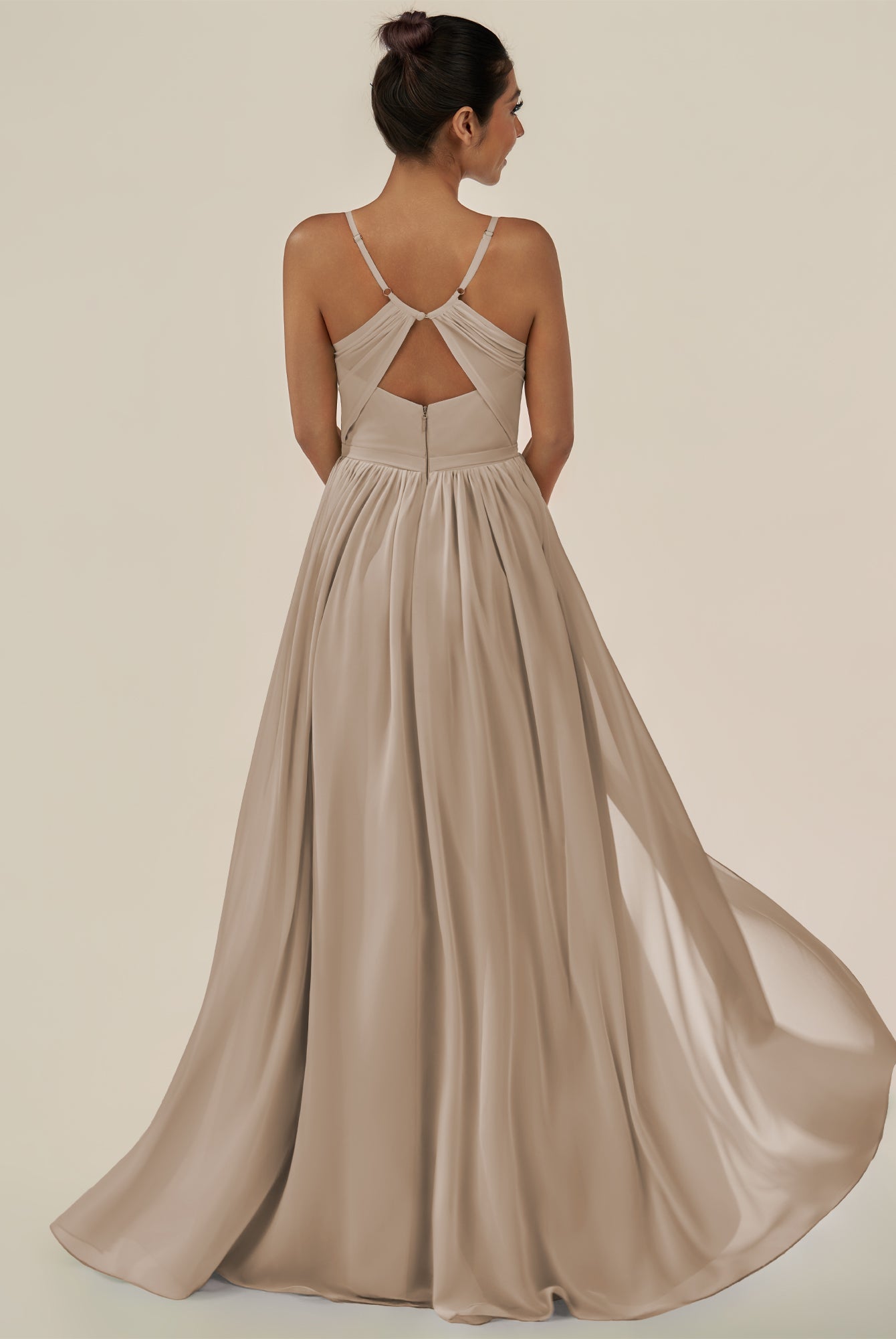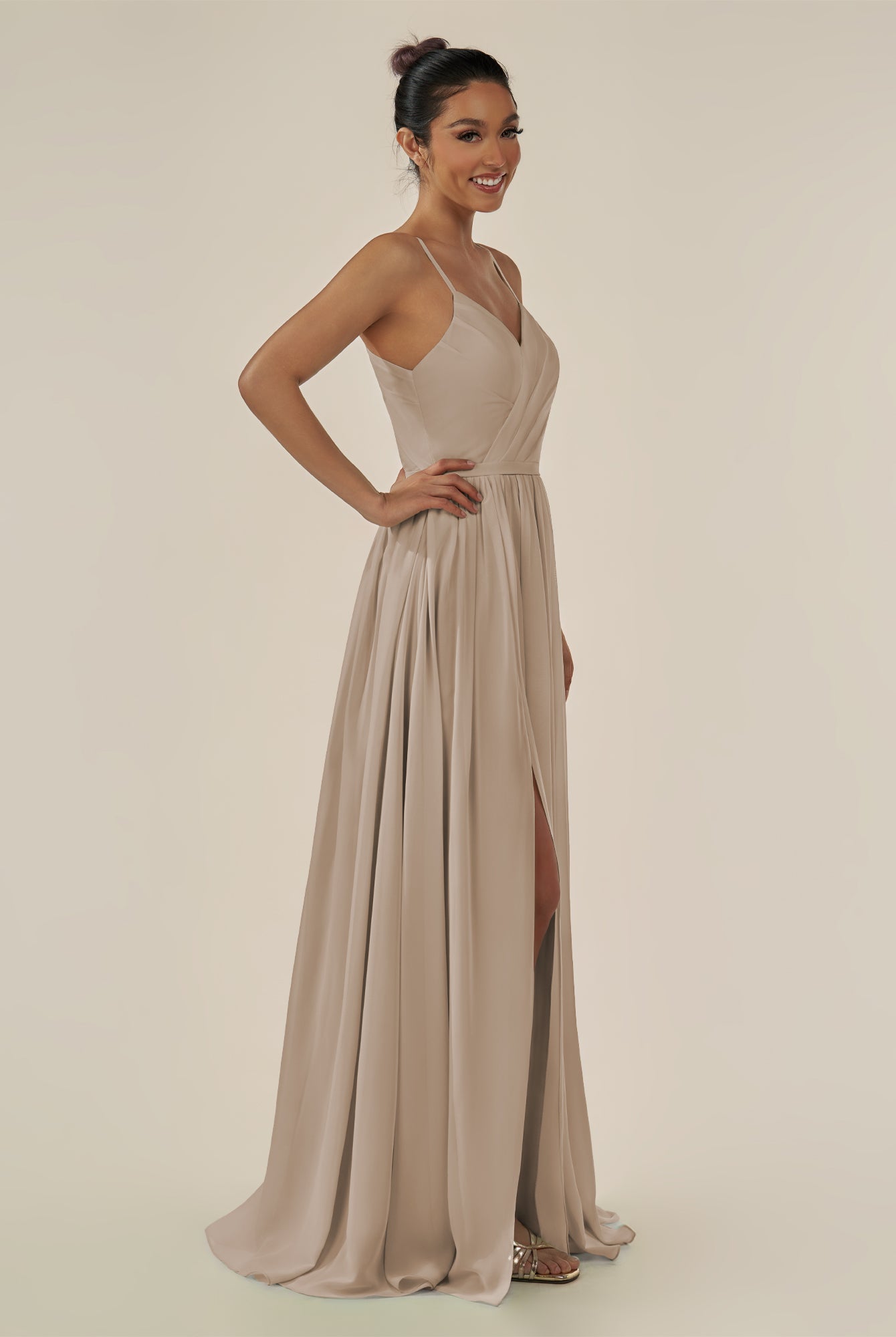 Irissa | Almond - A Line Chiffon V Neck Pleated Long Bridesmaid Dress with Slit