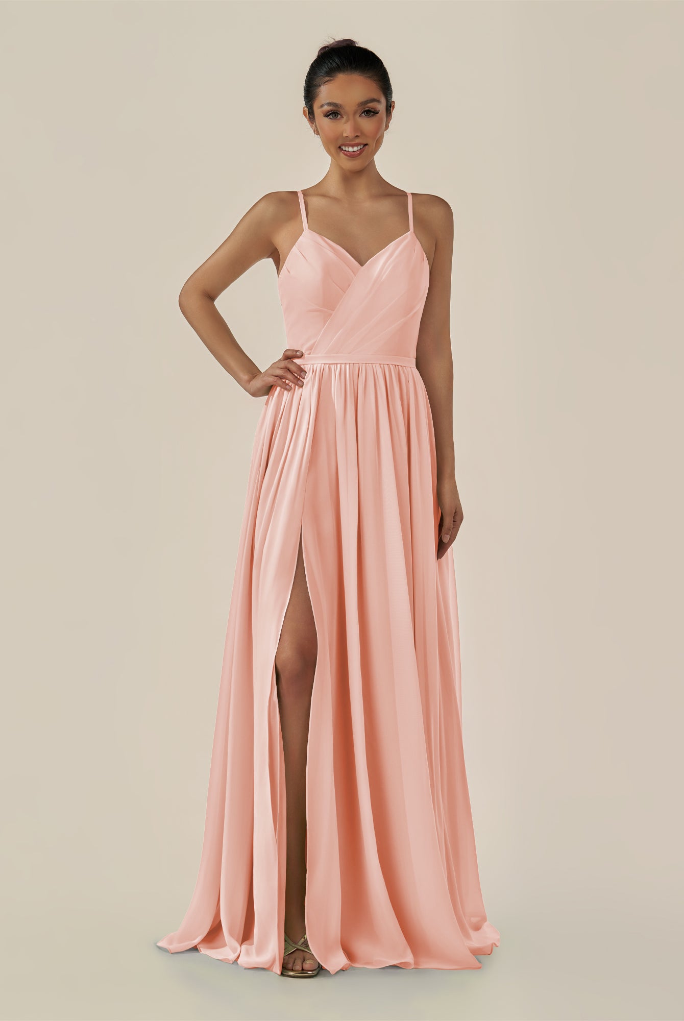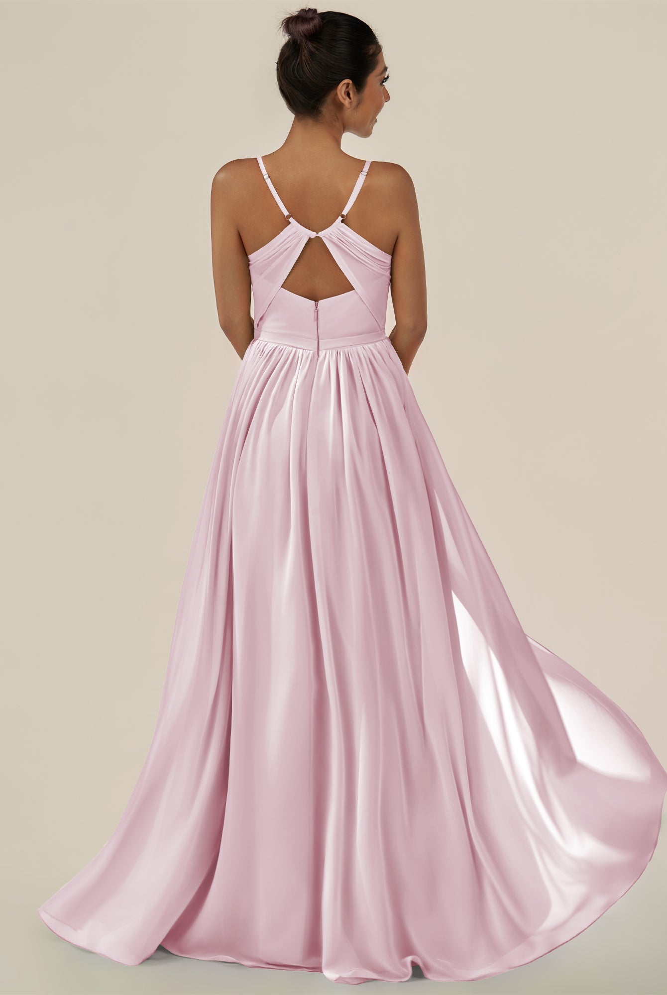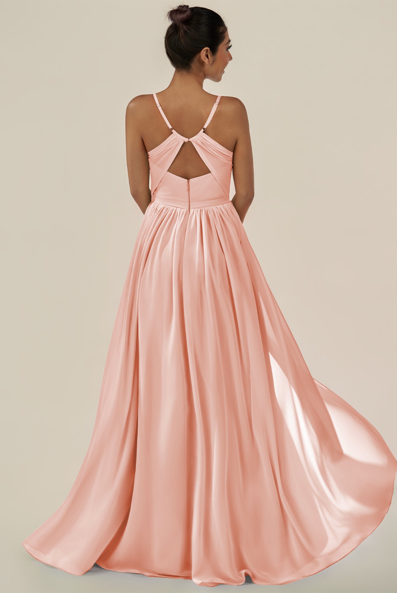 Irissa | Rose Petal - A Line Chiffon V Neck Pleated Long Bridesmaid Dress with Slit