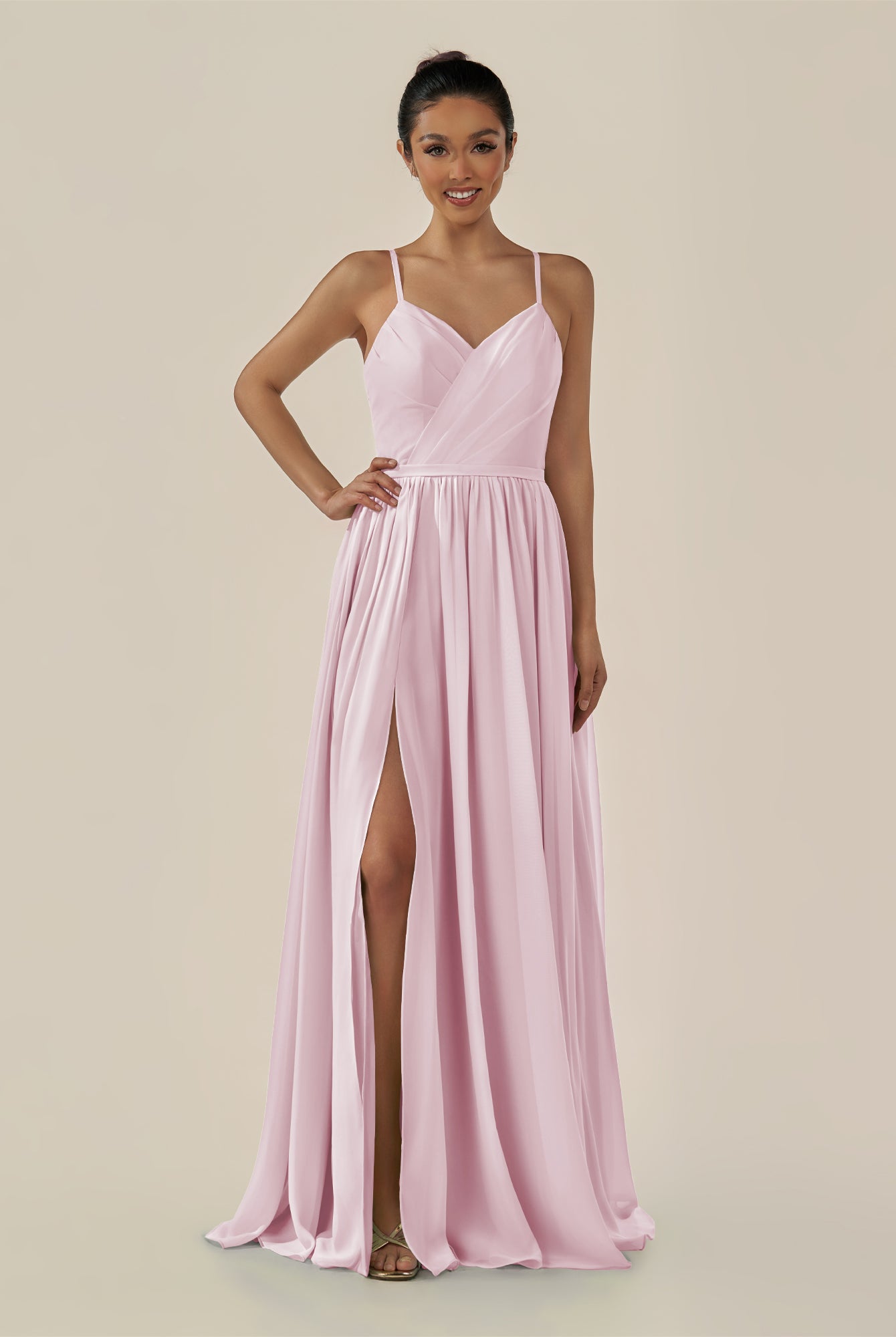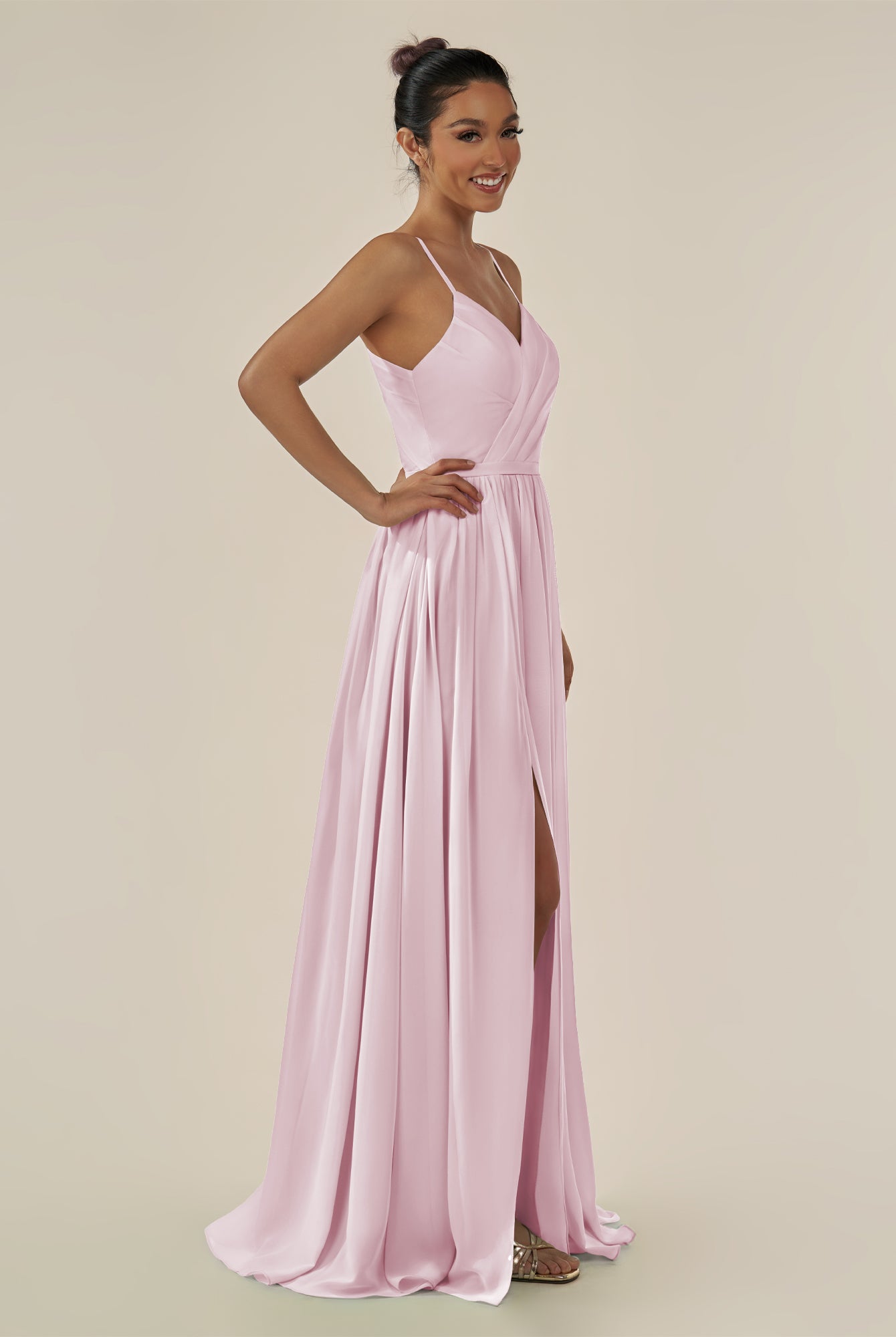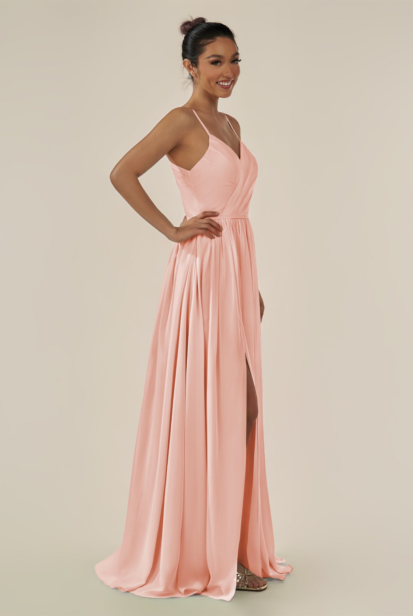 Irissa | Rose Petal - A Line Chiffon V Neck Pleated Long Bridesmaid Dress with Slit