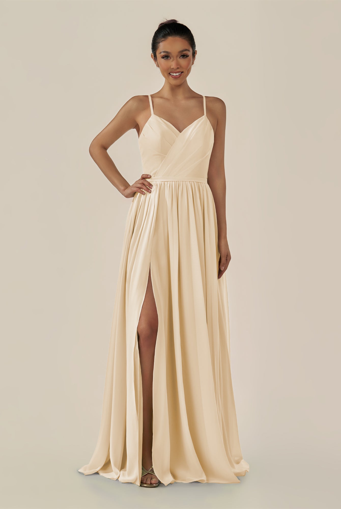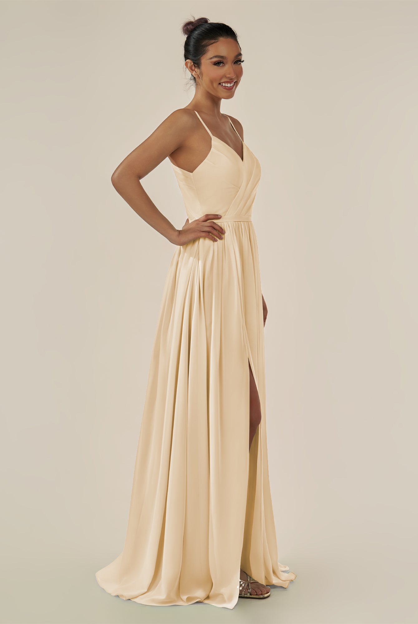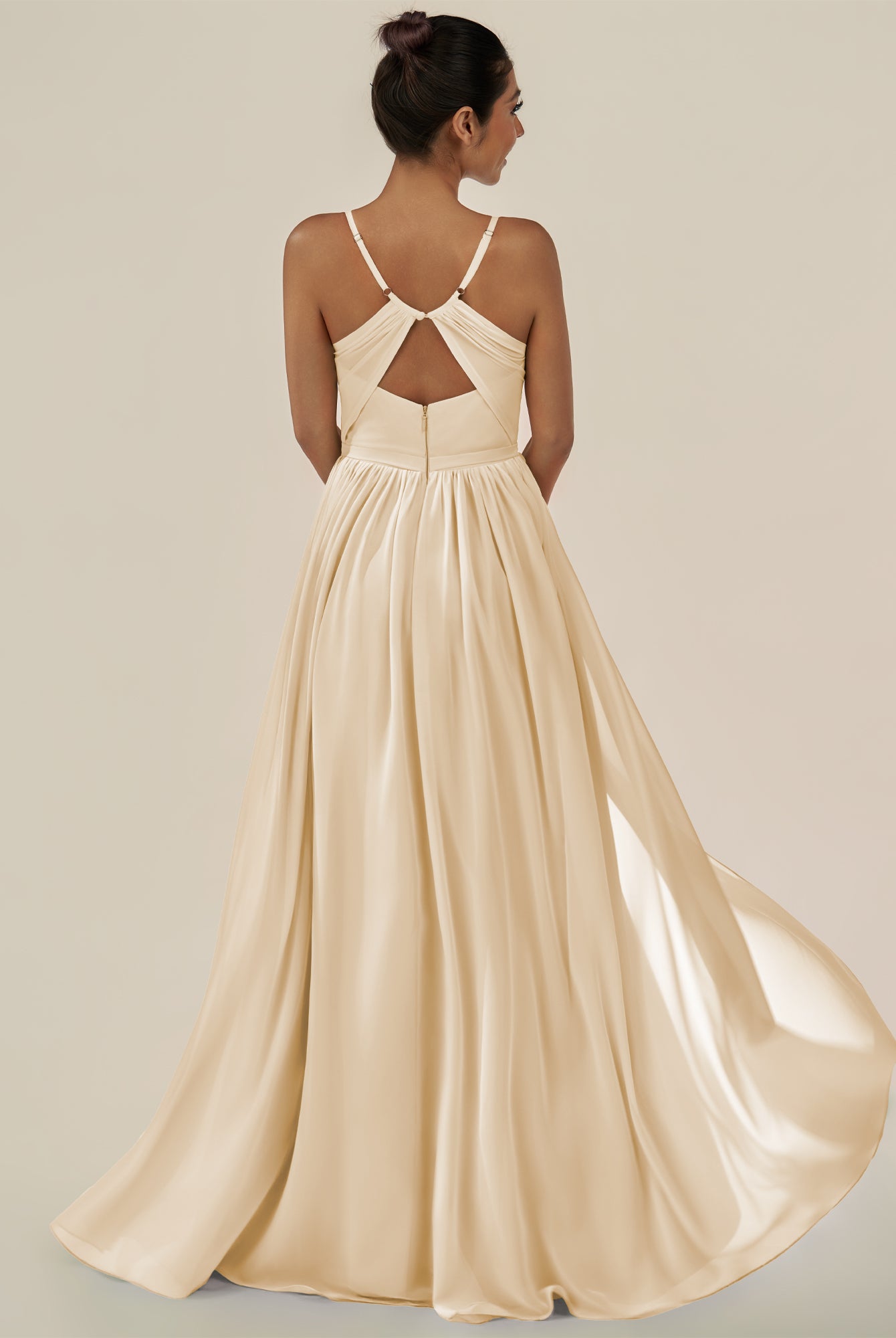 Irissa | Champagne - A Line Chiffon V Neck Pleated Long Bridesmaid Dress with Slit