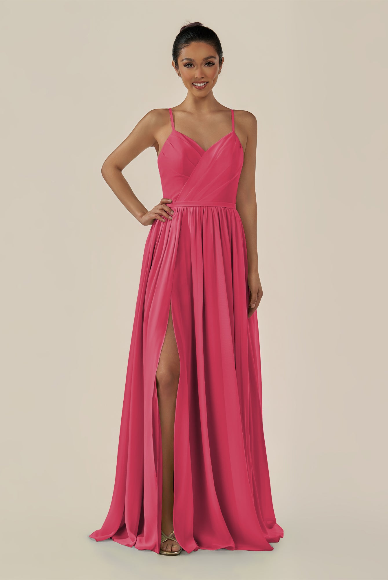 Irissa | Candy Pink - A Line Chiffon V Neck Pleated Long Bridesmaid Dress with Slit
